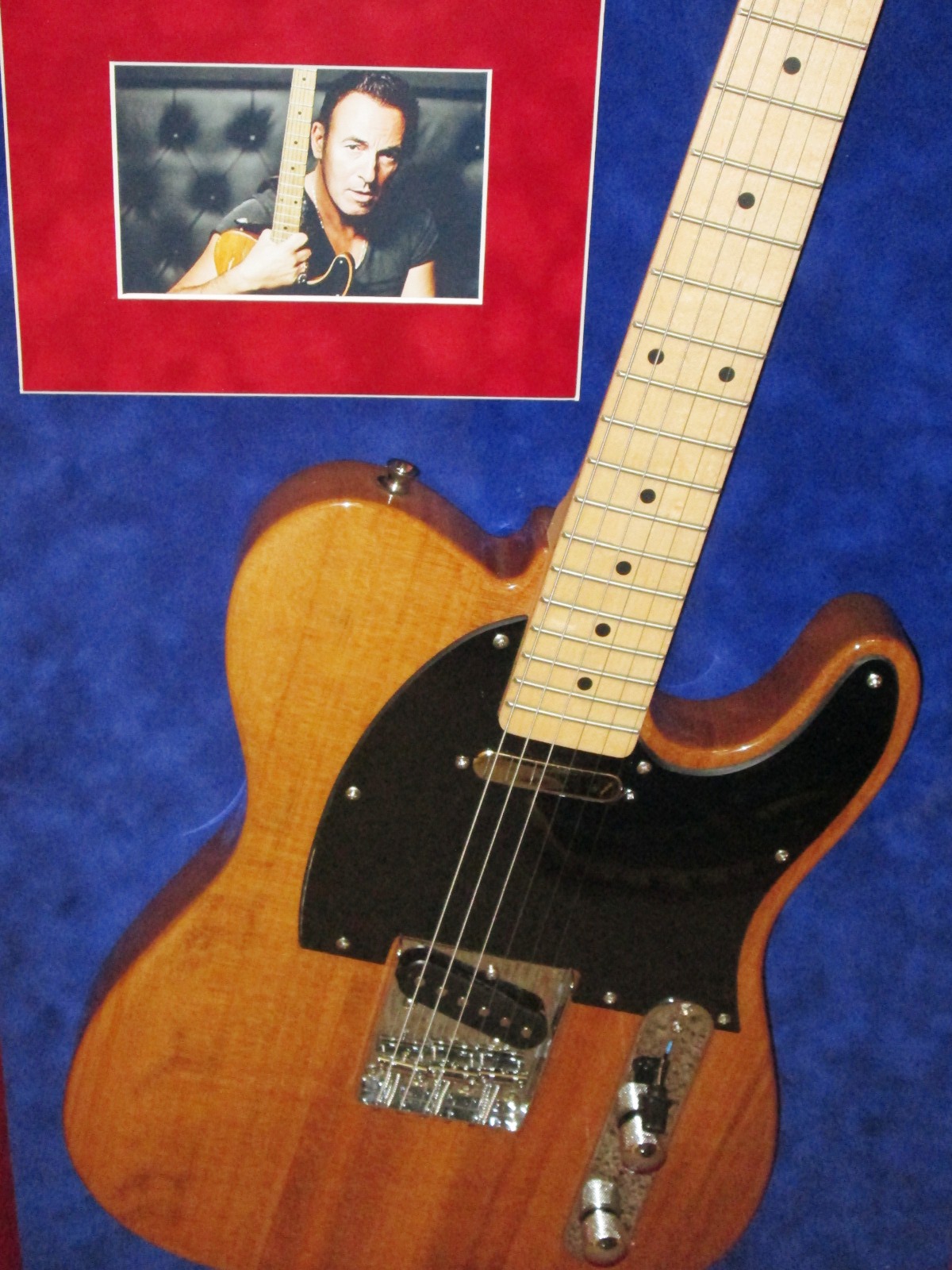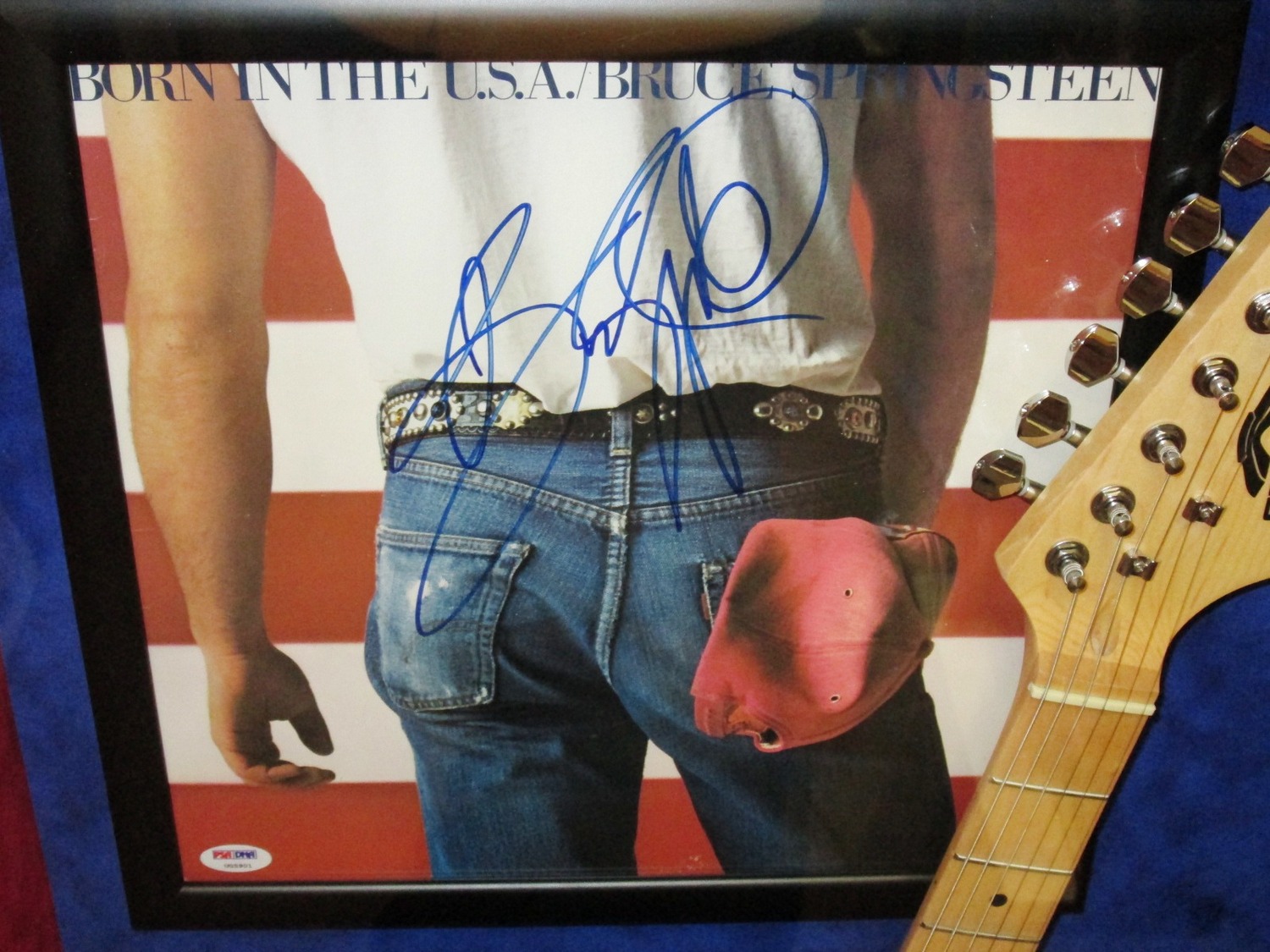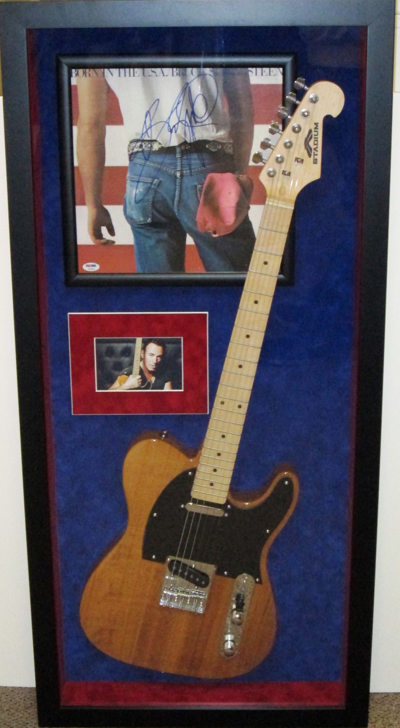 Custom matted and framed display measures 21.5" x 45.5" in size. Features an album cover hand-signed in blue felt-tip pen by Bruce Springsteen ("The Boss"), as well as a Stadium brand electric guitar. Framed with acid free blue and red suede mat. The original "Born in the USA" vinyl record album and inner sleeve is included separately from the framed piece. The autograph includes an official PSA/DNA hologram and matching LOA for authenticity purposes.