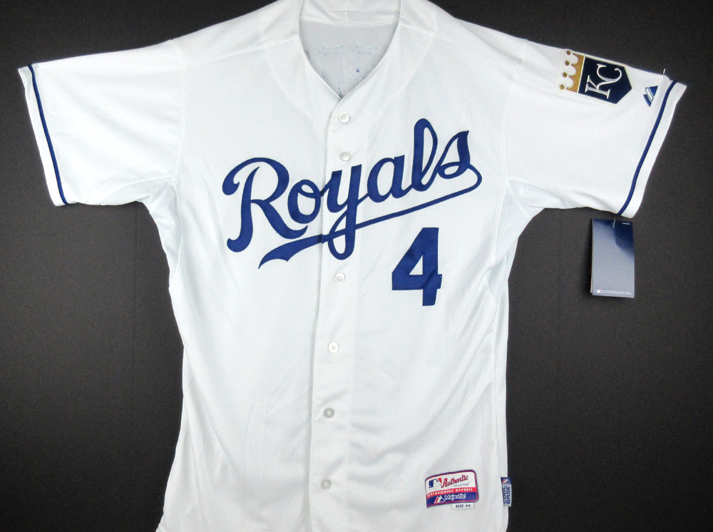 Authentic Majestic On Field Jersey. Everything is sewn on, size 44. Hand-signed in silver paint pen by Alex Gordon. The autograph includes an official MLB Authentication hologram for authenticity purposes.
