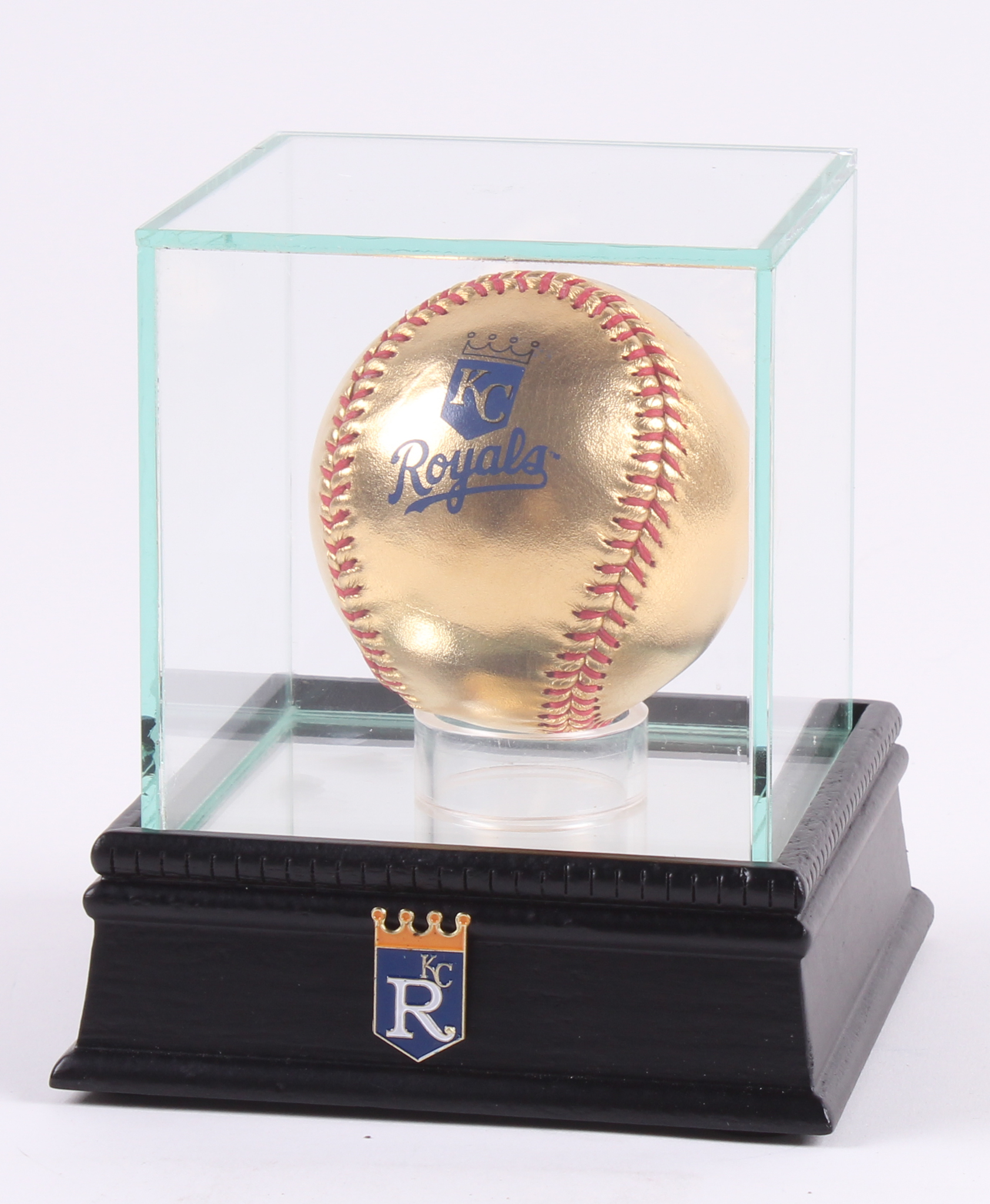 Rawlings Kansas City Royals Logo 24KT gold Official Major League Baseball. Please see photos for more details. The auction also includes a Steiner display case with a wood base, glass cube and a Kansas City Royals pin.