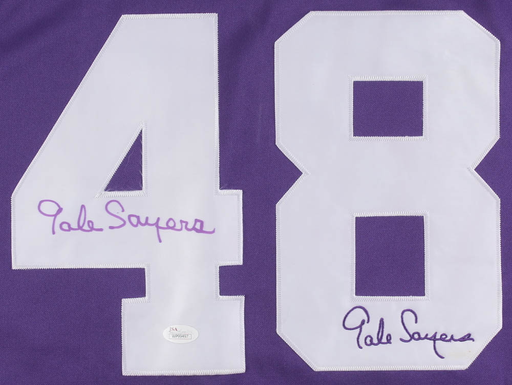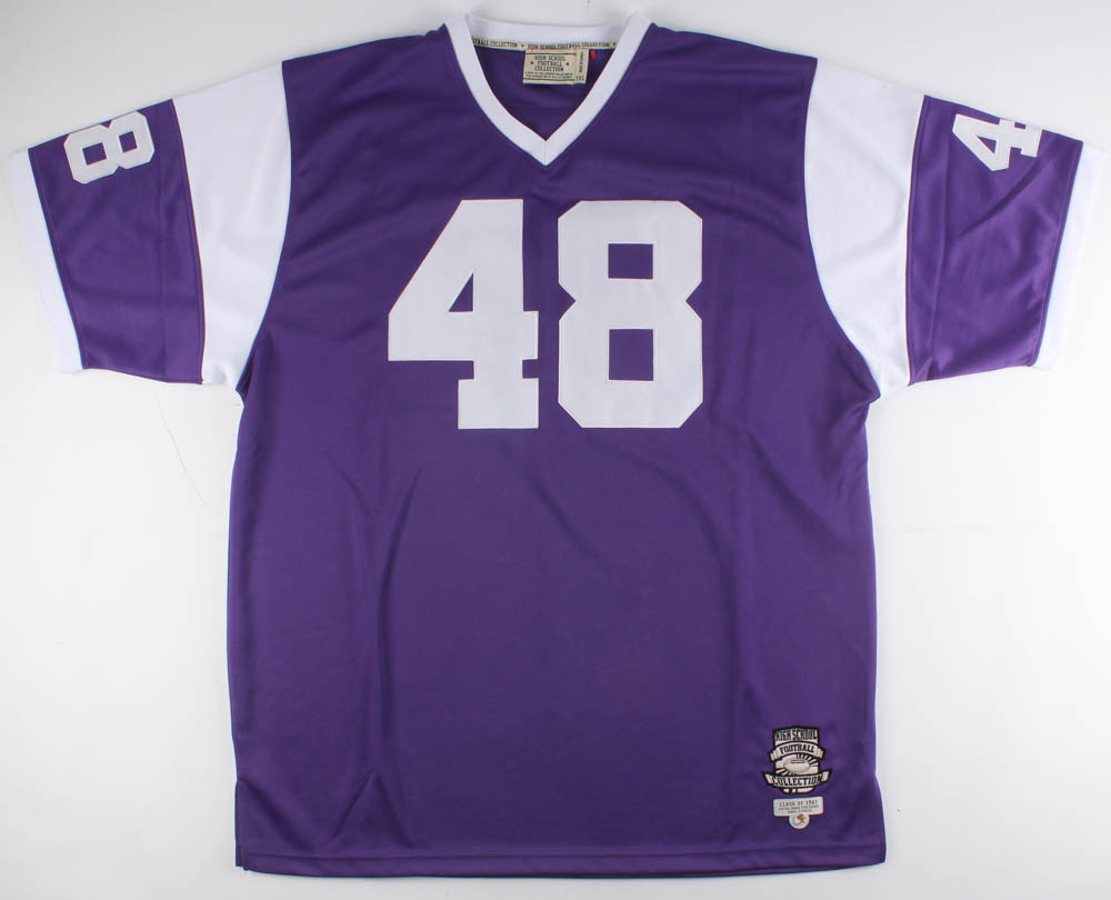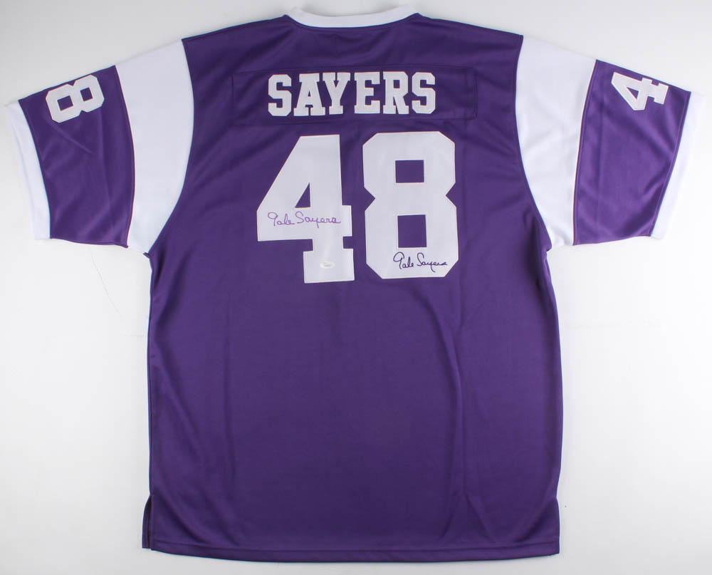 High School Football Collection on-field style jersey. Everything is sewn on, size XXL. Hand-signed in purple felt-tip pen by Gale Sayers (HOF).
