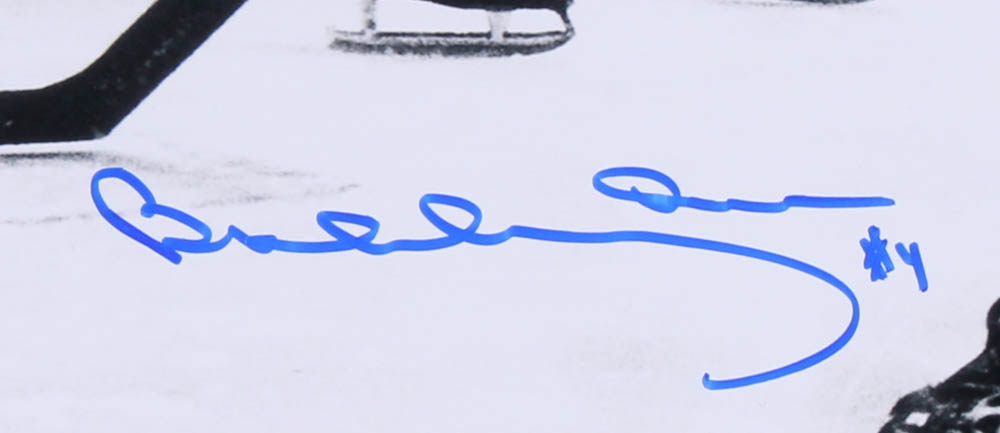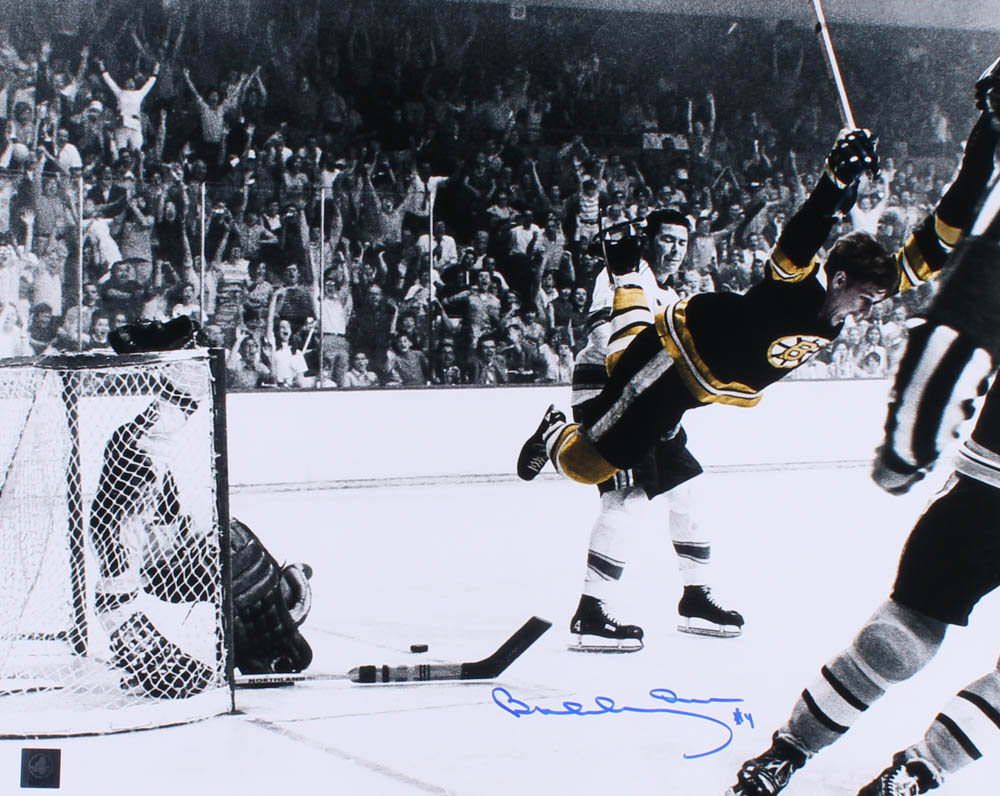 Photo measures 16" x 20" in size and features one of the most iconic moments in all of sports. The photo is hand-signed in blue felt tip pen by Bobby Orr (HOF).