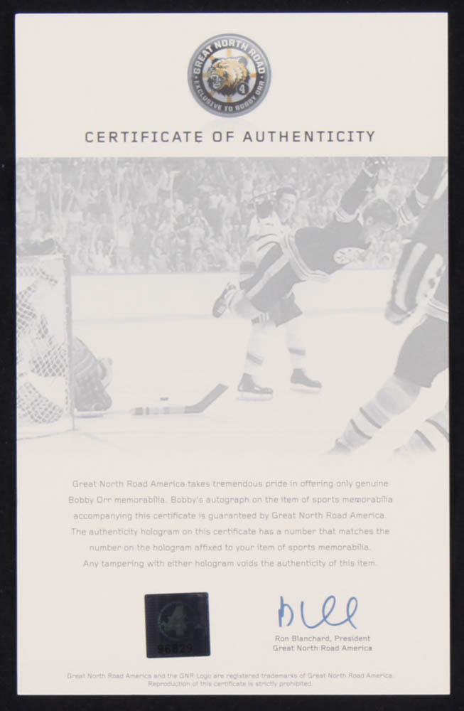The autograph includes an official Bobby Orr hologram and matching COA from Great North Road for authenticity purposes.