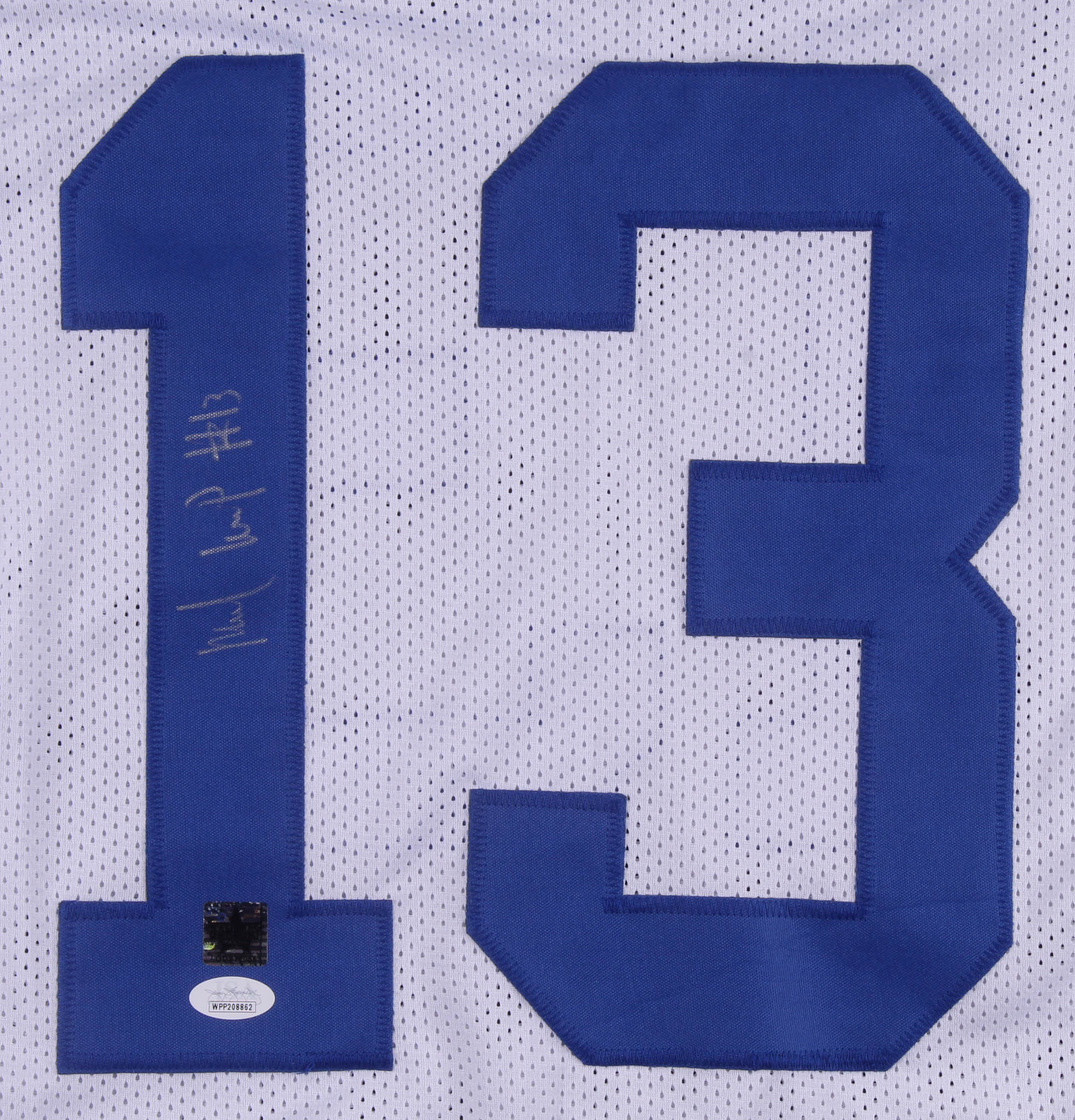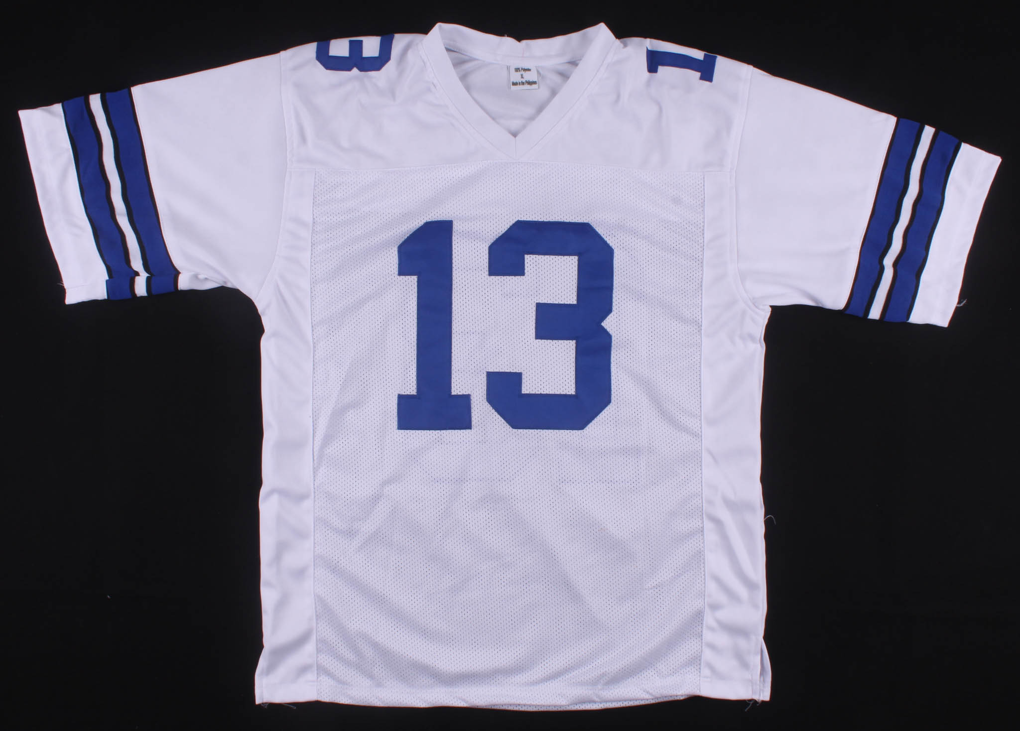 Custom on-field style jersey. Everything is sewn on, size XL. Hand-signed in silver paint pen by Michael Gallup.