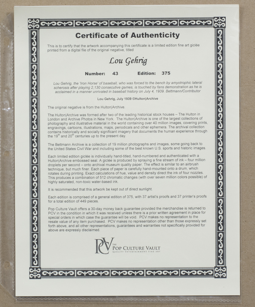 Lou Gehrig LE "Iron Horse Hulton" 23x28 Custom Framed Giclee Display