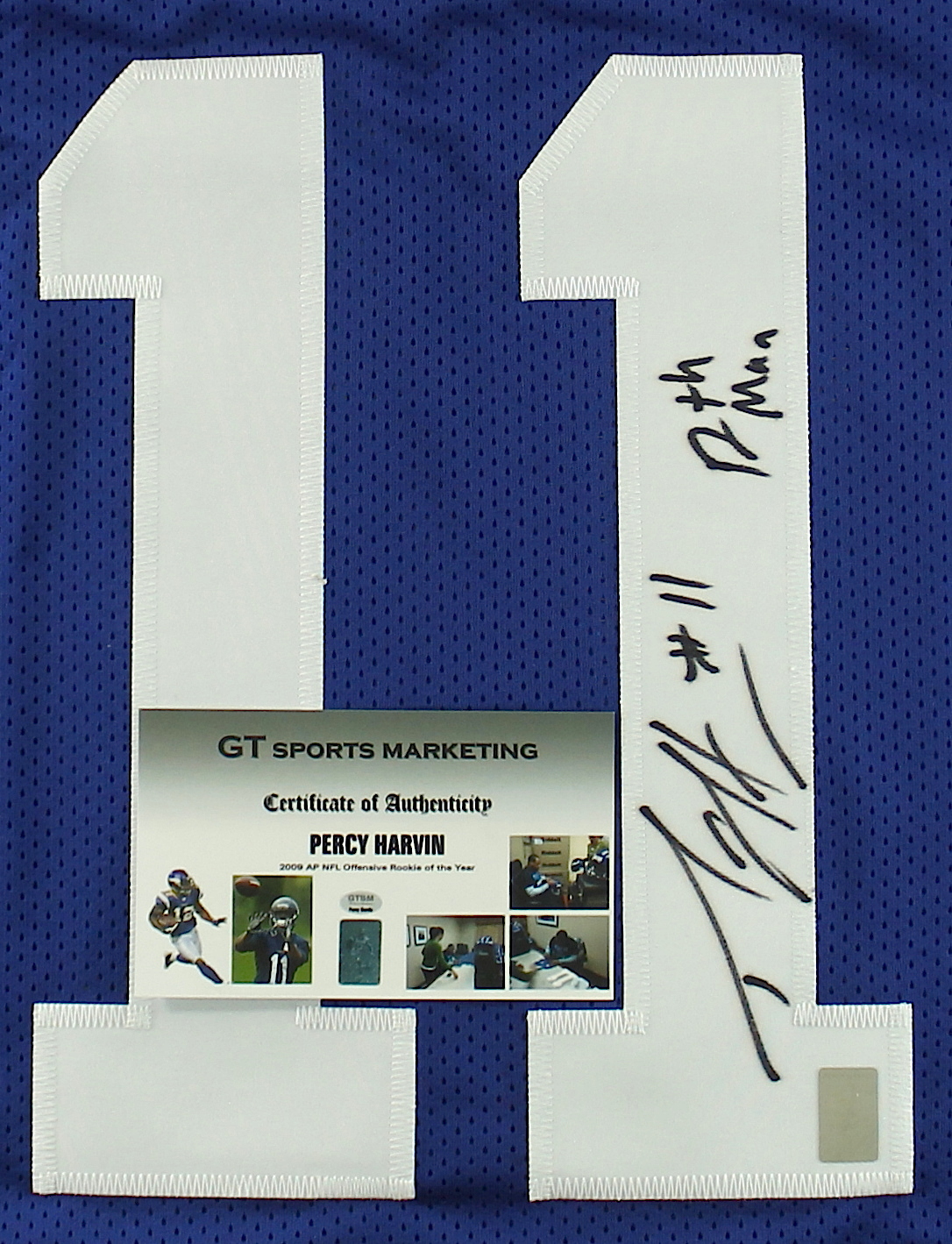 Custom on-field style jersey. Everything is sewn on, size XL. Hand-signed and inscribed in black felt-tip pen by Percy Harvin (Vikings). Autograph includes an official GTSM Percy Harvin hologram with matching COA for authenticity purposes.