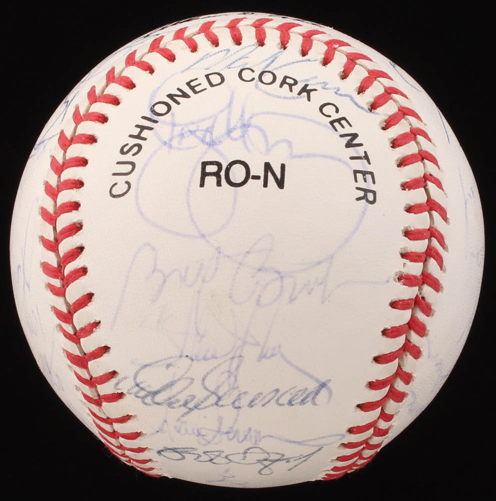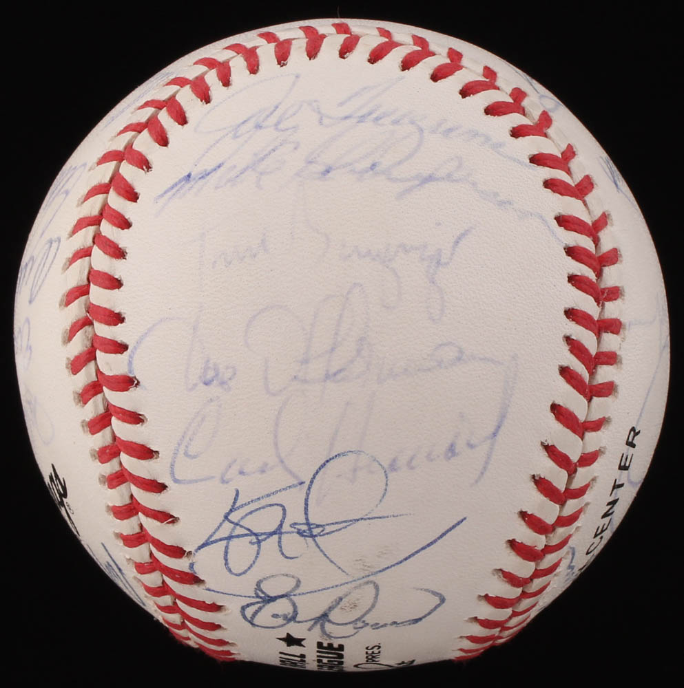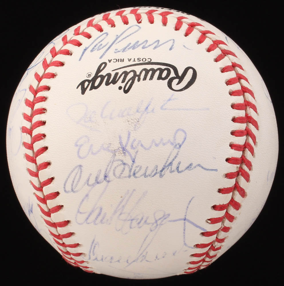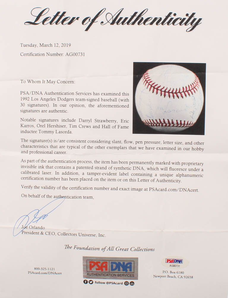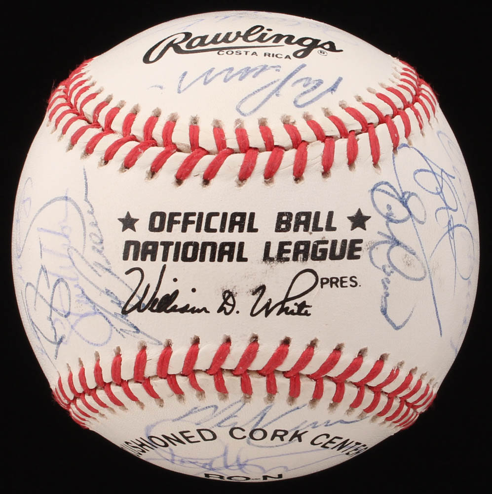 Rawlings Official National League baseball. Hand-signed in blue ink pen by (30) with Darryl Strawberry, Eric Karros, Orel Hershiser, Tim Crews, Tommy Lasorda (HOF), Mike Scioscia, Mike Sharperson, Joey Amalfitano, Todd Benzinger, Brett Butler, Tom Candiotti, Eric Davis, Joe Ferguson, Jim Gott, Kevin Gross, Kip Gross, Dave Hansen, Lenny Harris, Carlos Hernandez, Ben Hines, Stan Javier, Ramon Martinez, Roger McDowell, Jose Offerman, Bob Ojeda, Ron Perranoski, Juan Samuel, Mitch Webster, and Steve Wilson.