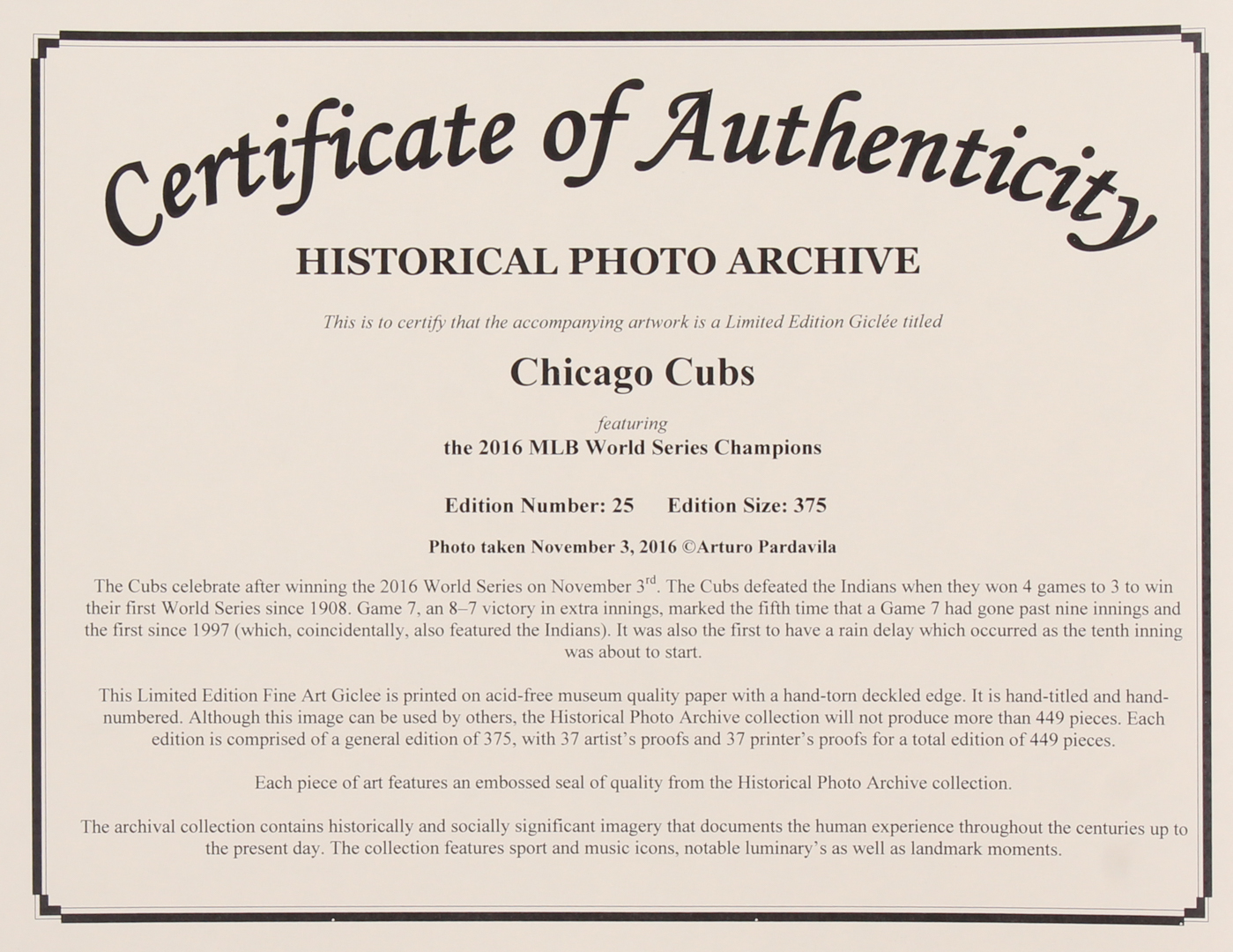 Historical Photo Archive - Chicago Cubs "2016 World Series Champions" Limited Edition 17x22 Fine Art Giclee on Paper #/375 (PA LOA & HPA COA)