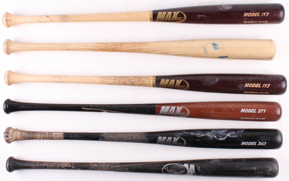 Lot includes all (6) Assorted game-used baseball bats. Lot includes (4) MaxBat baseball bats, (1) Louisville Slugger baseball bats, and (1) baseball bat. Baseball bats have been cracked and used by unknown players. Please see photos for details regarding the condition of the baseball bats.