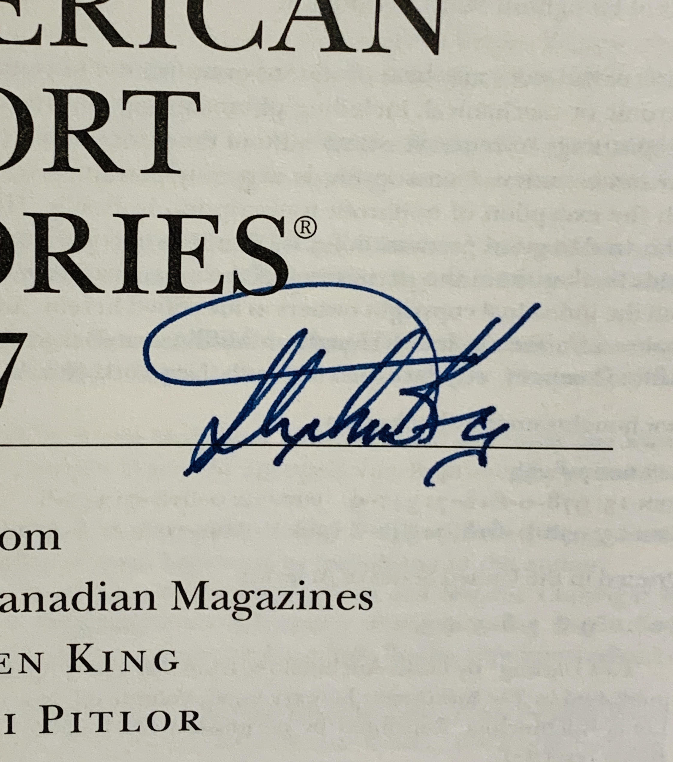 “The Best American Short Stories” softcover book, hand signed in blue felt tip pen by author, Stephen King.