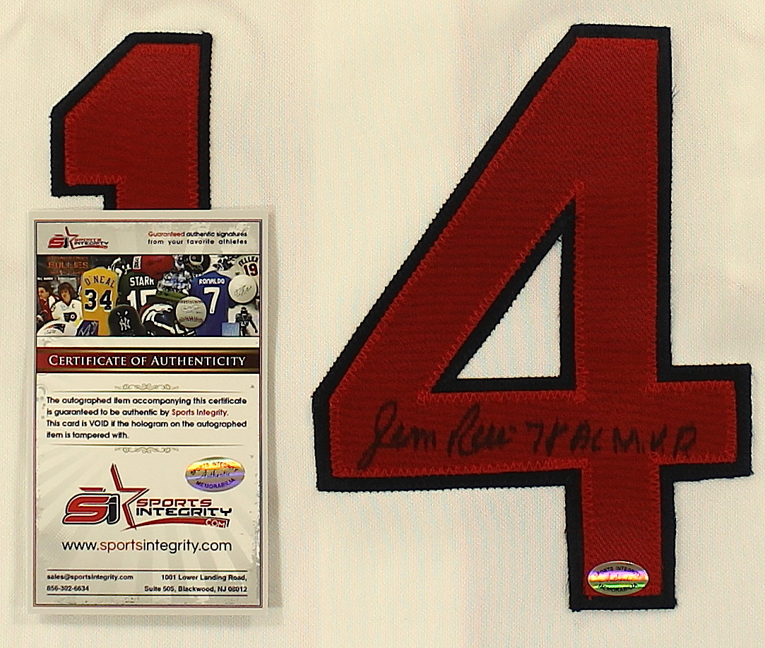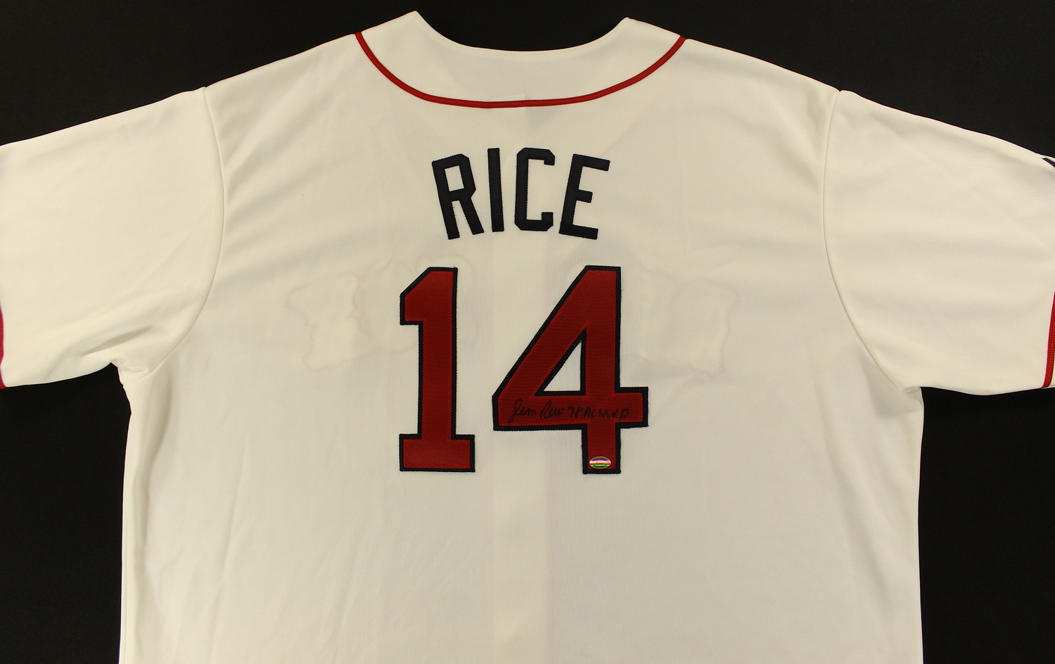 Majestic on-field style jersey. Everything sewn on, size XXL. Hand-signed and inscribed in black felt-tip pen by Jim Rice (HOF). The autograph includes an official Sports Integrity hologram and COA for authenticity purposes.