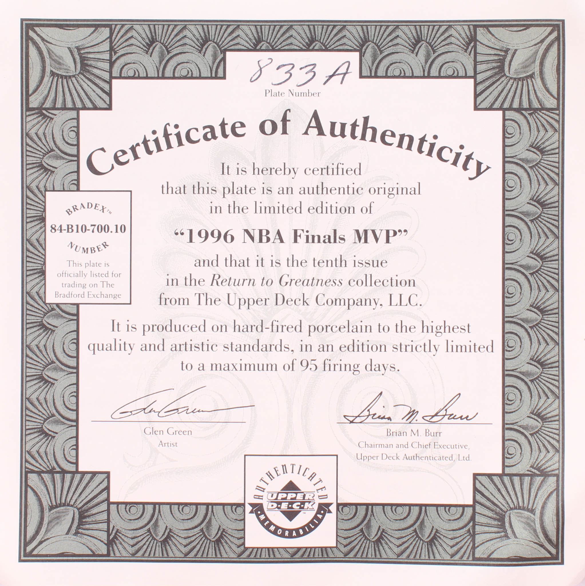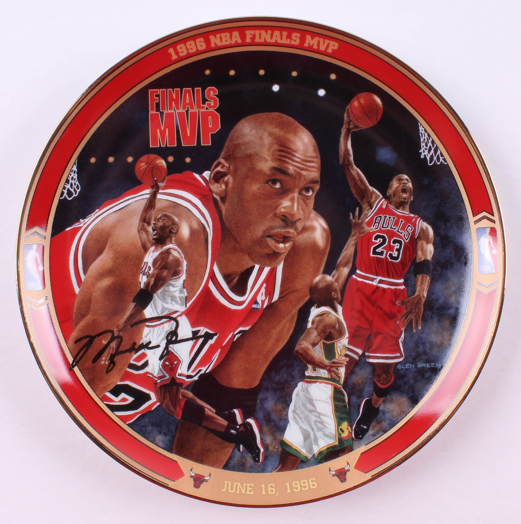 Michael Jordan "1996 NBA Finals MVP" plate measures approximately 8" in diameter. The plate is a limited edition and has been hand-numbered #833A. Please note, the signature is a facsimile.