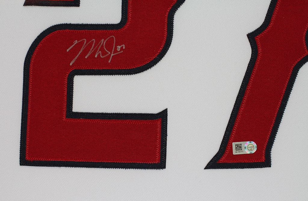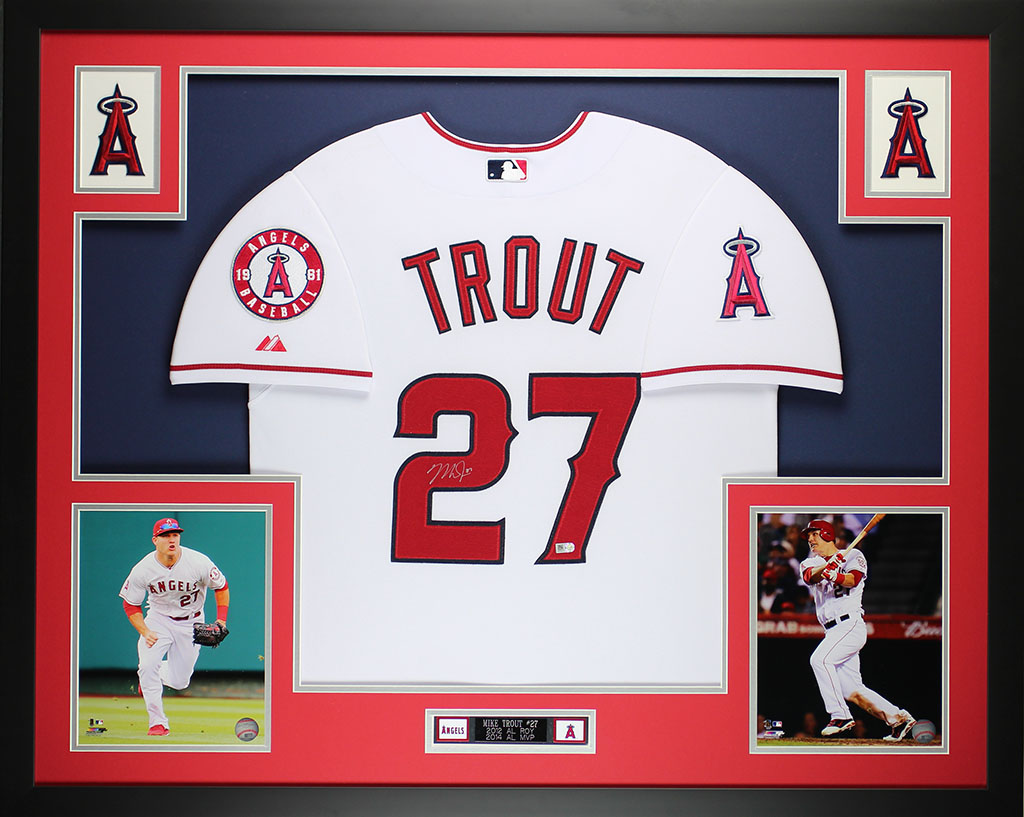 A beautifully framed autographed Mike Trout Jersey. The autograph is certified by MLB and includes a sticker on the Jersey and a matching certificate attached to the back of the frame. The Jersey was just recently framed and the Frame is in perfect condition. The frame is ready to hang right out of the box. Size and Frame details are as follows: