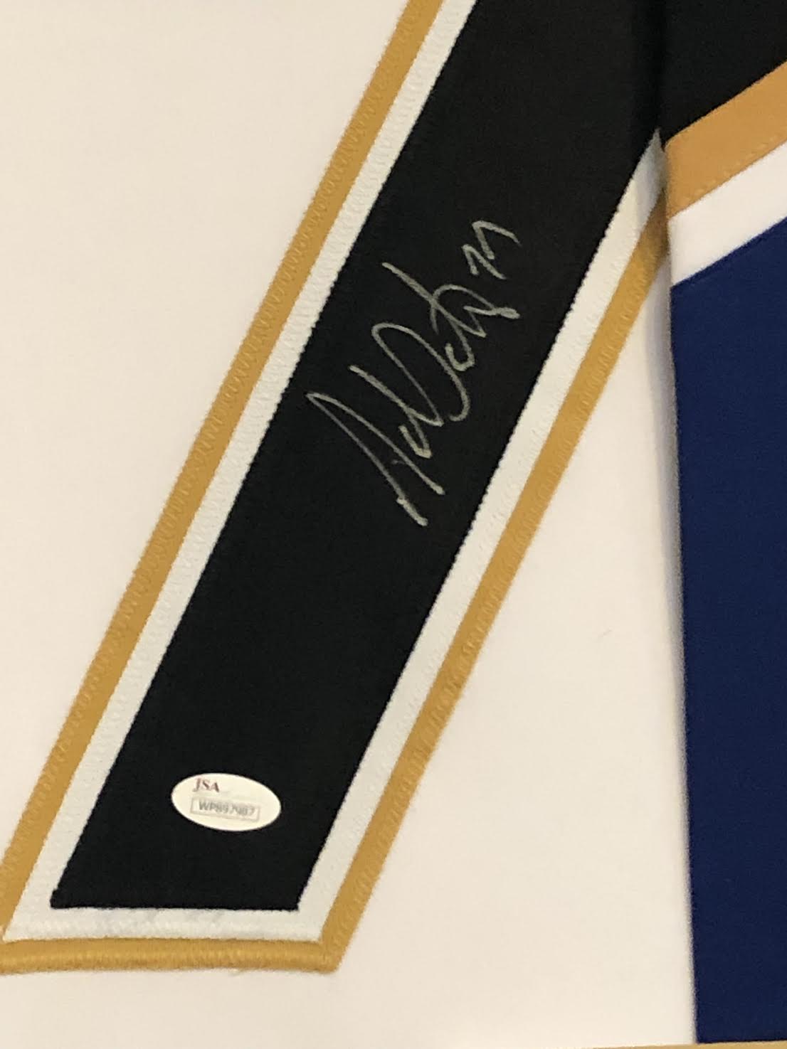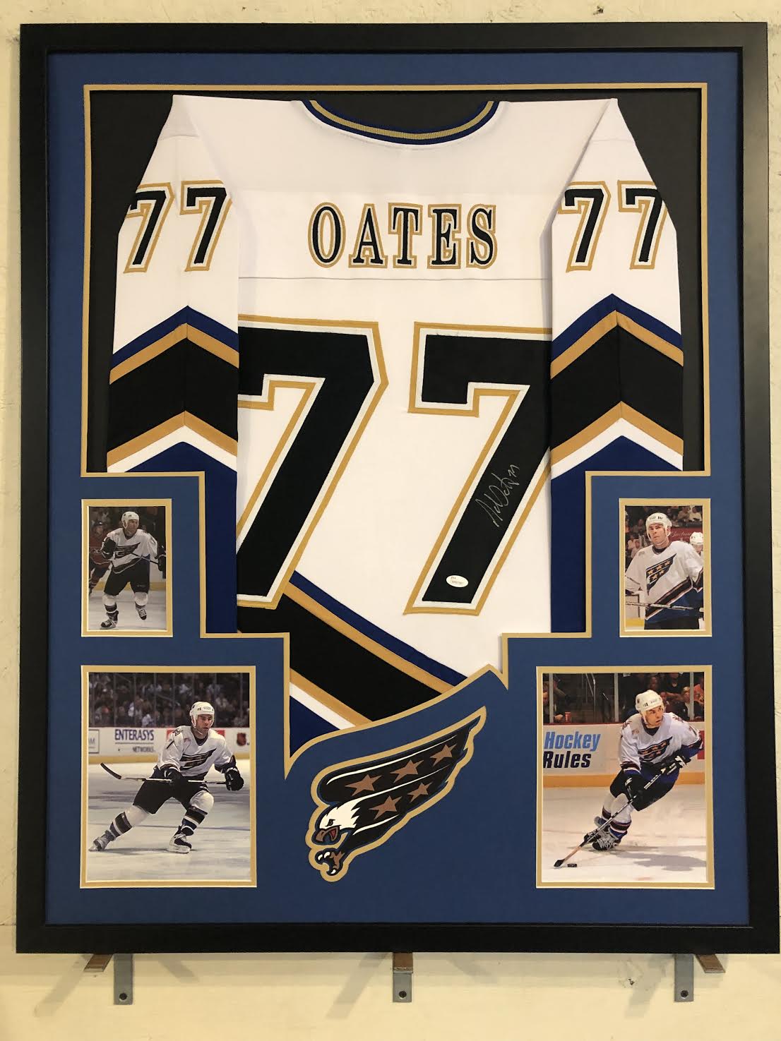 Custom frame measures approximately 34" x 42" in size and features a jersey which has been hand-signed in silver paint pen by Adam Oates (HOF).