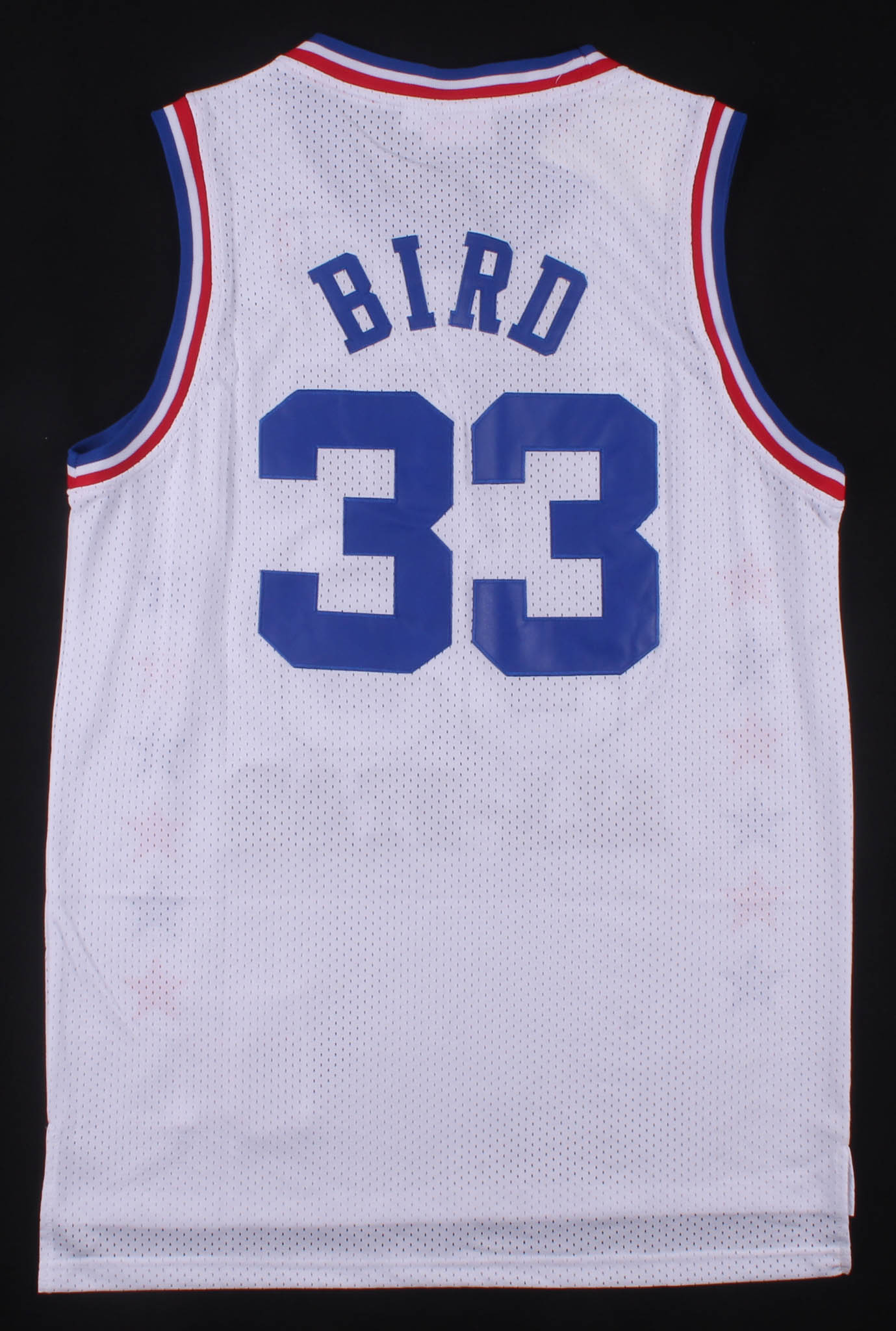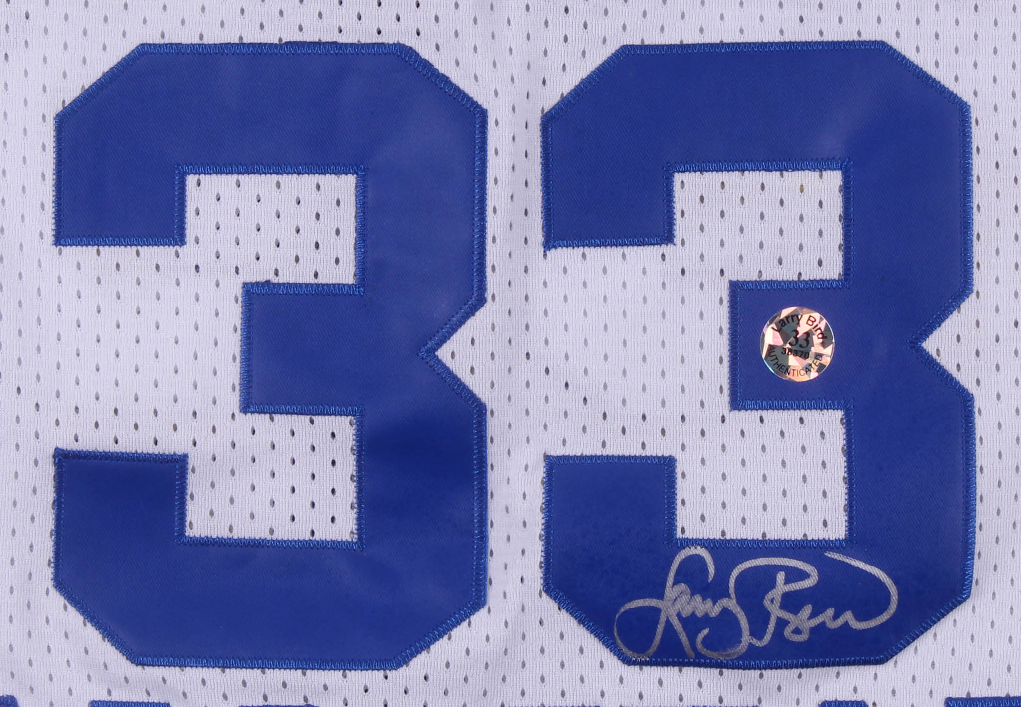 Mitchell & Ness on-court style jersey. Everything is sewn on, size L. Hand-signed in silver paint pen by Larry Bird (Boston Celtics, HOF).