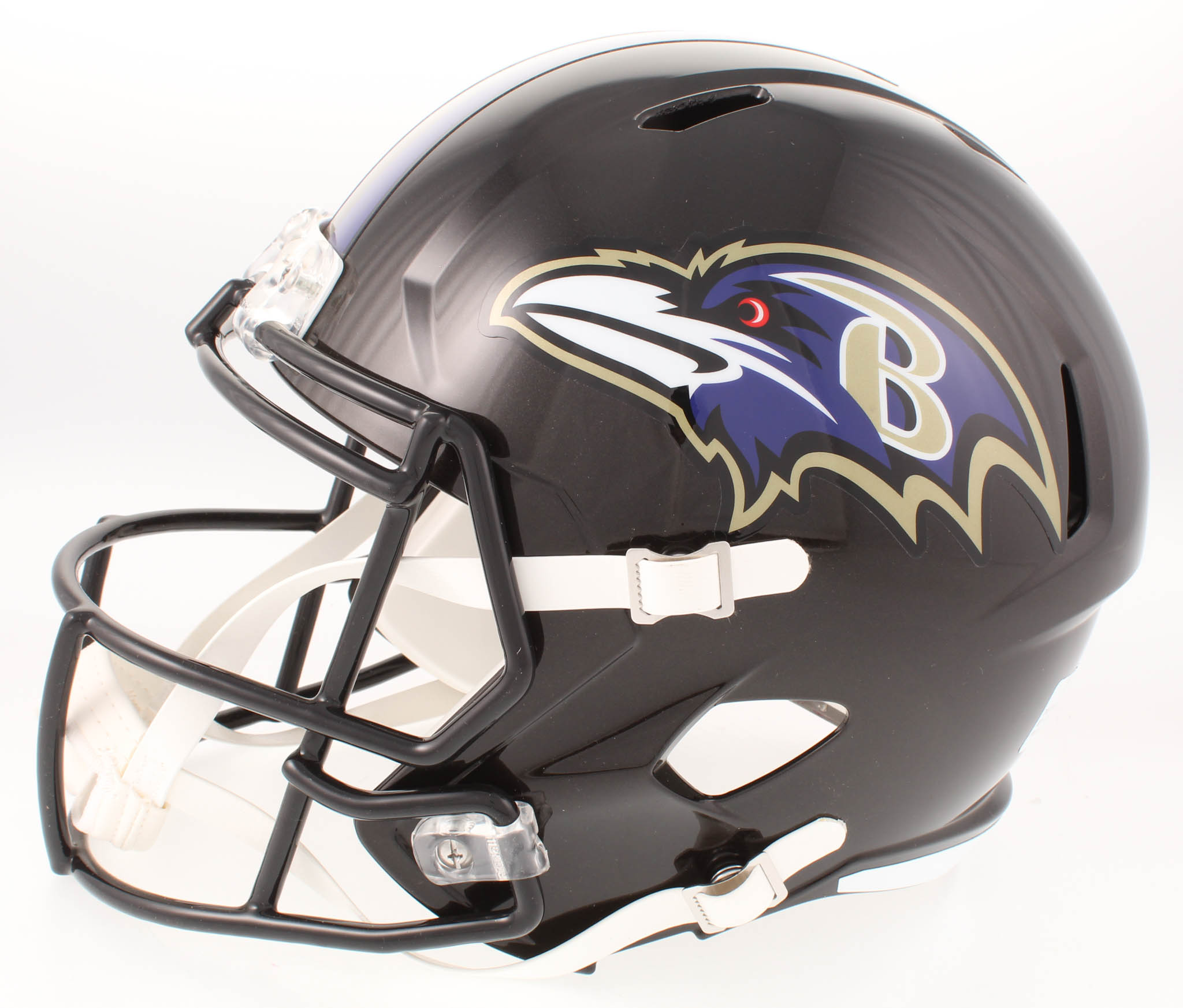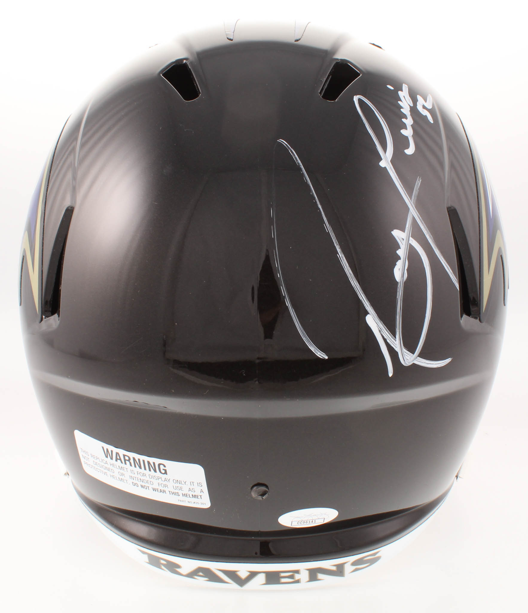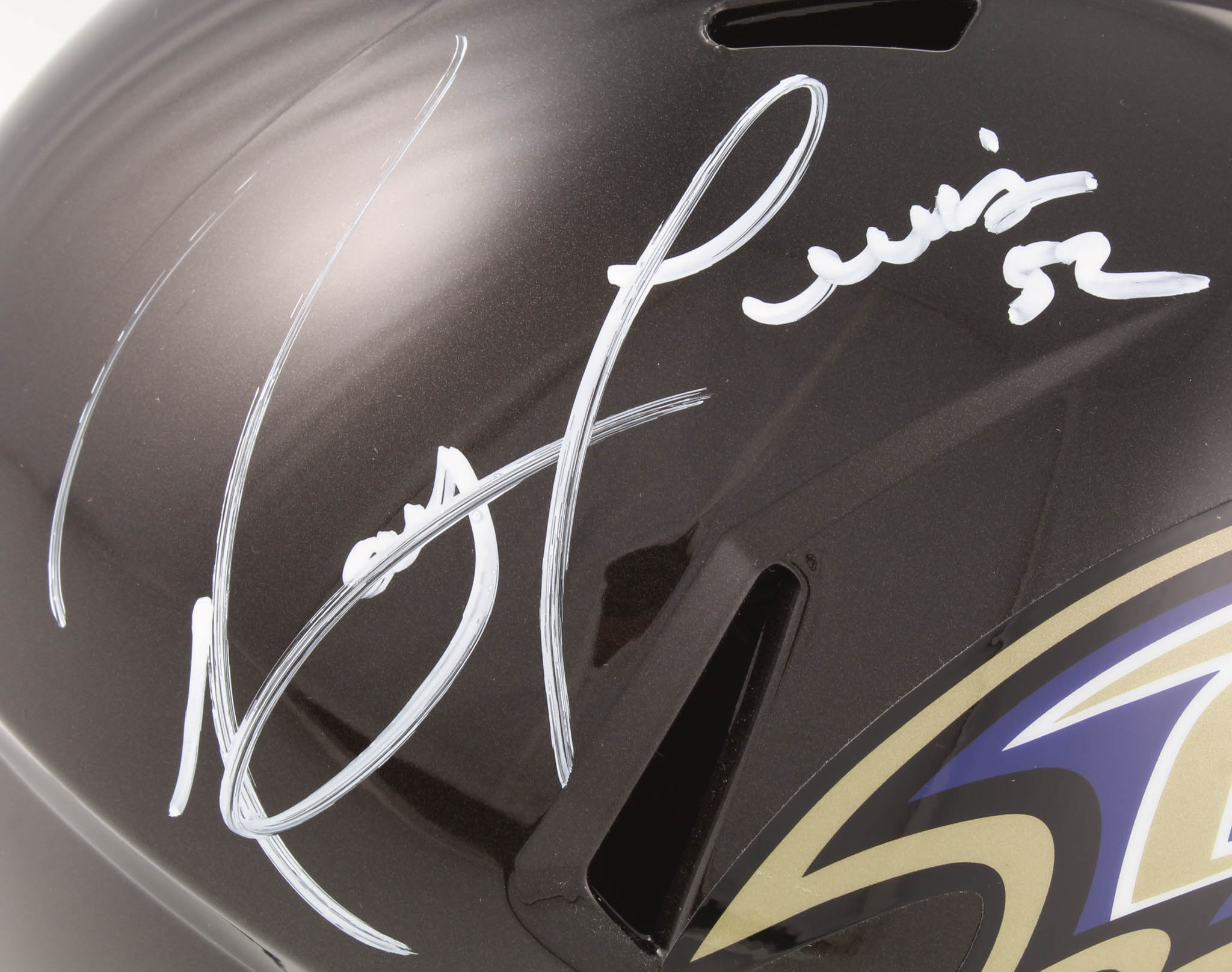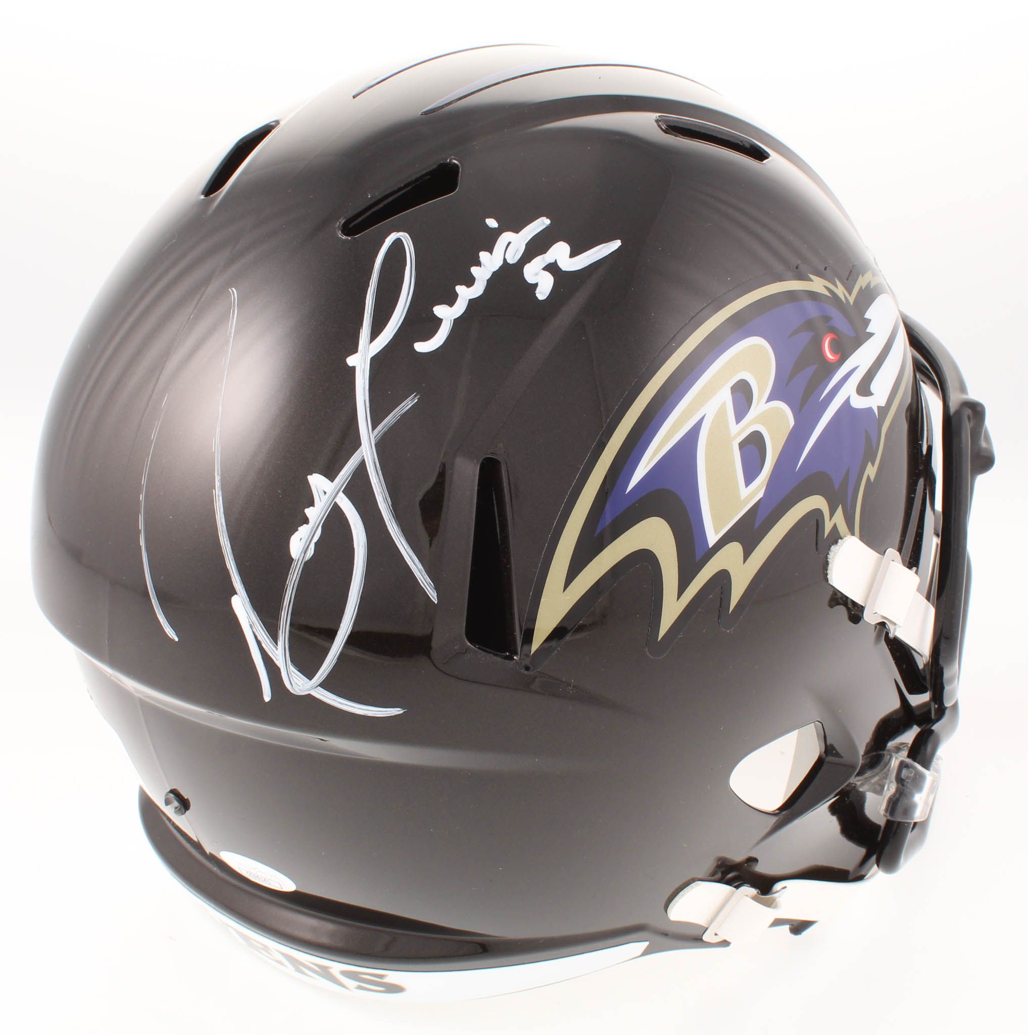 Riddell Baltimore Ravens full-size replica speed helmet. Hand-signed in white paint pen by Ray Lewis (HOF). Please see photos for details regarding the condition of the helmet.