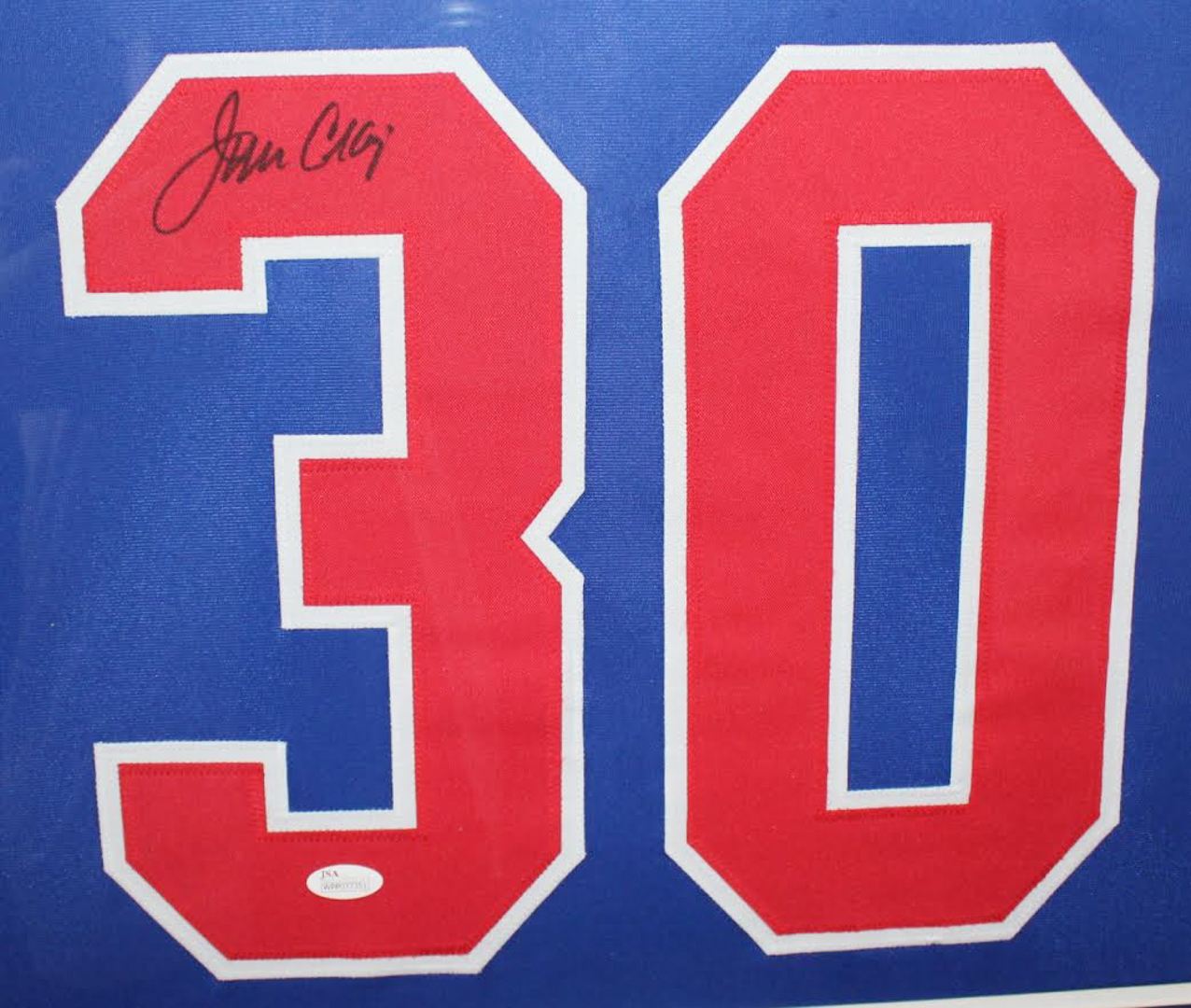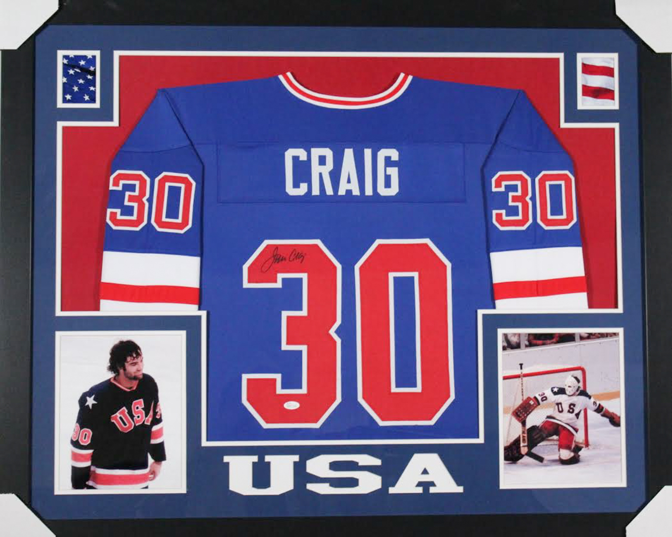 Custom frame measures approximately 35" x 43" in size and features a jersey which has been hand-signed in black felt-tip pen by Jim Craig.