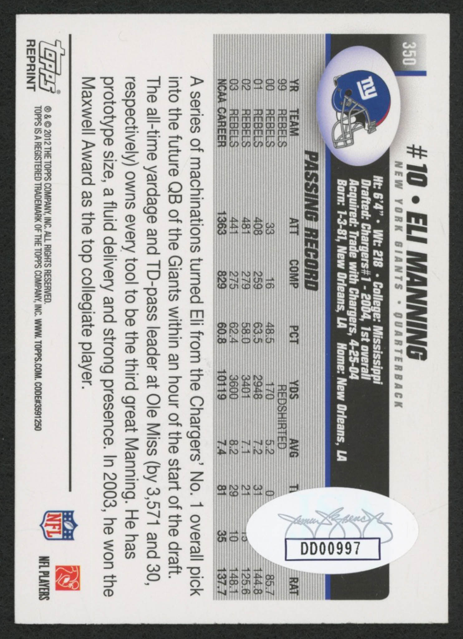 Eli Manning Signed 2004 Topps #350 RC (JSA COA)