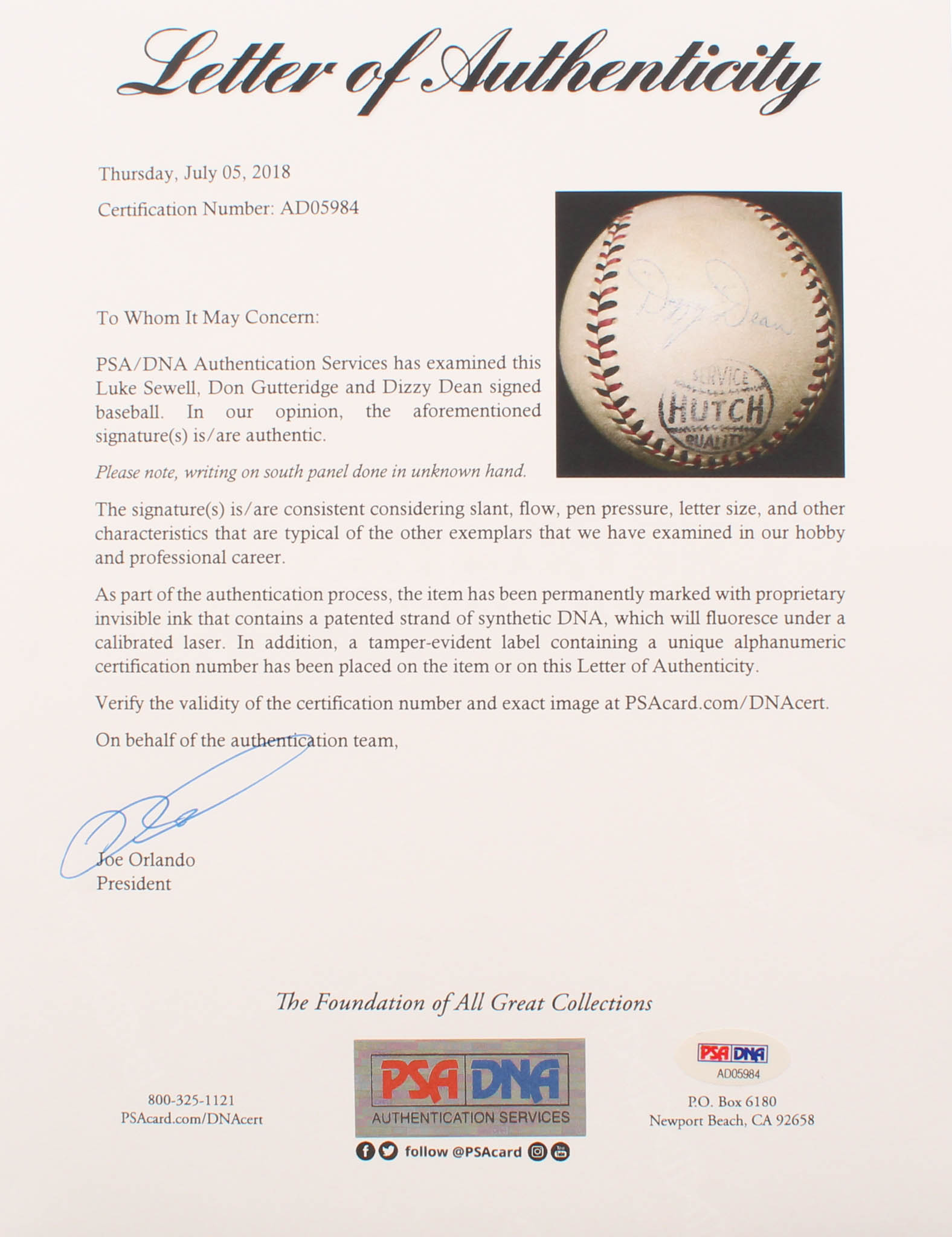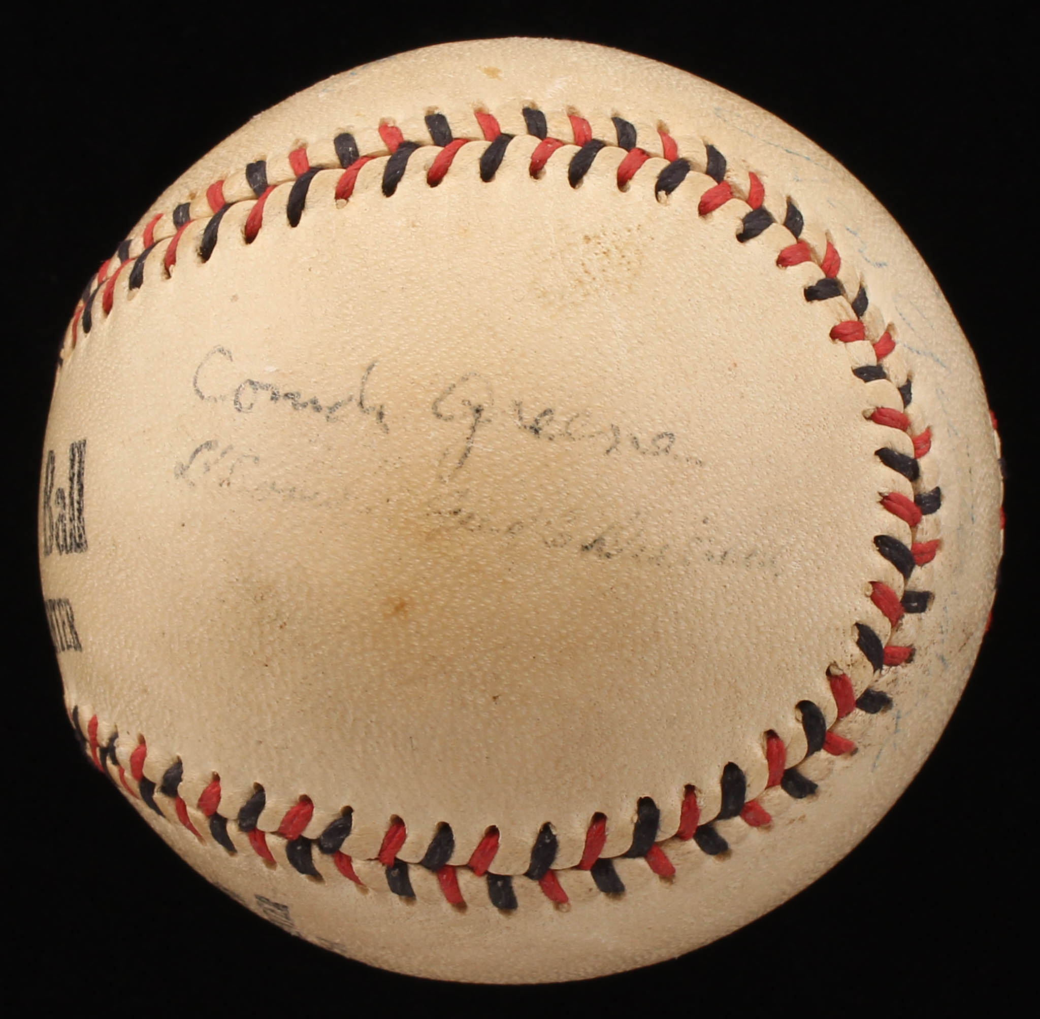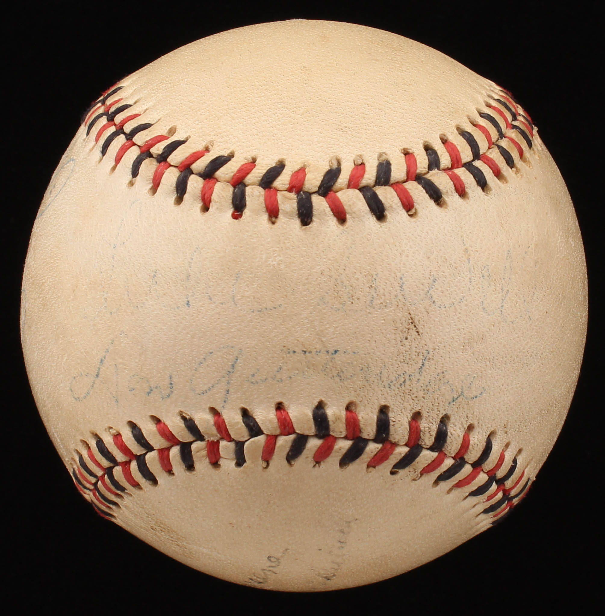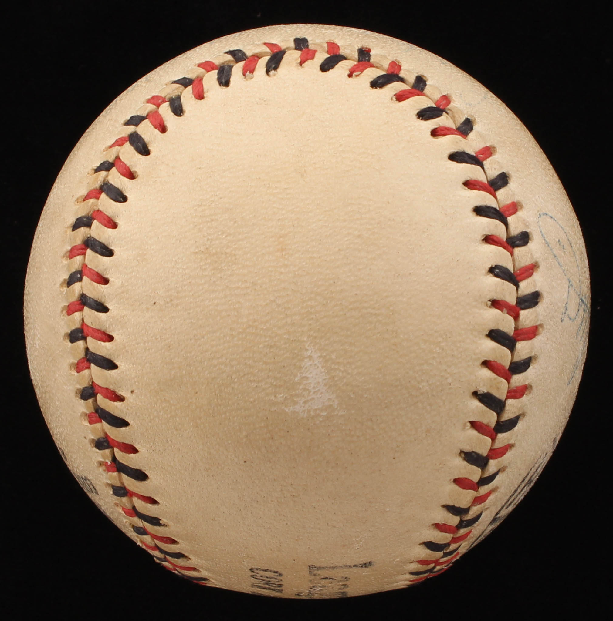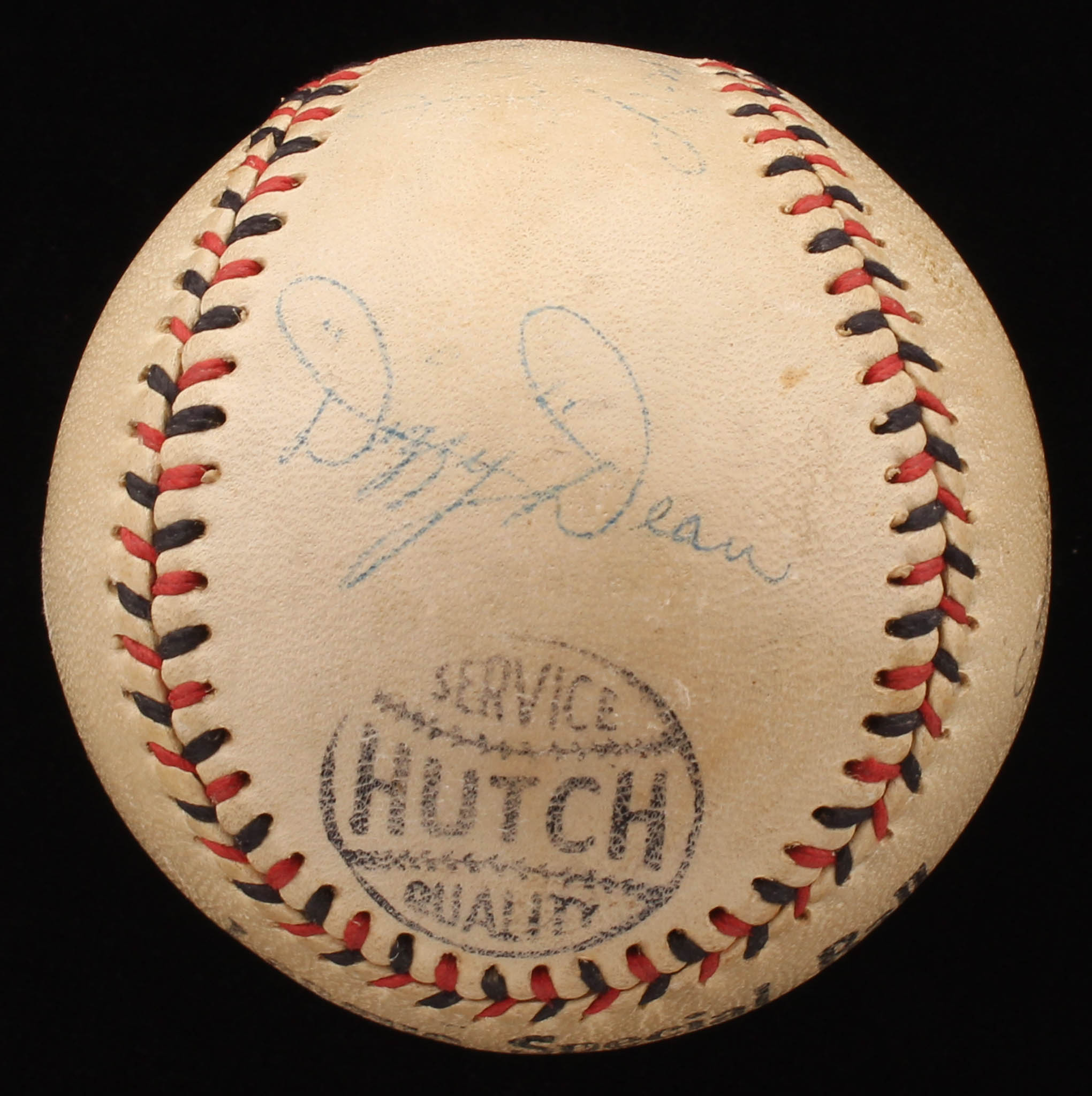 Hutch Service Quality baseball. Hand-signed in blue ink pen by Luke Sewell (D. 1987, St. Louis Browns), Don Gutteridge (D. 2008, St. Louis Browns) and Dizzy Dean (D. 1974, St. Louis Browns, HOF).