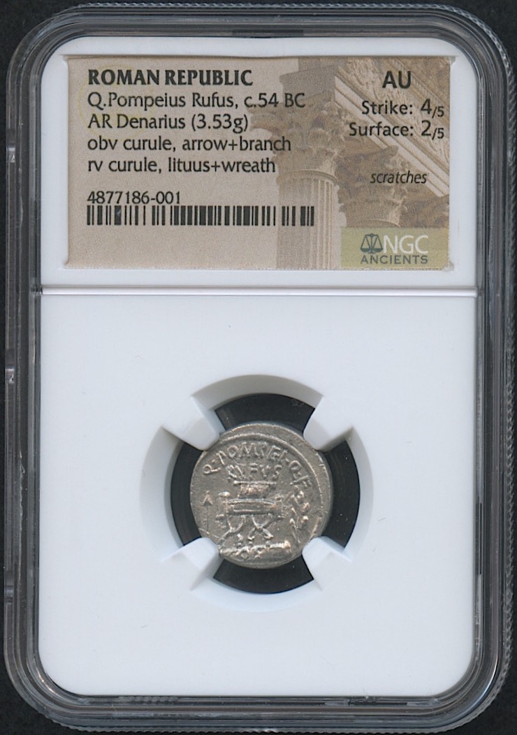 54 BC Original Roman Republic - Q. Pompeius Refus - AR Denarius Coin (NGC AU)