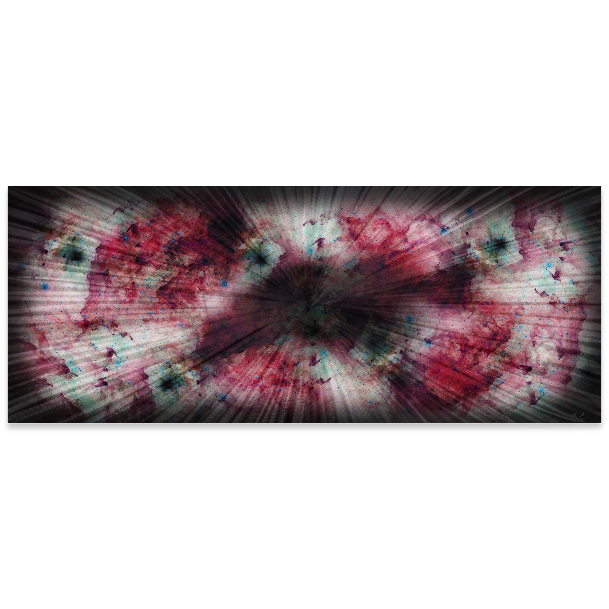 "Get lost in the stars and create your own moment of Zen. 'Warm Nebula 60' is a striking 60in x 24in handmade masterpiece crafted by Helena Martin in Cincinnati, Ohio, USA, and backed with a certificate of authenticity. The coloring is an artistically altered compilation of NASA photography applied in rich acrylic inks and sandwiched between two layers of a glossy clear coat. Behind the colors, the surface of the metal is carefully ground by hand, so the precise pattern you see in the background has an almost holographic effect as ambient light passes through the colors and reflects off the grooves of the grind pattern. This remarkably technical composition is referred to as an original multiple, as the hand-crafted elements are closely replicable by the artist, but with enough natural, subtle variations to make it truly unique and exclusively yours.