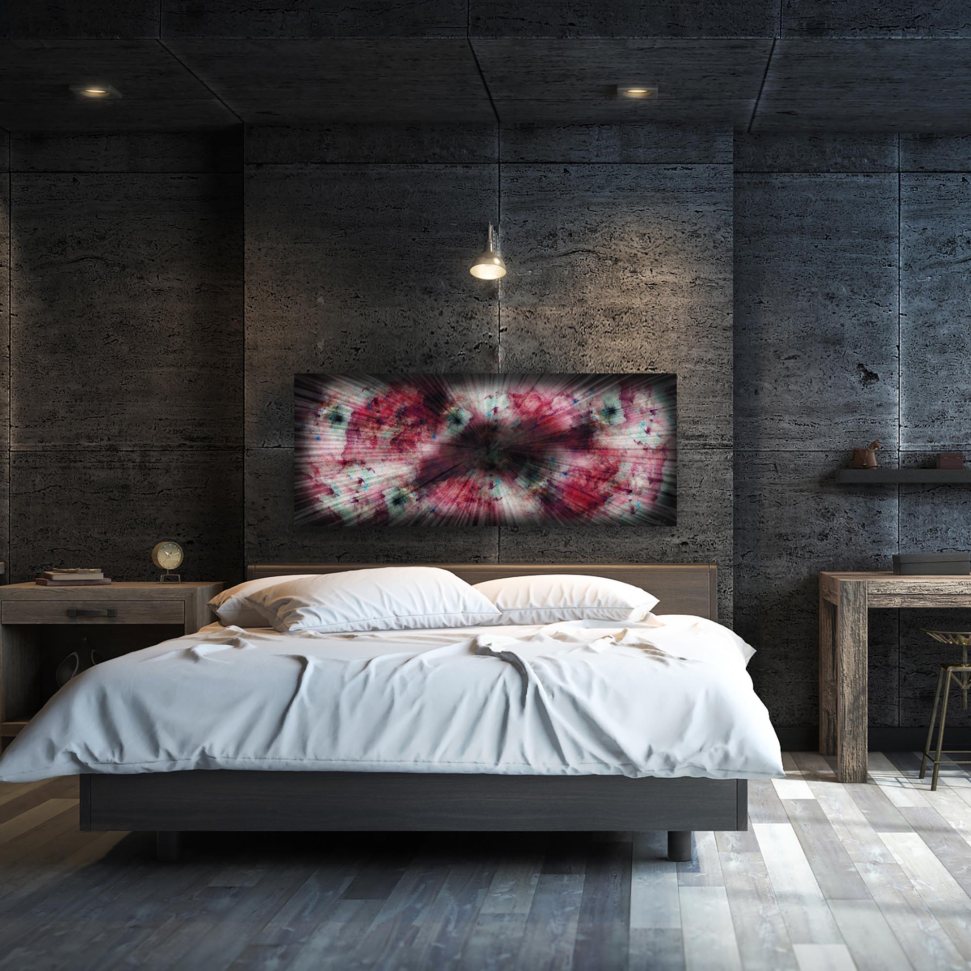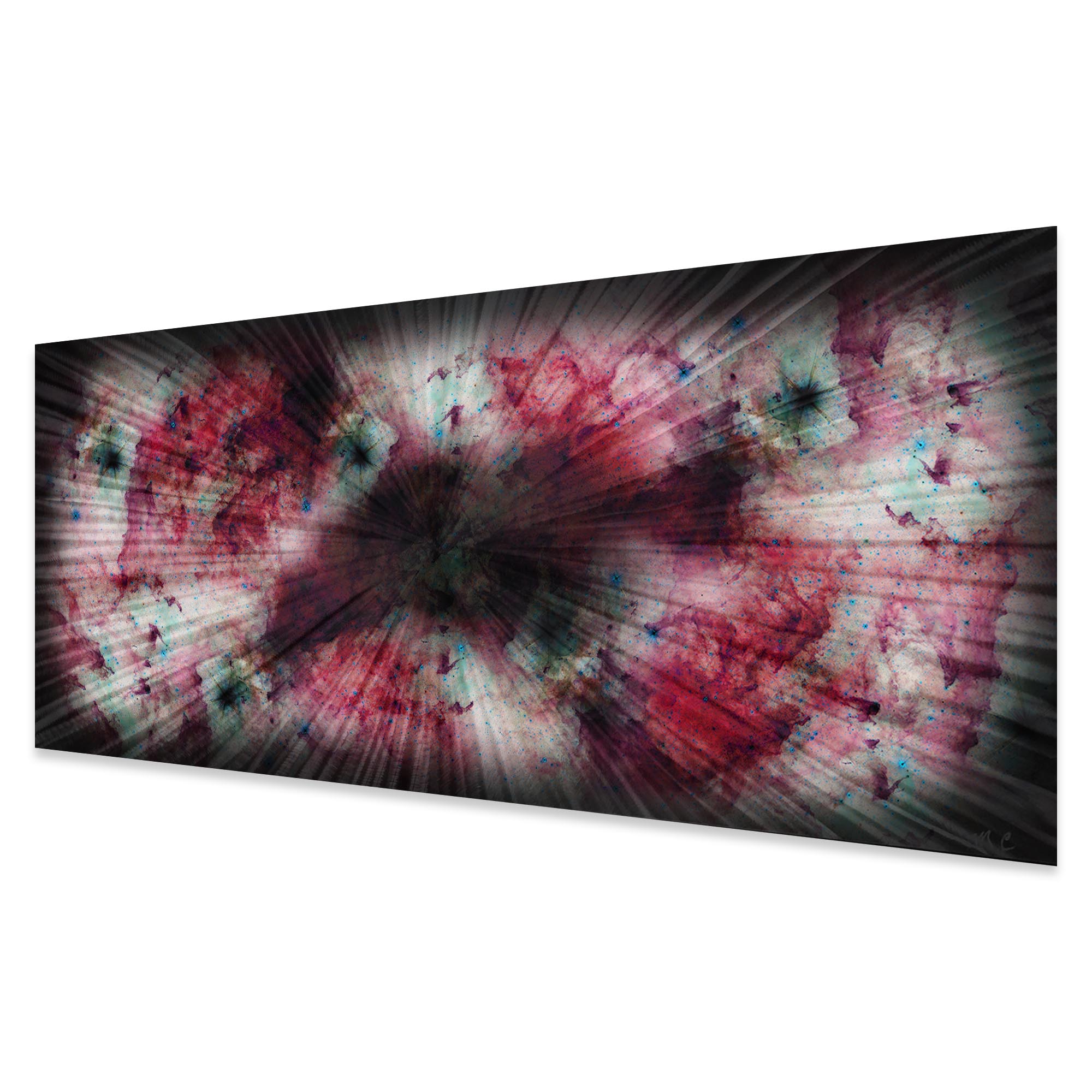 This original abstract art features a nebula scene, applied in semi-transparent hues of red, teal, gray, metallic black, etc. on ground and colored metal with an attractive high gloss finish. The aluminum is rather lightweight so the artwork easy to hang from the metal sawtooth brackets on back, and is even suitable for indoor/outdoor placement due to the weather and fade resistant finishes. This stunning wall art is an instant conversation piece and crowd pleaser in any contemporary setting.