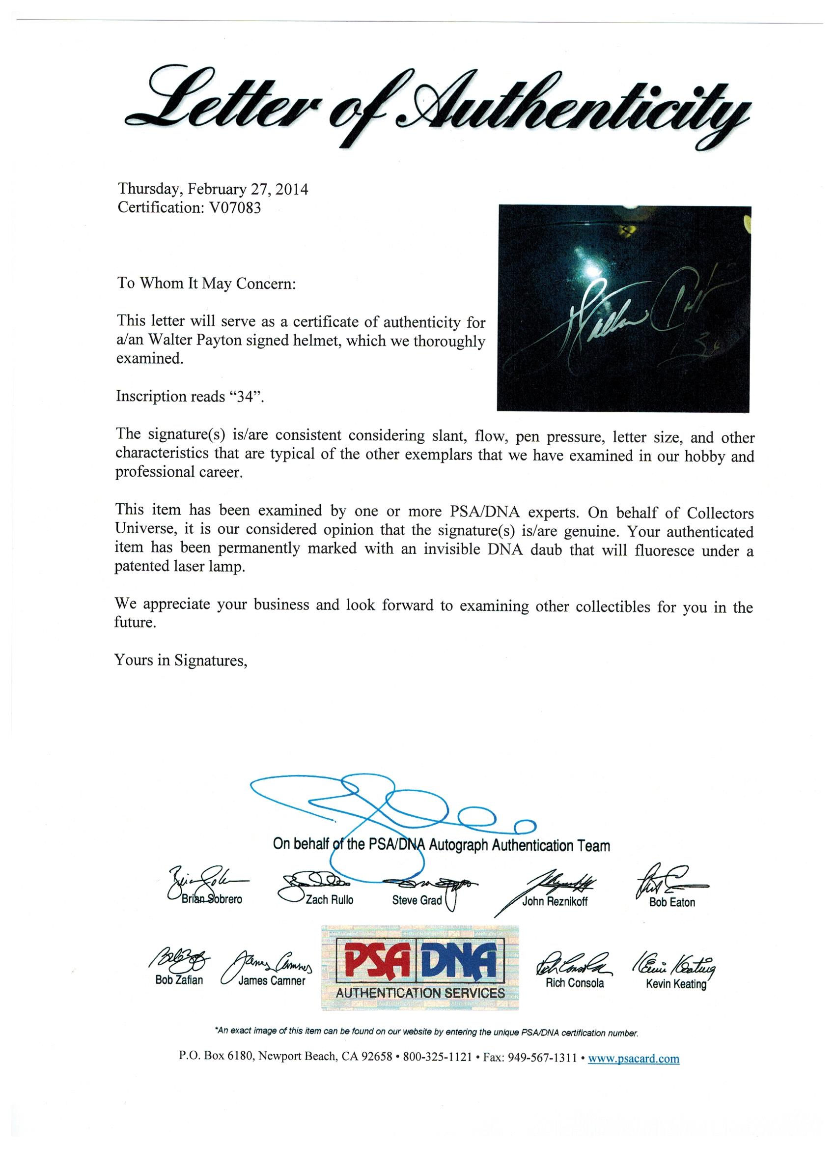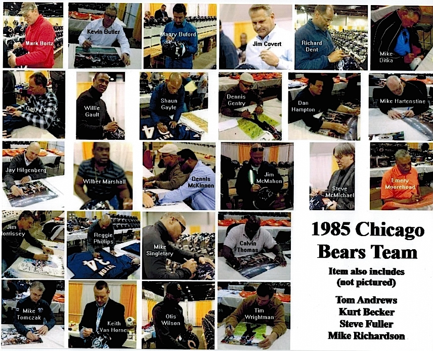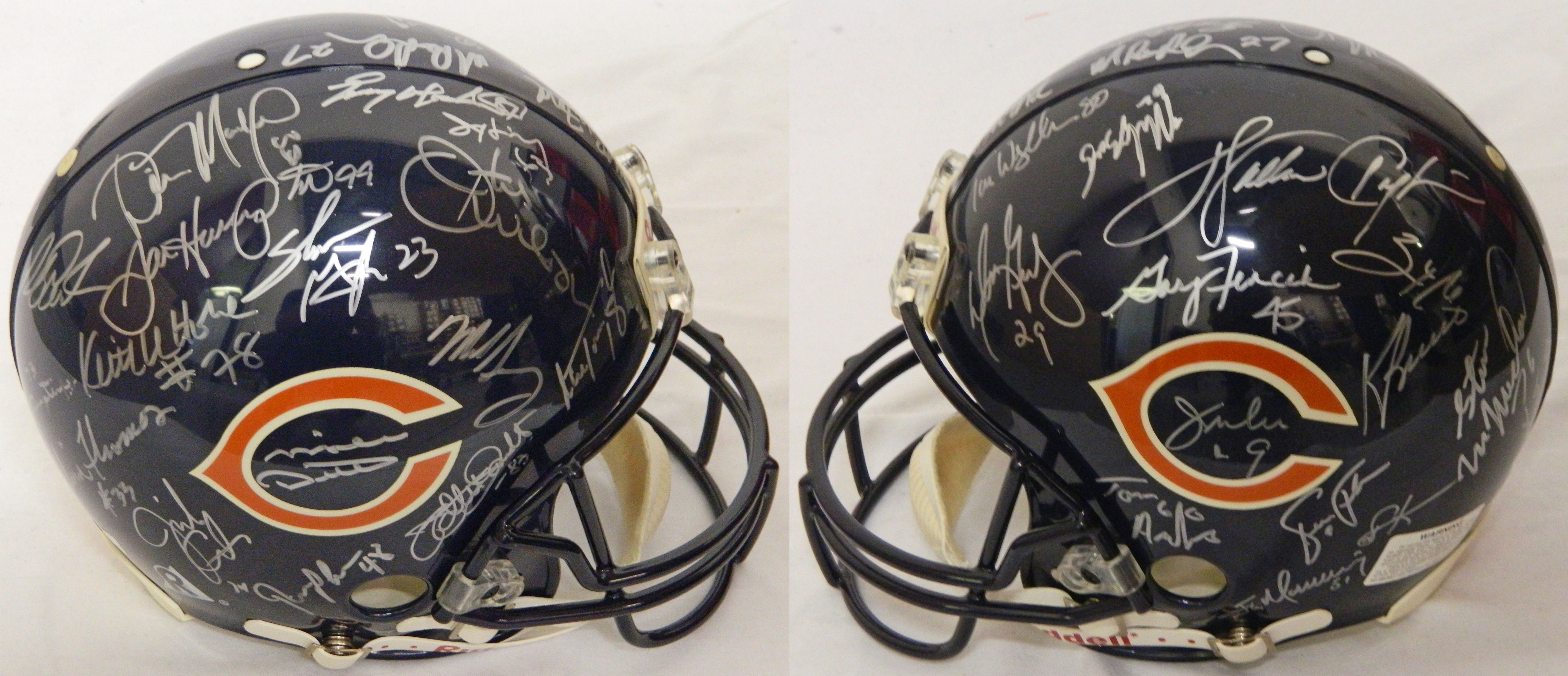 This is a Walter Payton and 1985 Chicago Bears Team signed Chicago Bears Riddell ProLine authentic helmet with 31 signatures. This helmet has been signed by 31 members of 1985 Chicago Bears team, they include; Walter Payton, Mike Ditka, Jim McMahon, Mike Singletary, Richard Dent, Dan Hampton, Steve McMichael, Gary Fencik, Jay Hilgenberg, Willie Gault, Wilber Marshall, Jim Covert, Mark Bortz, Keith Van Horne, Steve Fuller, Mike Tomczak, Kevin Butler, Otis Wilson, Mike Richardson, Shaun Gayle, Dennis McKinnon, Emery Moorehead, Denis Gentry, Kurt Becker, Reggie Phillips, Jim Morrissey, Maury Buford, Tom Andrews, Tim Wrightman, Calvin Thomas and Mike Hartenstine. The item comes with a PSA/DNA numbered tamper-proof hologram and full authentication letter which can be verified online for the Walter Payton signature. Item comes with a Schwartz Sports Memorabilia tamper-proof numbered hologram and Certificate of Authenticity which can be verified online, as well as an 8x10 collage print of the Team signing.