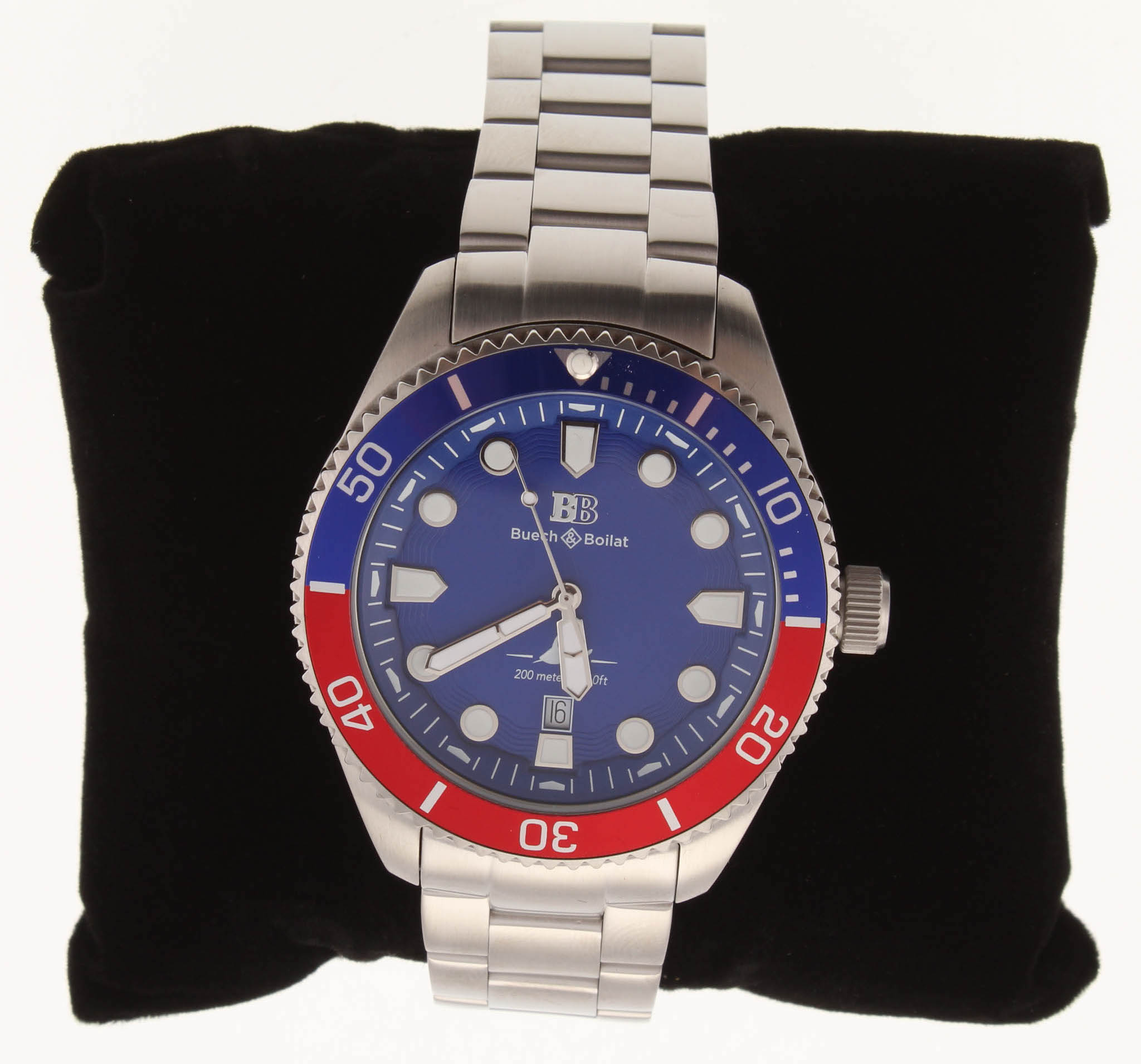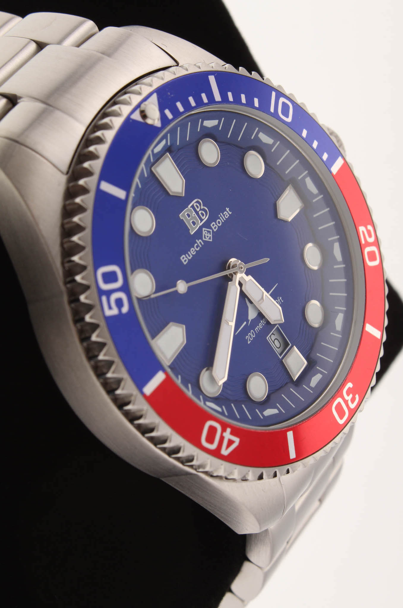 The Buech & Boilat Thresher Men's Swiss Diver Watch features a silver bracelet, silver case, blue and red bezel, and blue dial. Please see photos for details.
