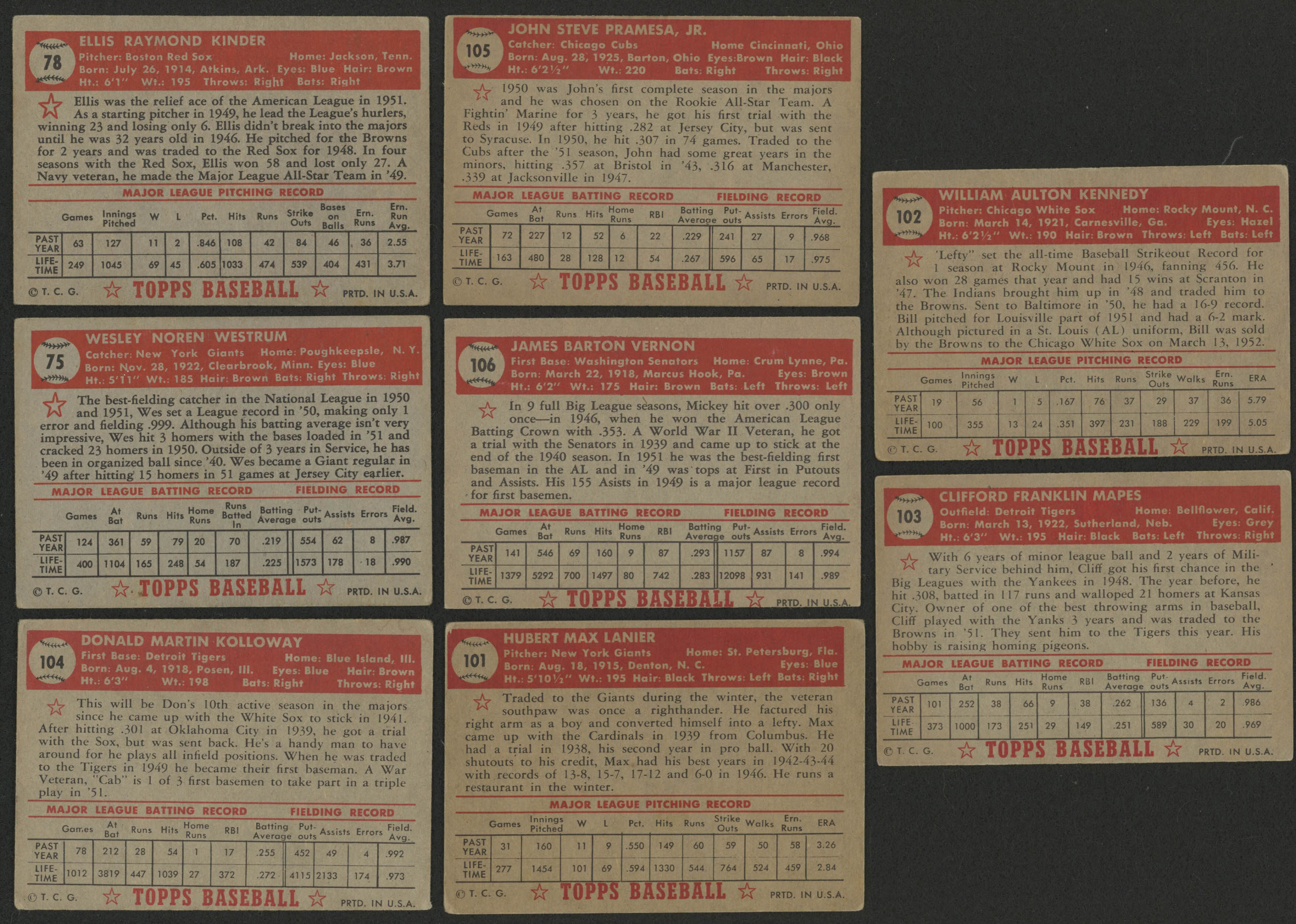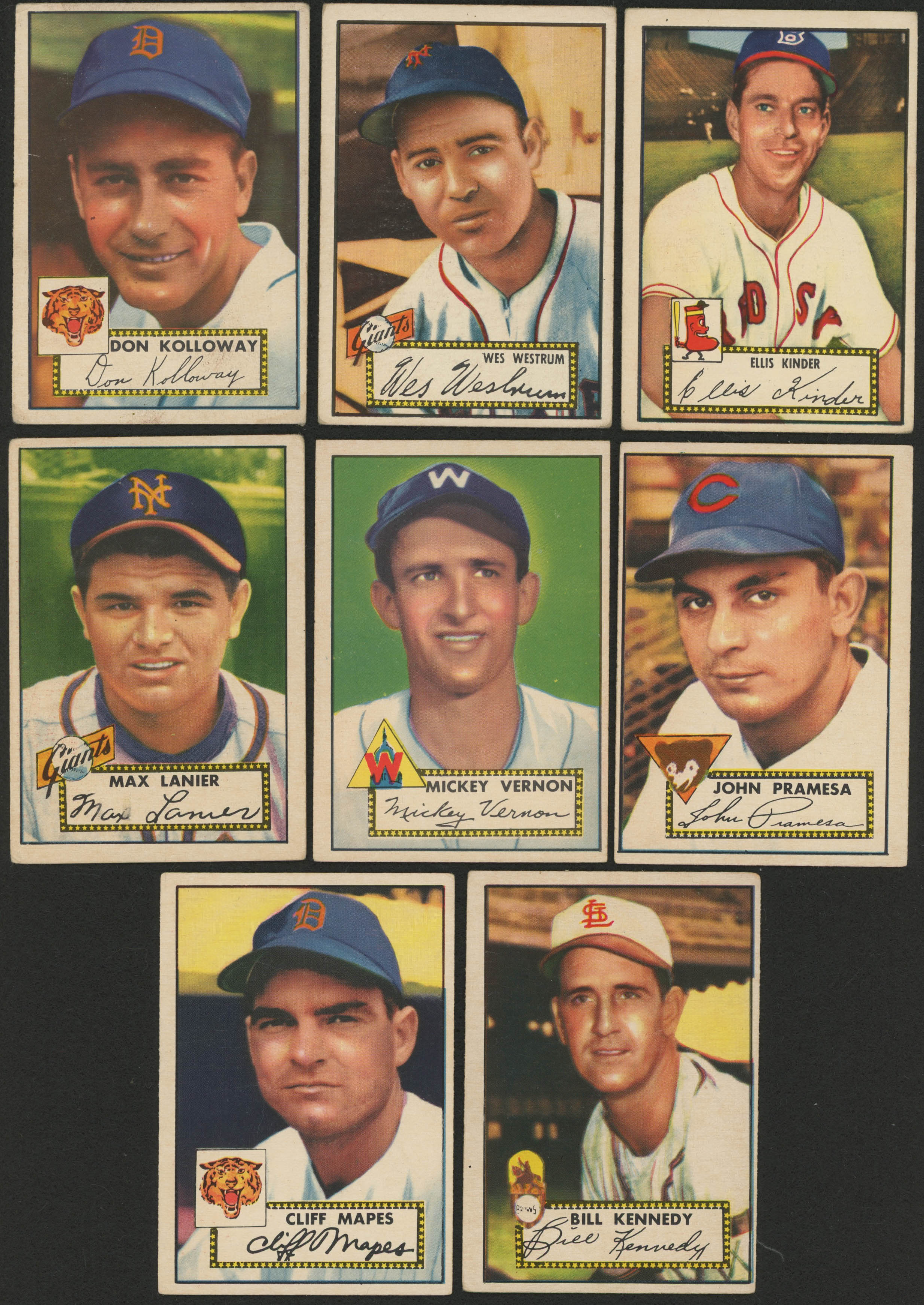 Lot of (8) 1952 Topps Baseball Cards with #103 Cliff Mapes, #102 Bill Kennedy, #105 John Pramesa, #106 Mickey Vernon, #101 Max Lanier