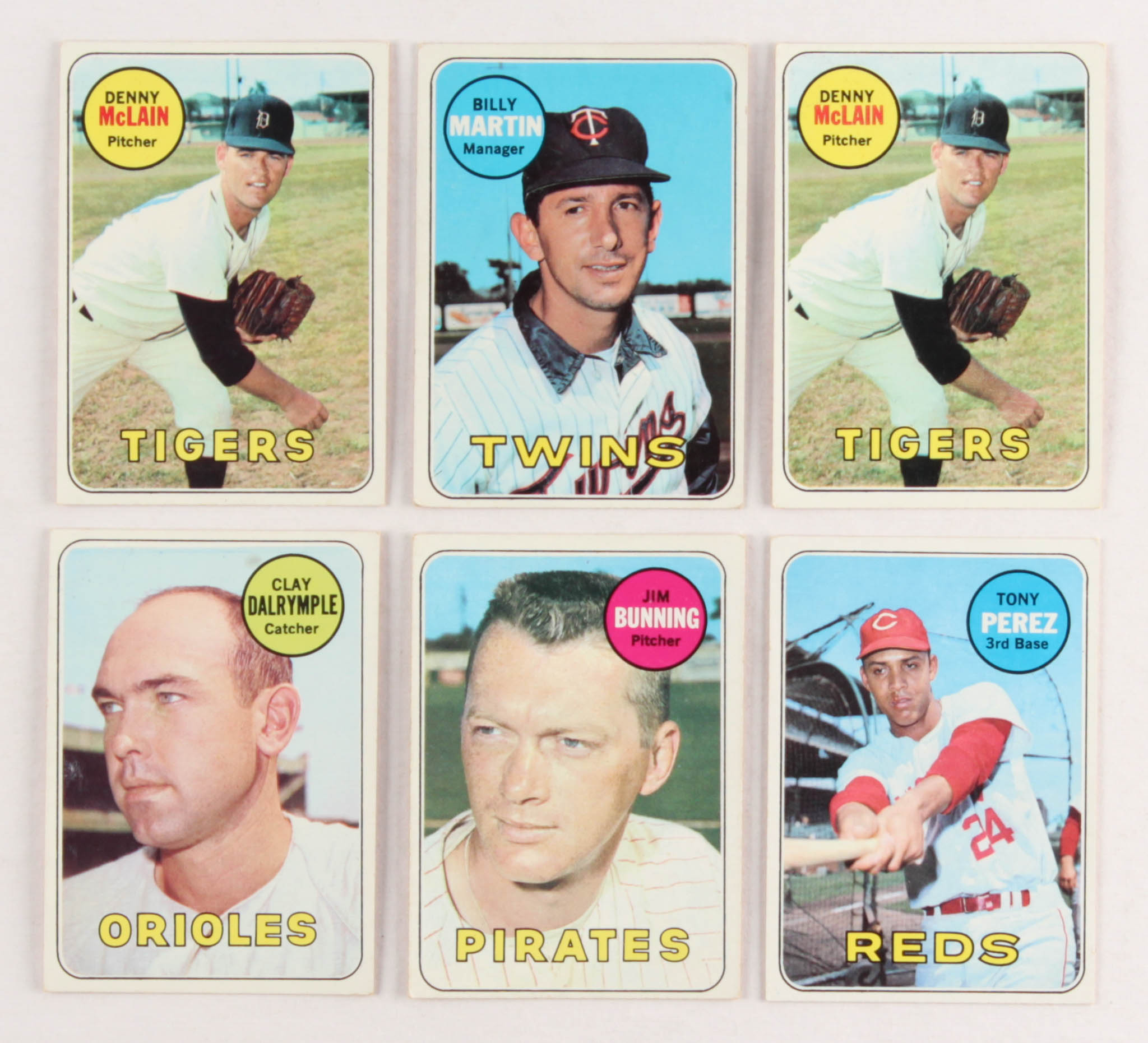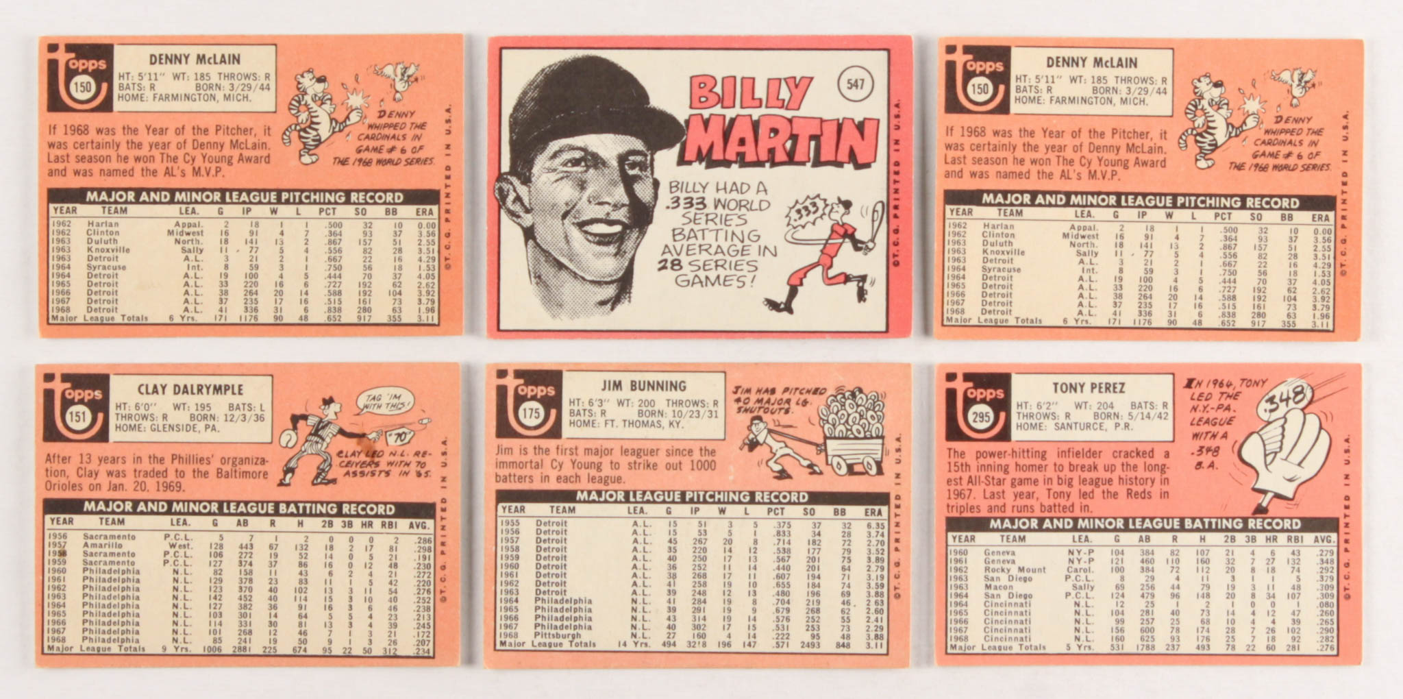 Lot of (6) 1969 Topps Baseball Cards with #150 Denny McLain, #547 Billy Martin, #151 Clay Dalrymple, #175 Jim Bunning, #295 Tony Perez