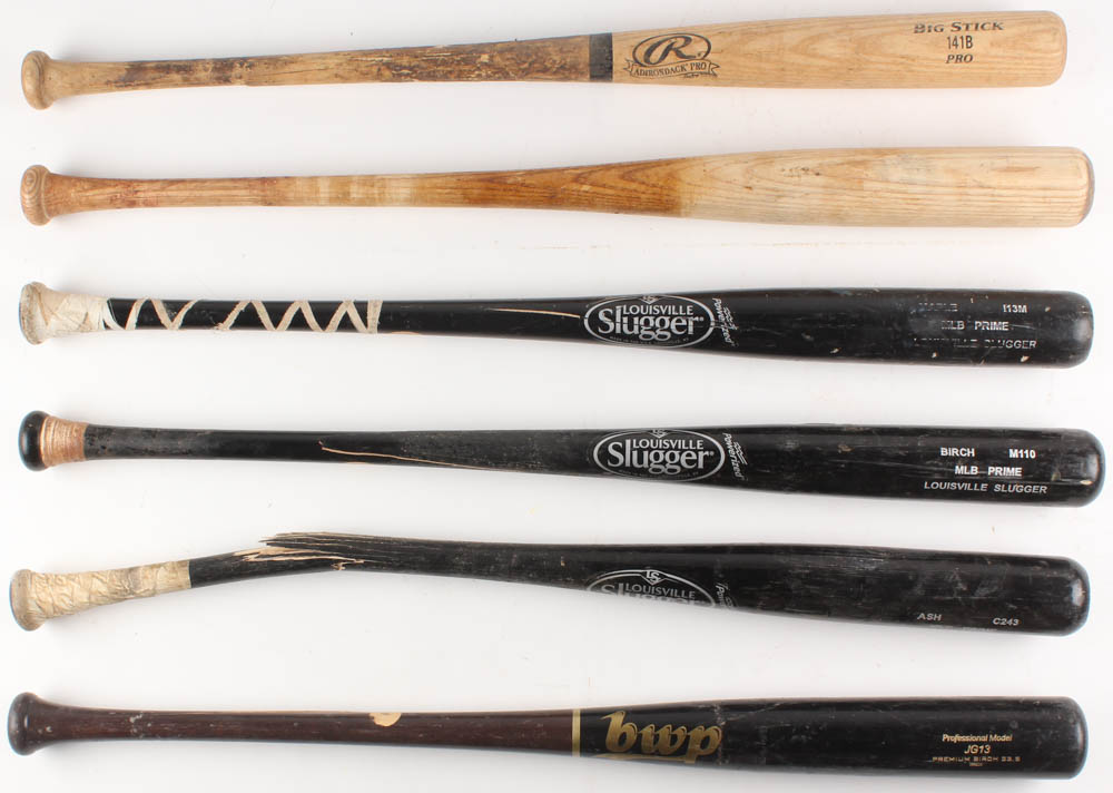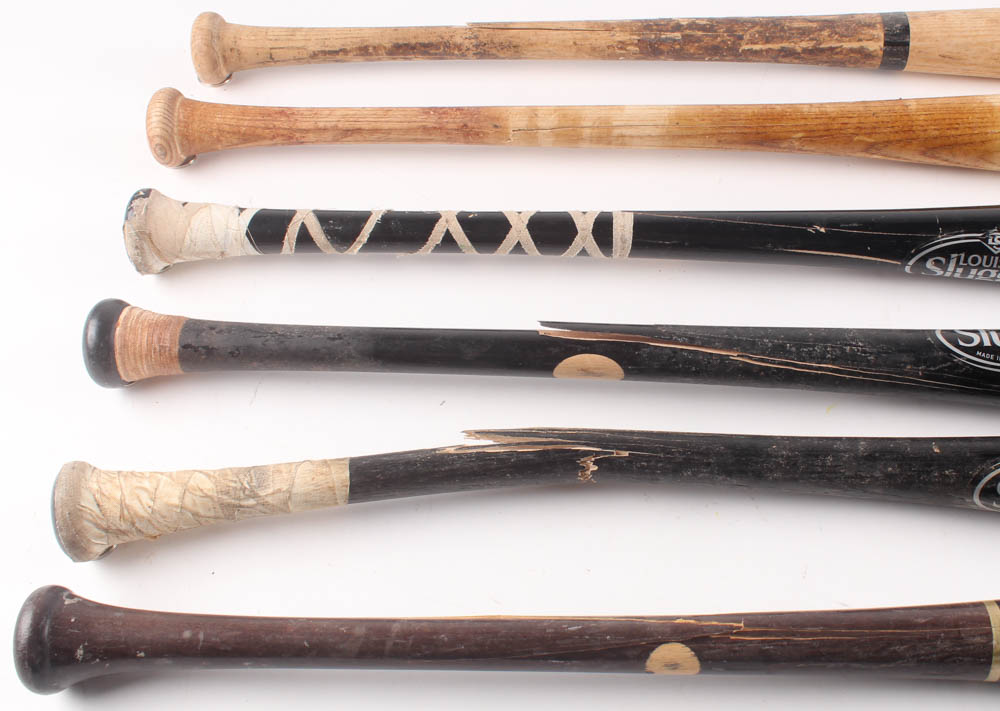 Lot includes all (6) Assorted game-used baseball bats. Lot includes (3) Louisville Slugger baseball bats, (1) BWP baseball bats, (1) Rawlings baseball bats, and (1) baseball bat. Baseball bats have been cracked and used by unknown players. Please see photos for details regarding the condition of the baseball bats.