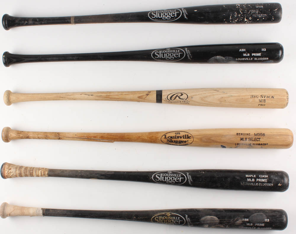 Lot includes all (6) Assorted game-used baseball bats. Lot includes (5) Louisville Slugger baseball bats and (1) Rawlings baseball bat. Baseball bats have been cracked and used by unknown players. Please see photos for details regarding the condition of the baseball bats.