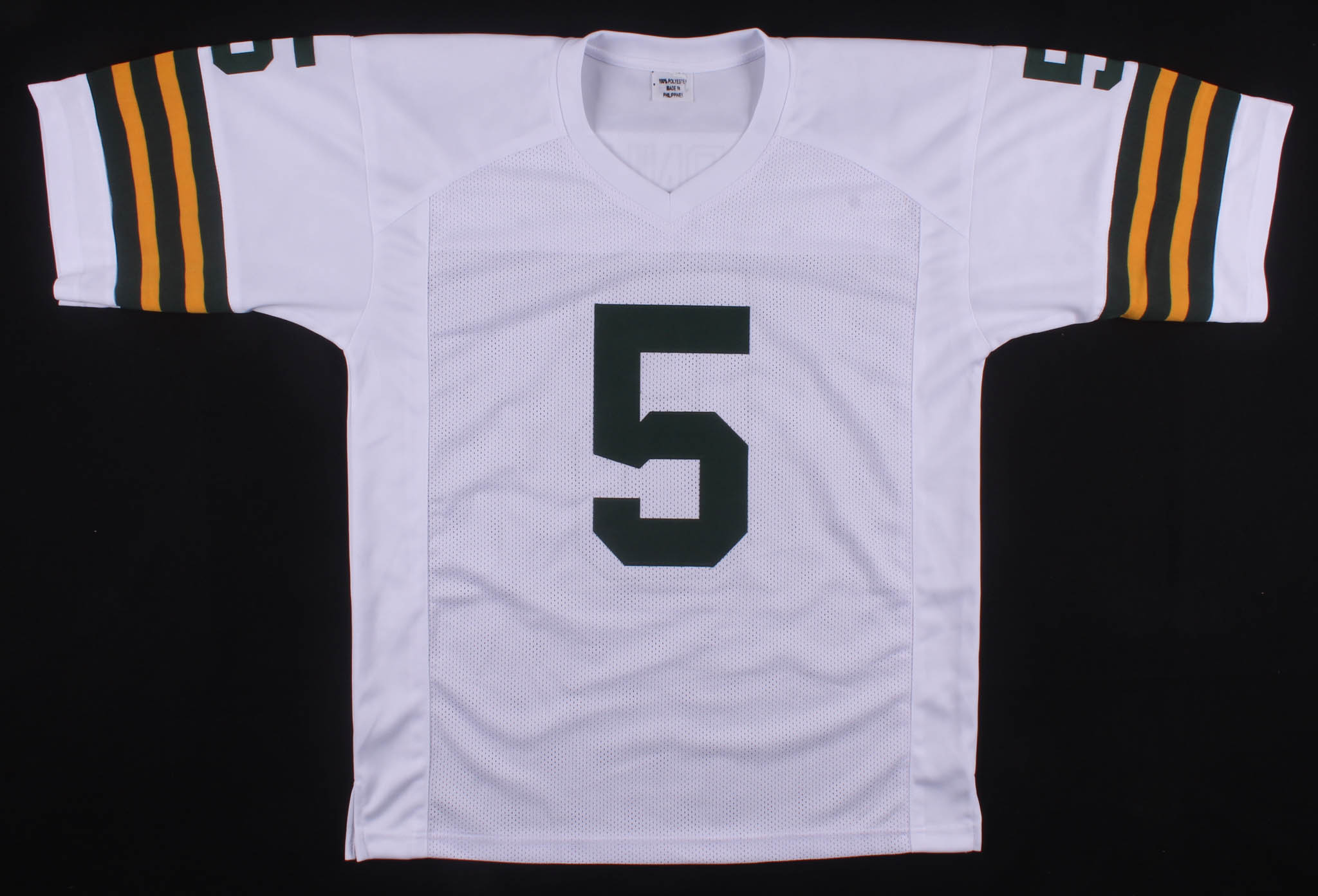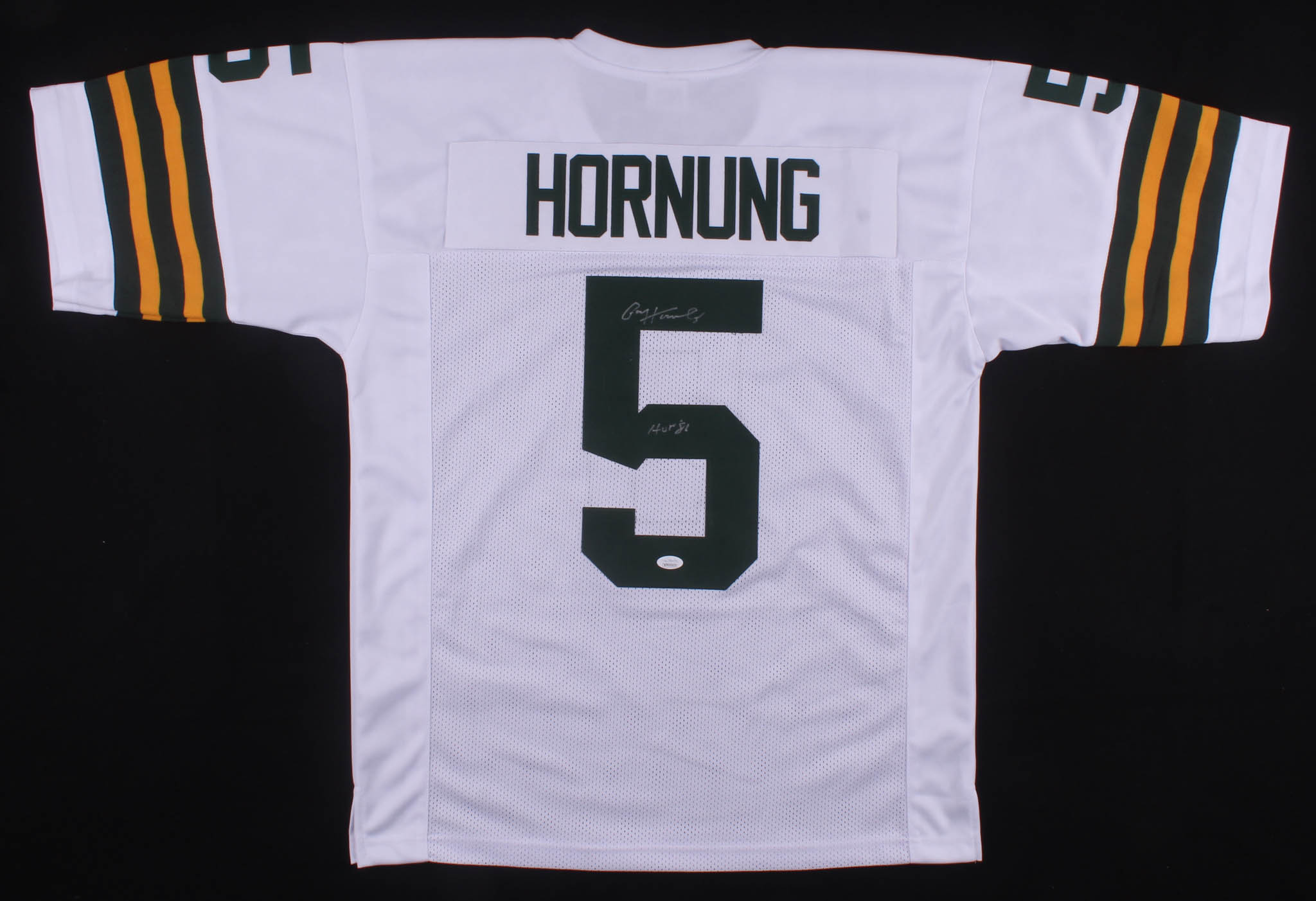Custom on-field style jersey. Everything is sewn on, size XL. Hand-signed and inscribed in silver paint pen by Paul Hornung (HOF).