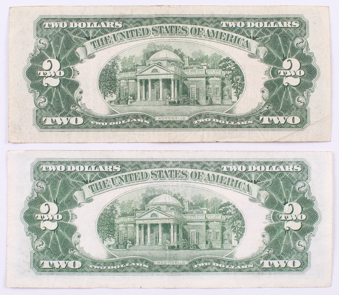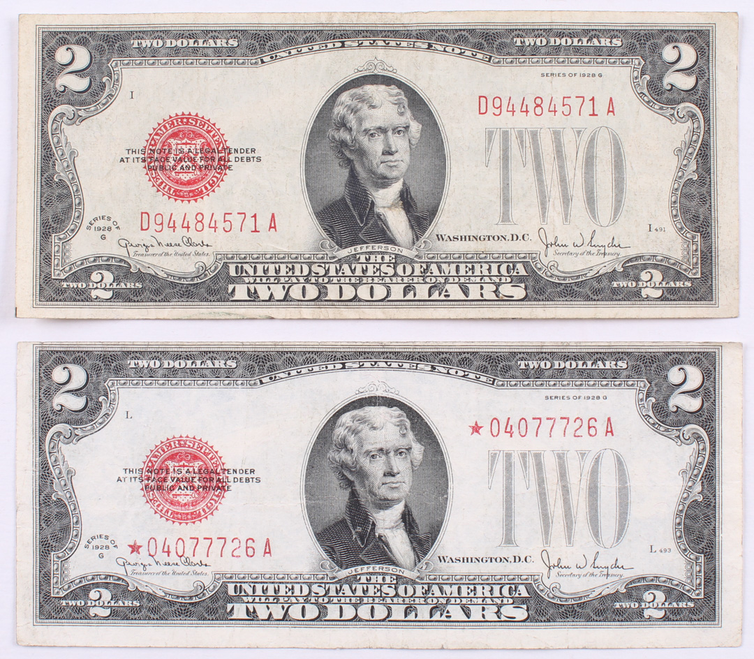 Lot of (2) 1928-G $2 Two Dollar Red Seal U.S. Bank Note Bills with (1) Star Note