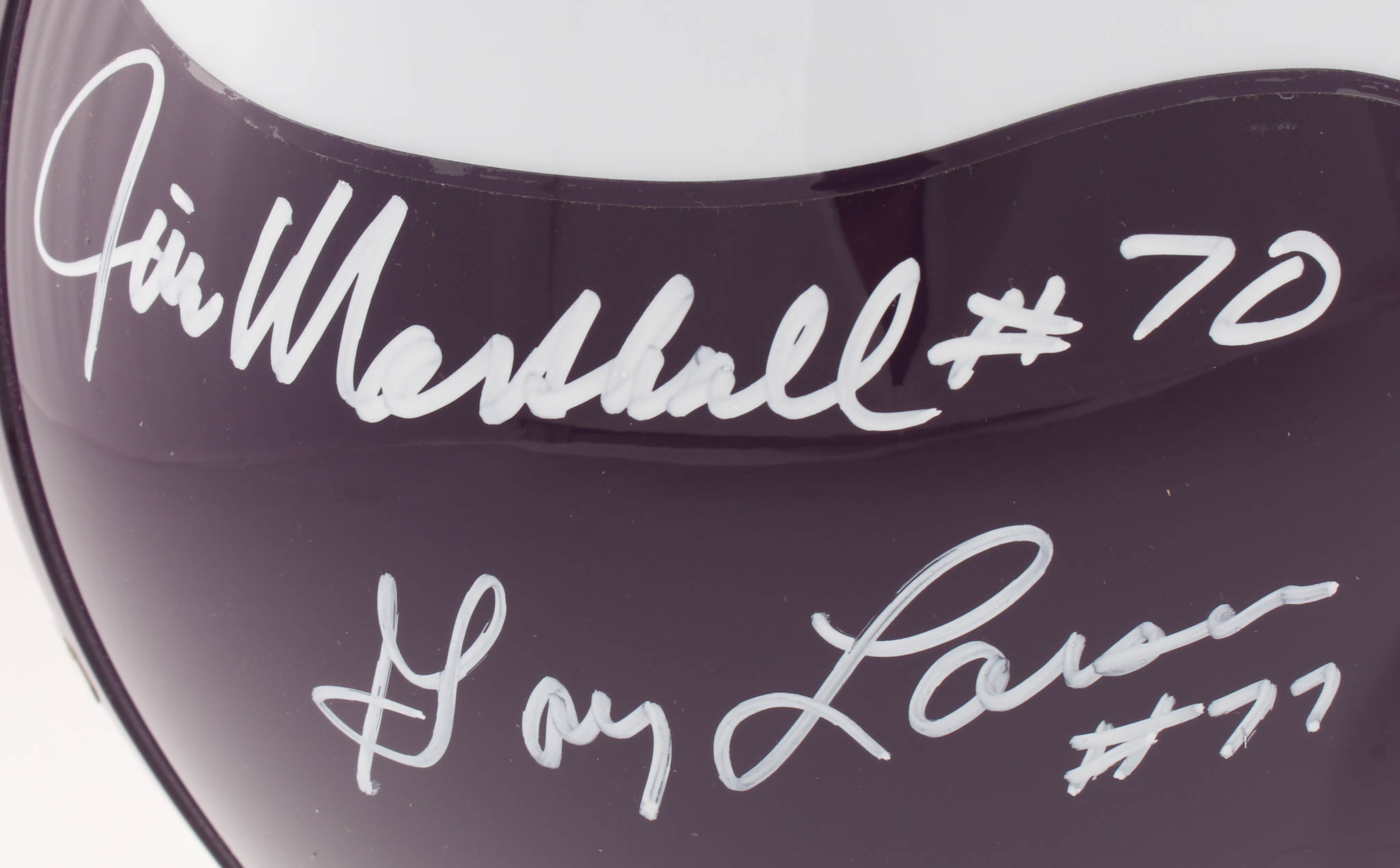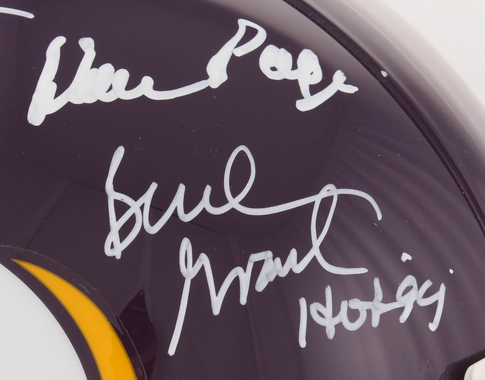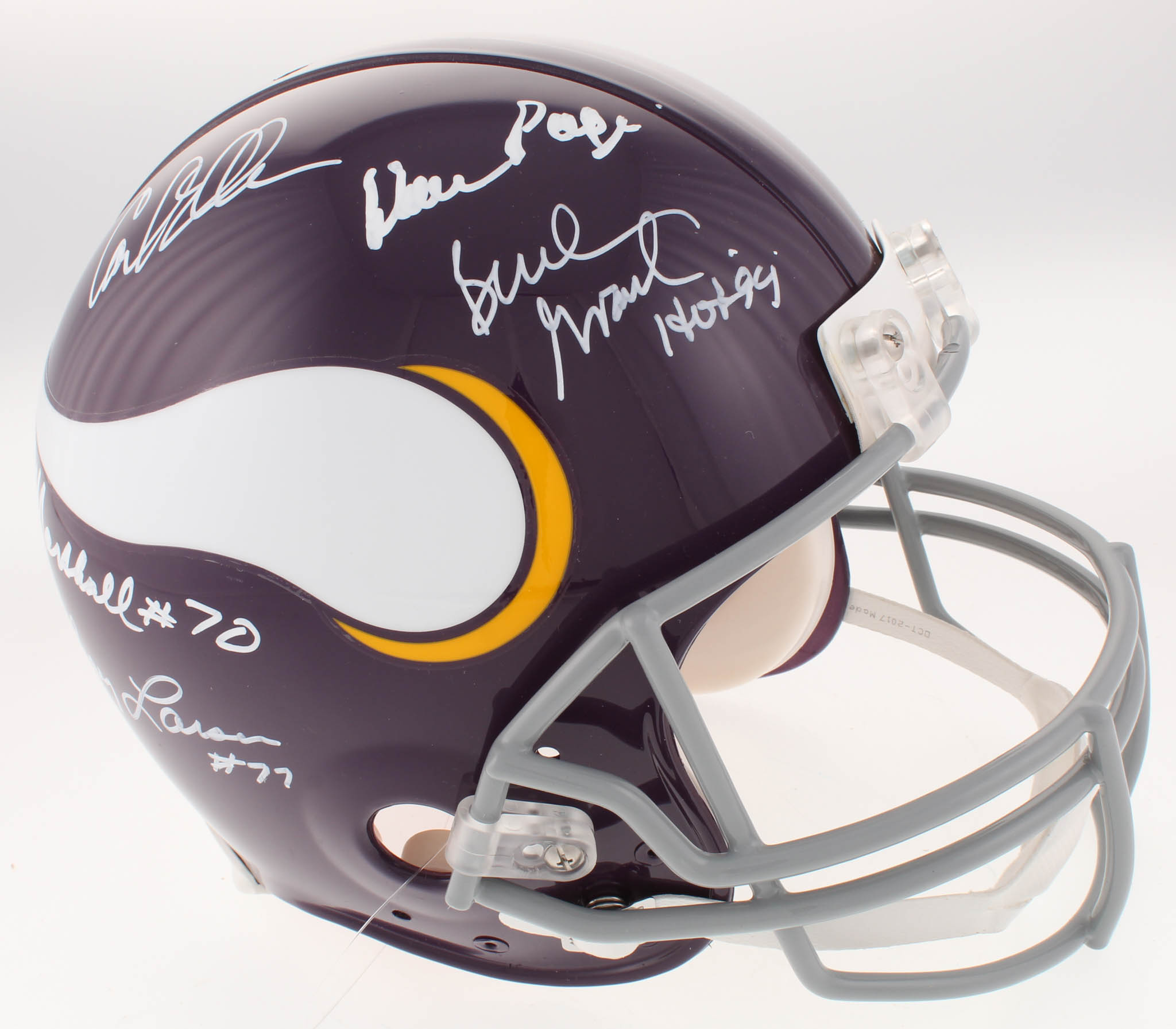 Riddell Minnesota Vikings full-size authentic on-field helmet has been hand-signed in white paint pen by Alan Page (HOF), Carl Eller (HOF), Jim Marshall, Gary Larsen and Bud Grant (HOF).