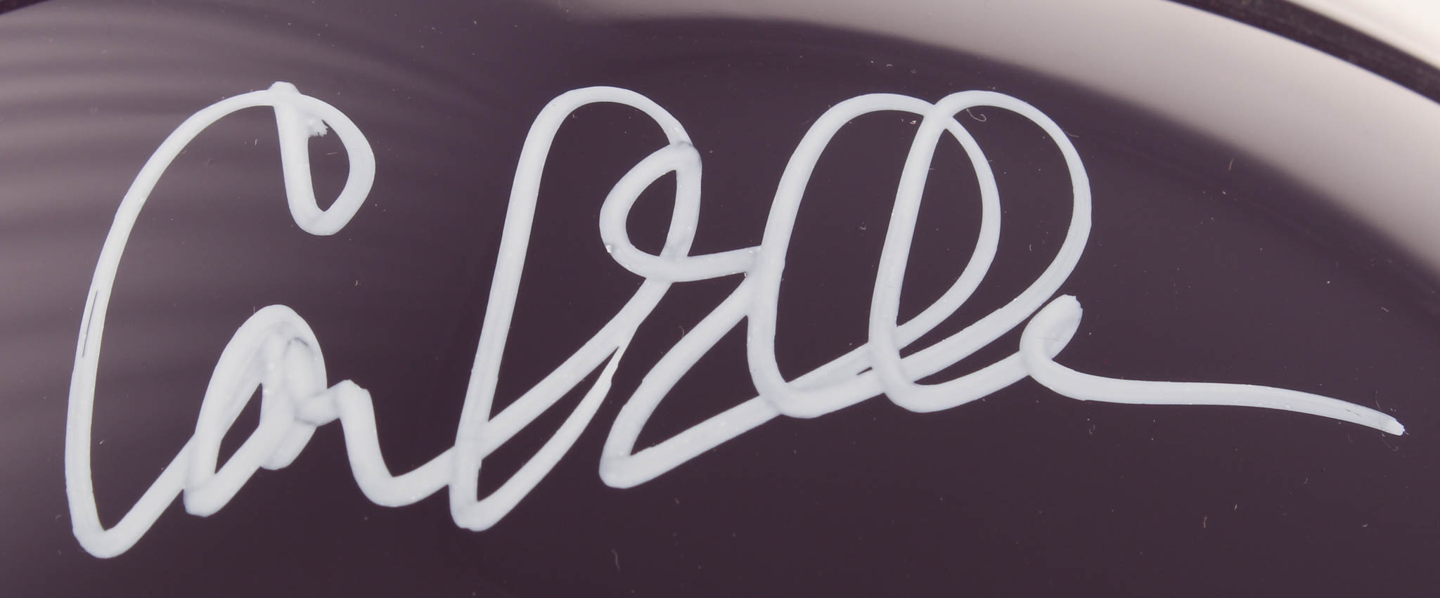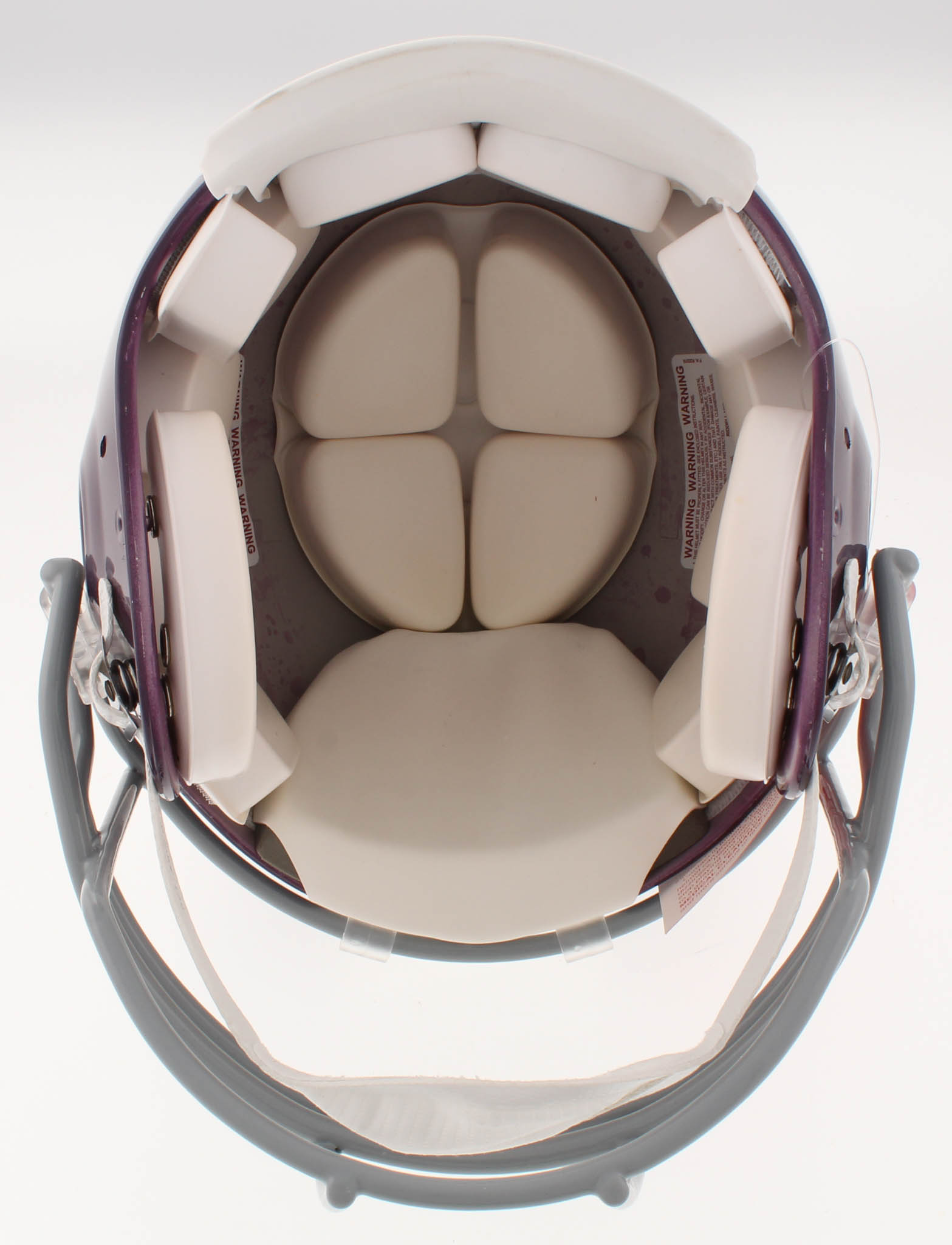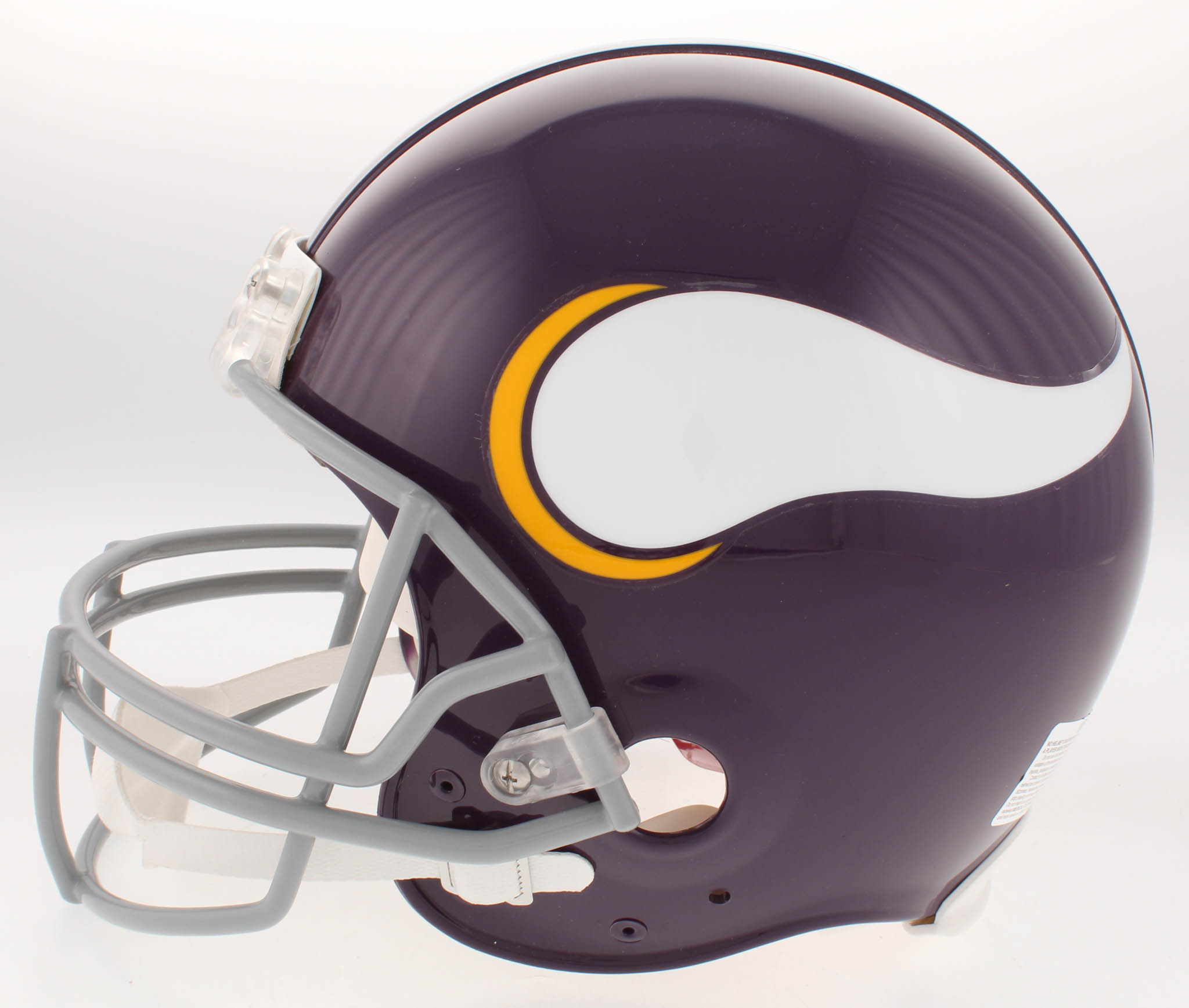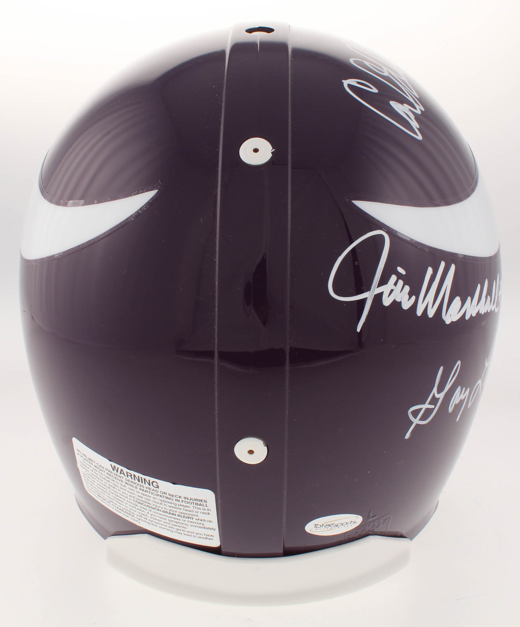 Riddell Minnesota Vikings full-size authentic on-field helmet has been hand-signed in white paint pen by Alan Page (HOF), Carl Eller (HOF), Jim Marshall, Gary Larsen and Bud Grant (HOF).
