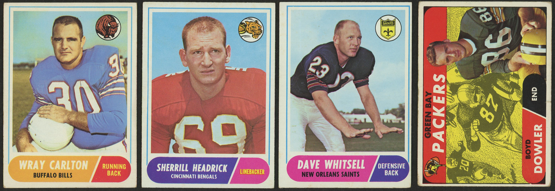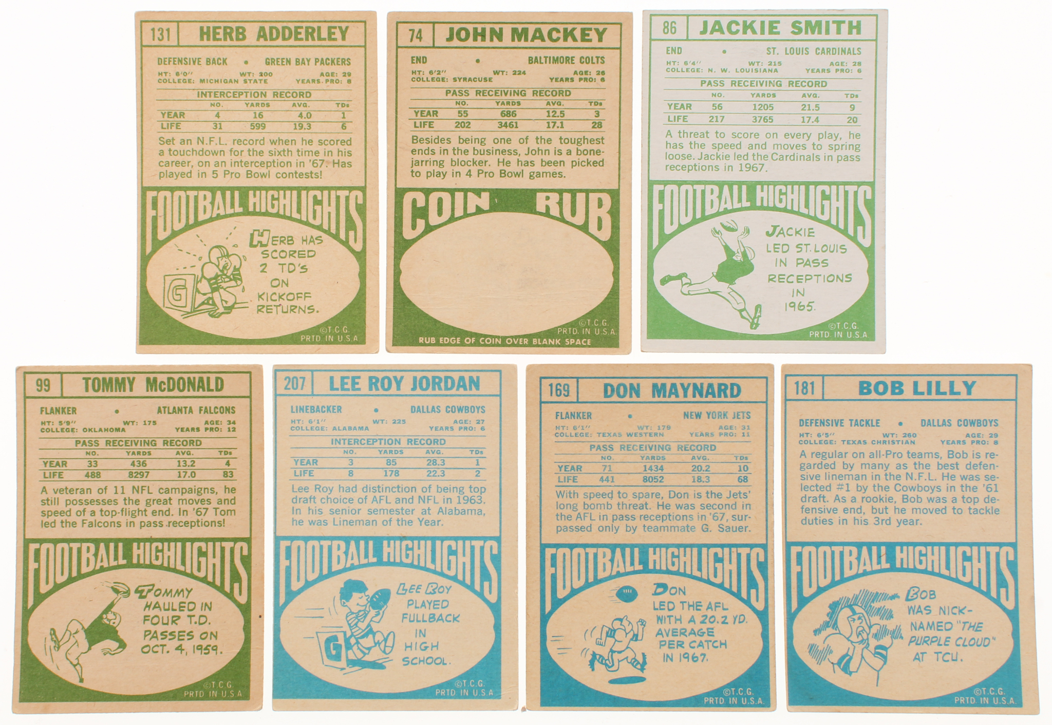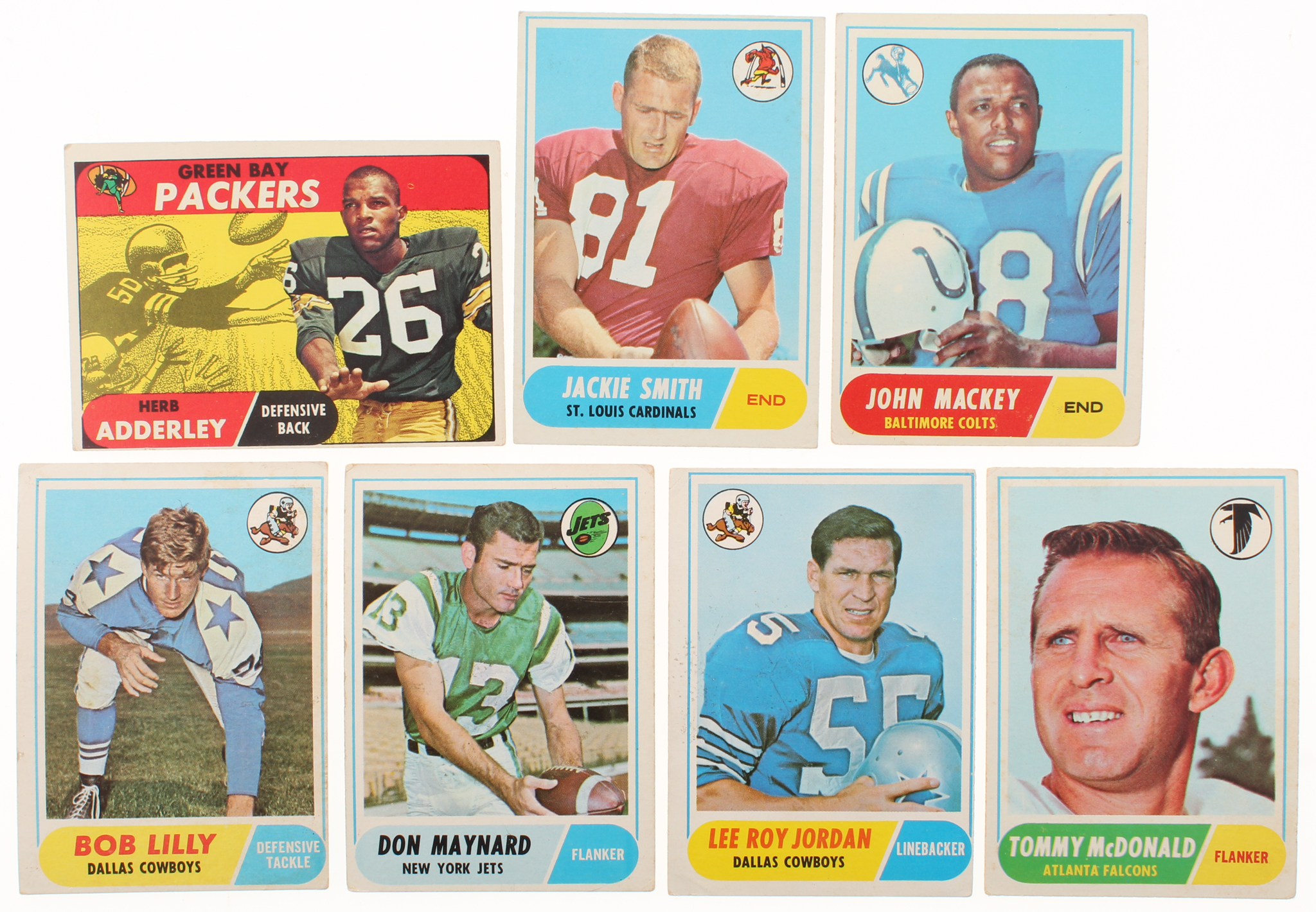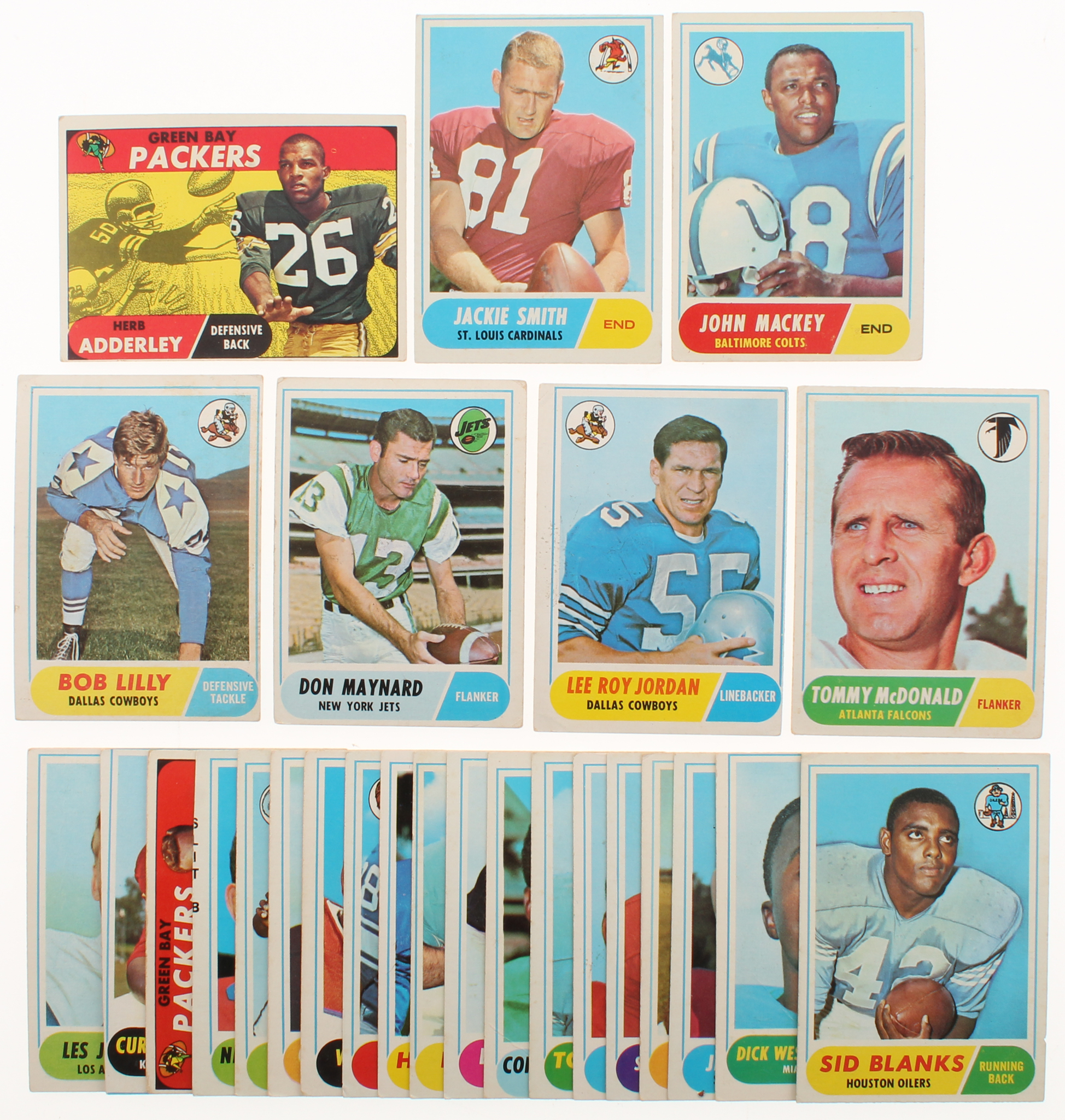 Lot of (26) 1968 Topps Football Cards with #86 Jackie Smith, #74 John Mackey, #131 Herb Adderley, #181 Bob Lilly, #99 Tommy McDonald, #207 Lee Roy Jordan