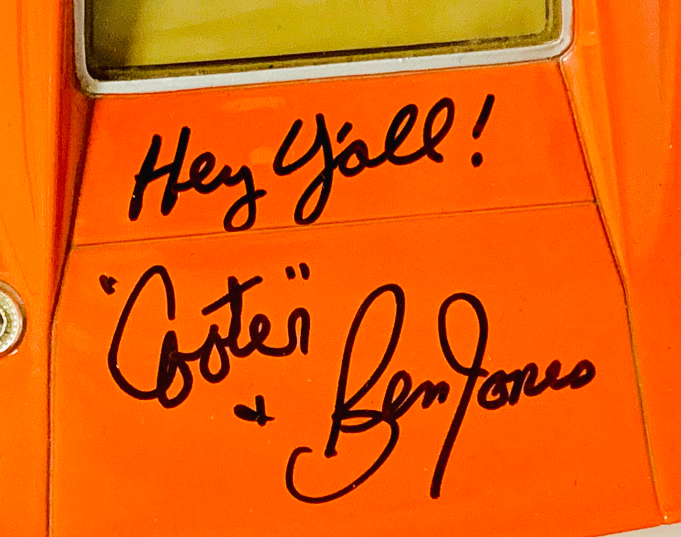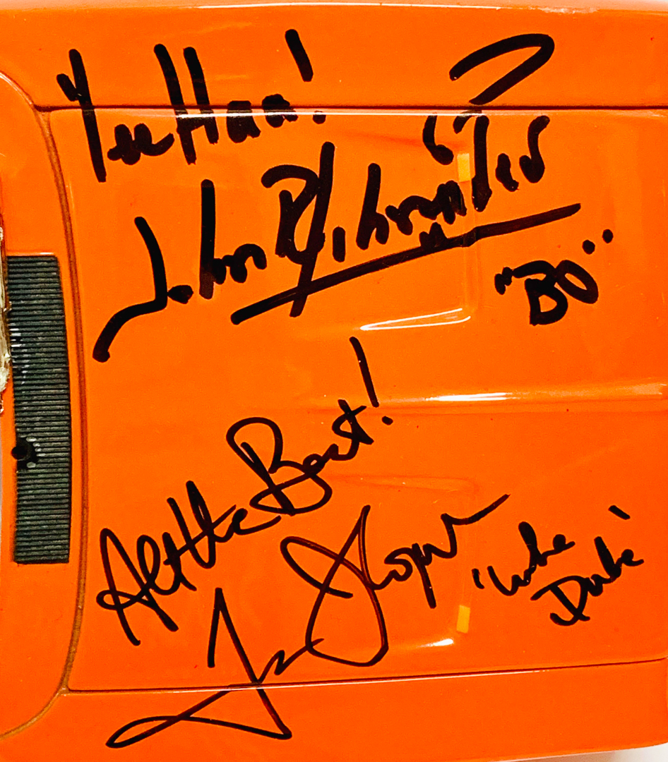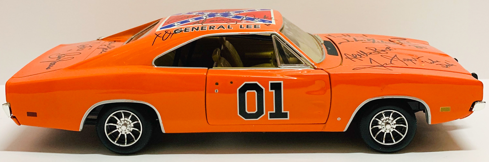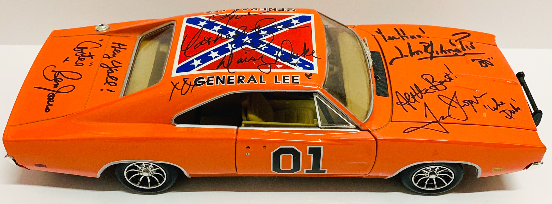 1:18 scale diecast General Lee, hand signed by the cast of “The Dukes Of Hazzard”. Tom Wopat, Catherine Bach, John Schneider, and Ben Jones all signed in black fiber tip marker. Additionally, Catherine Bach inscribed “Love, Daisy Duke”; Tom Wopat inscribed “All the Best, Luke Duke”; John Schneider inscribed “Yee Haw! Bo”; and Ben Jones inscribed “Hey Y’all, Cooter”.