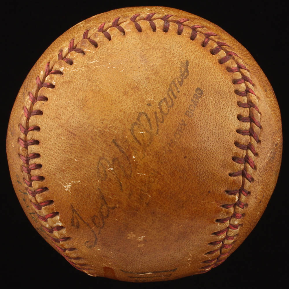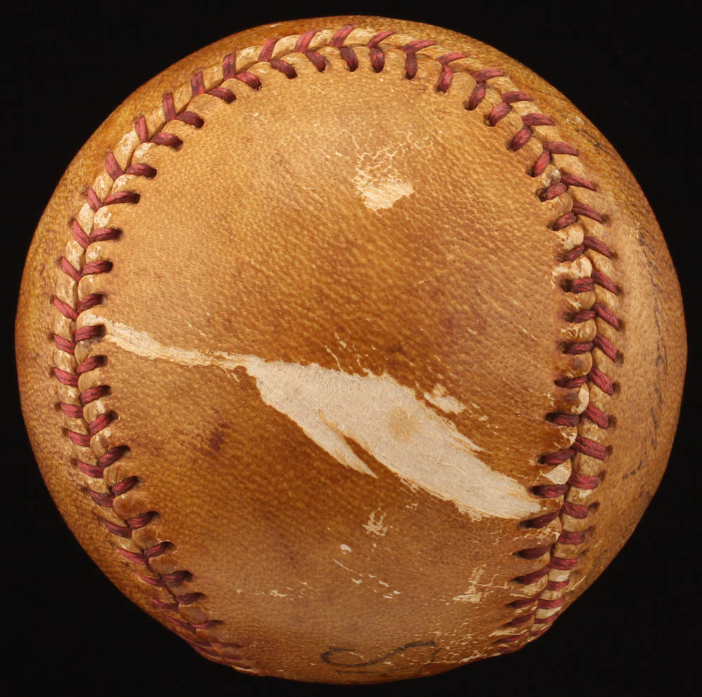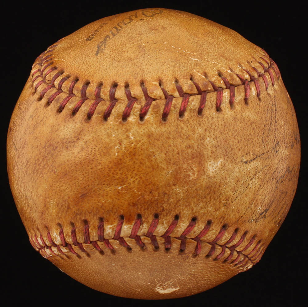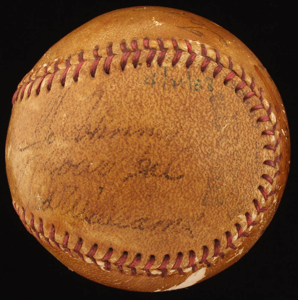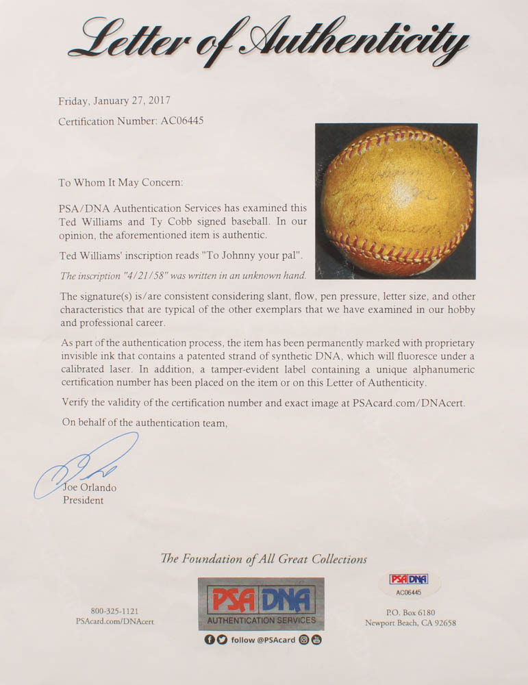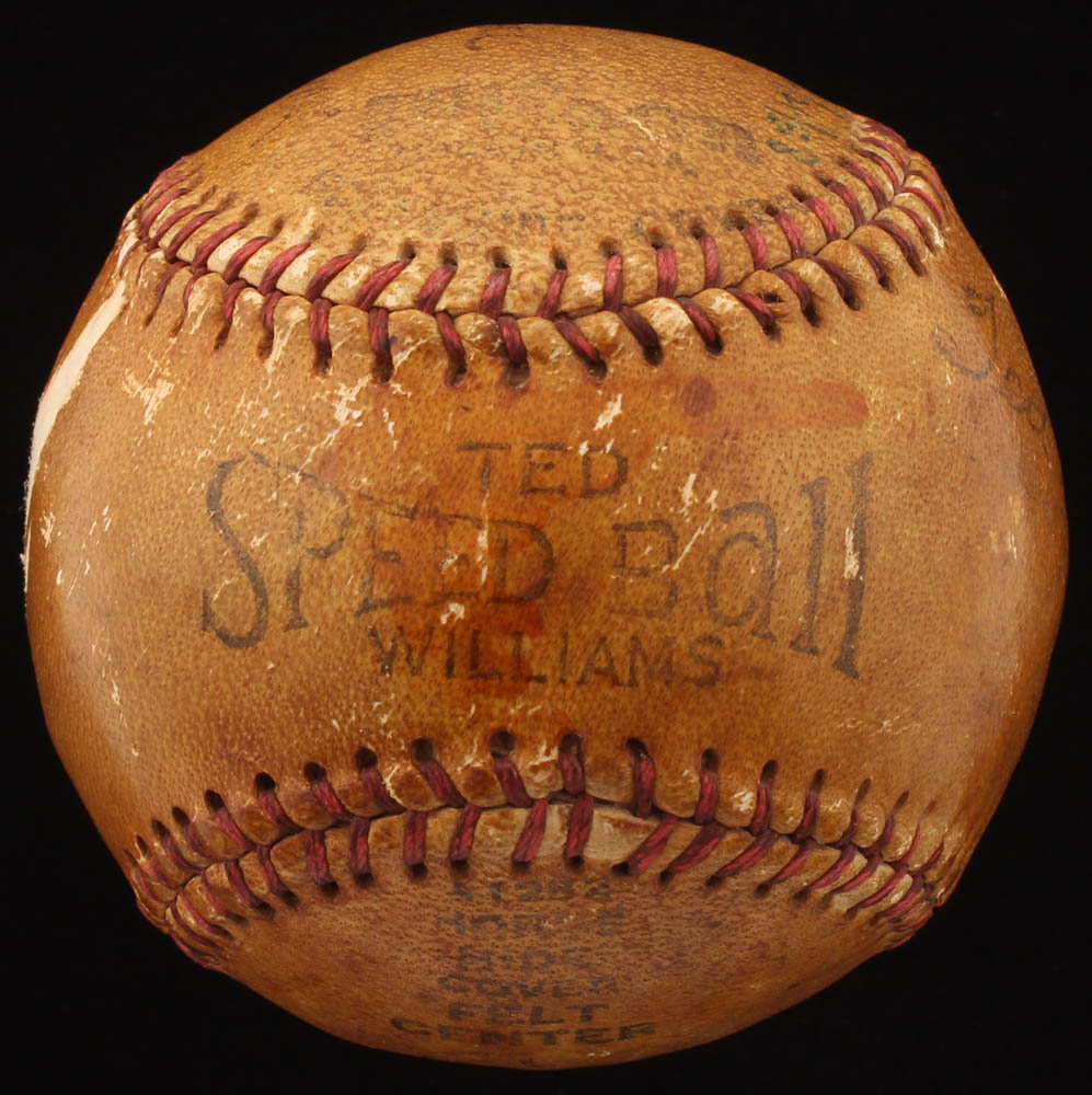 Ted Williams Speed Ball baseball has been hand-signed by Ty Cobb (D. 1961, HOF) and by Ted Williams (D. 2002, HOF). Please see photos for information regarding condition of the baseball. Please note, Williams' inscription has been personalized "to Johnny" and an additional inscription was written in an unknown hand.