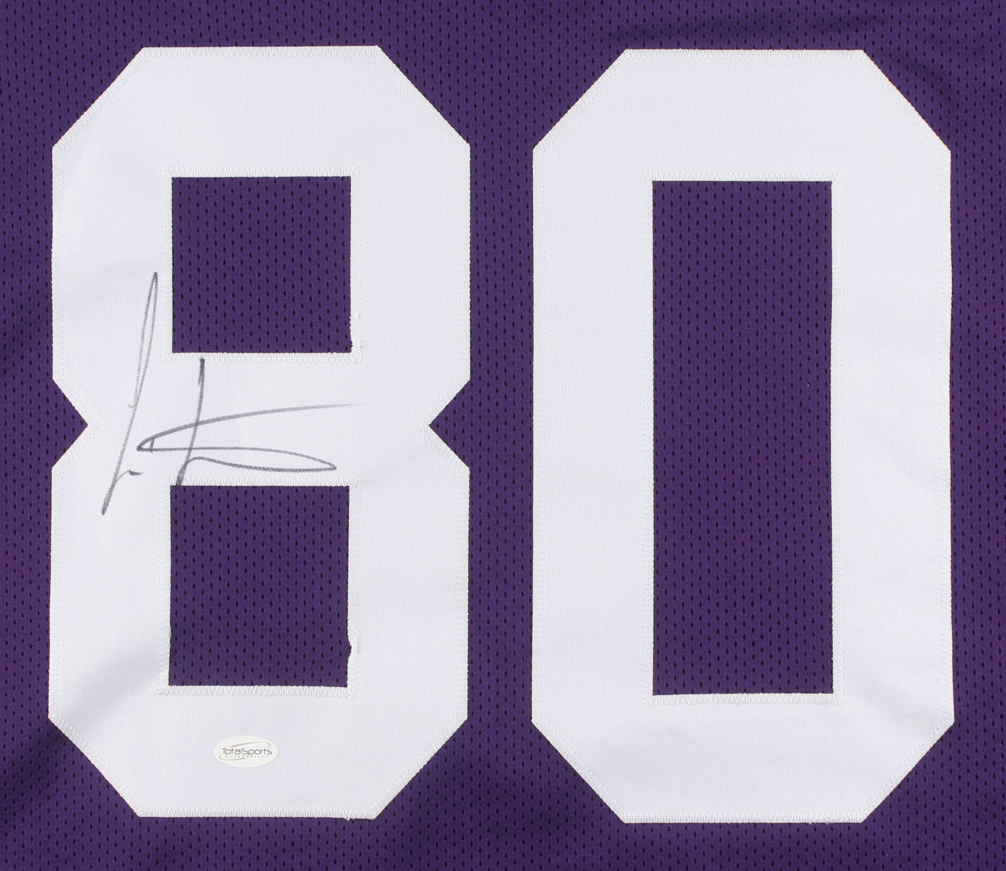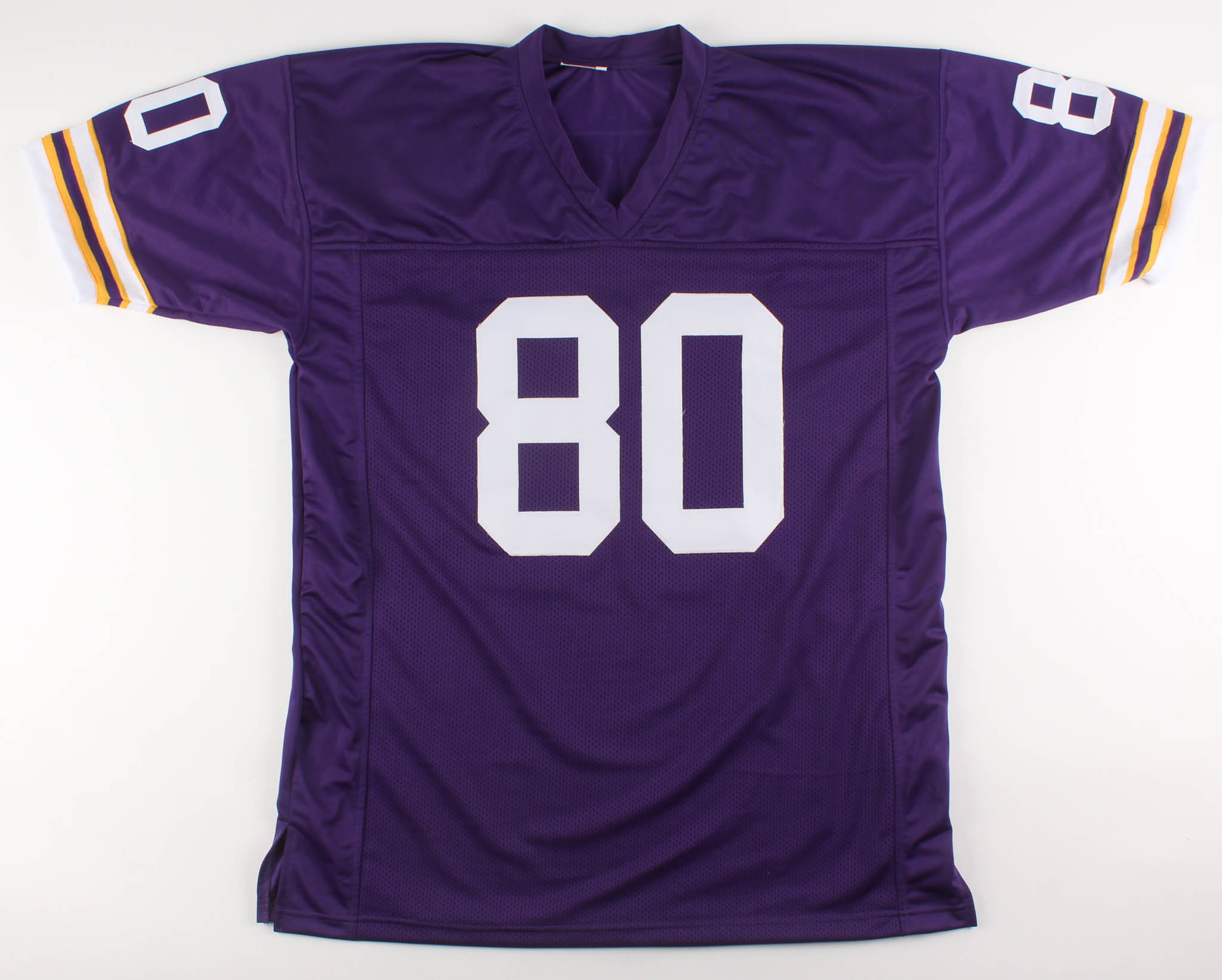 Custom on-field style jersey. Everything is sewn on, size XL. Hand-signed in black felt-tip pen by Cris Carter (HOF).