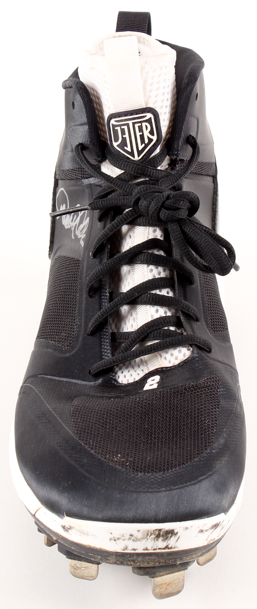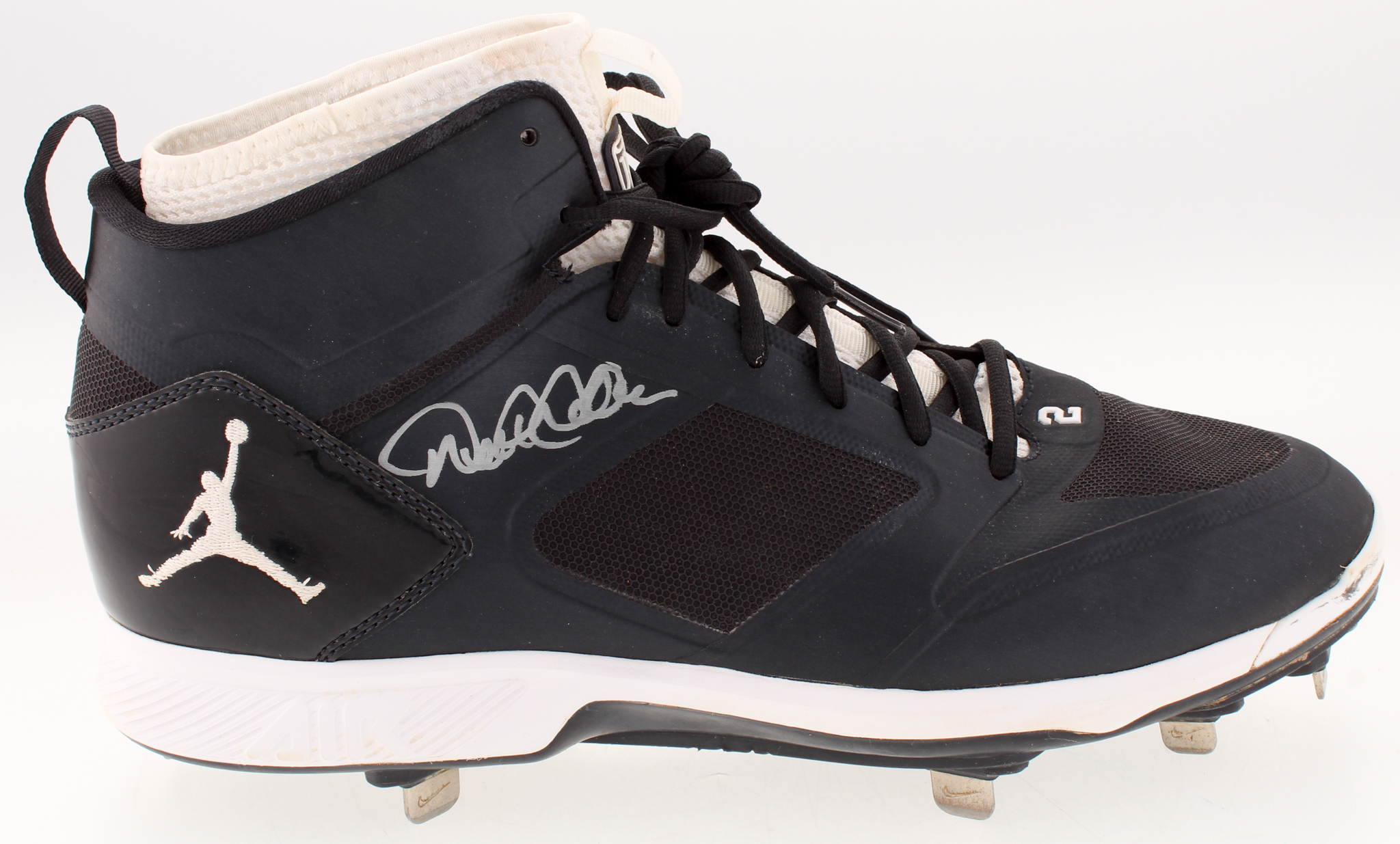 Air Jordan shoe has been hand-signed in silver paint pen by Derek Jeter (New York Yankees).