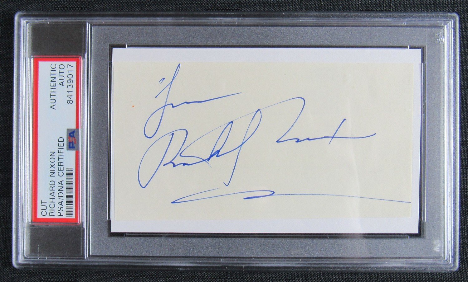 Cut has been hand-signed in blue felt-tip pen by Richard Nixon (D. 1994). Please see photos for details regarding the condition of the card.