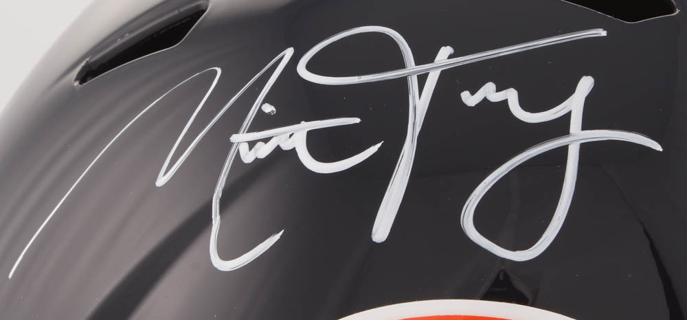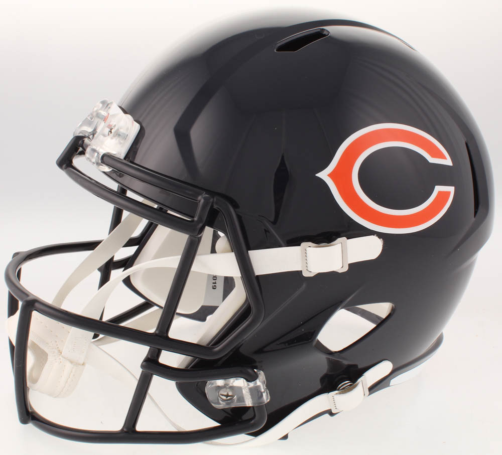 Riddell Chicago Bears full-size replica speed helmet. Hand-signed in white paint pen by Mitch Trubisky.