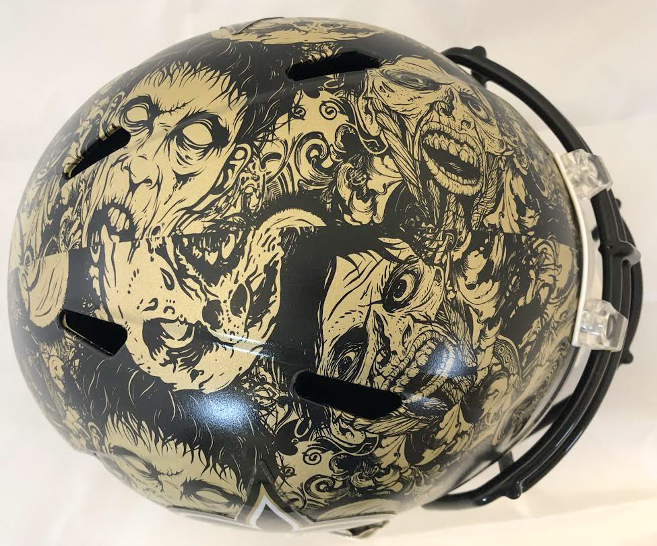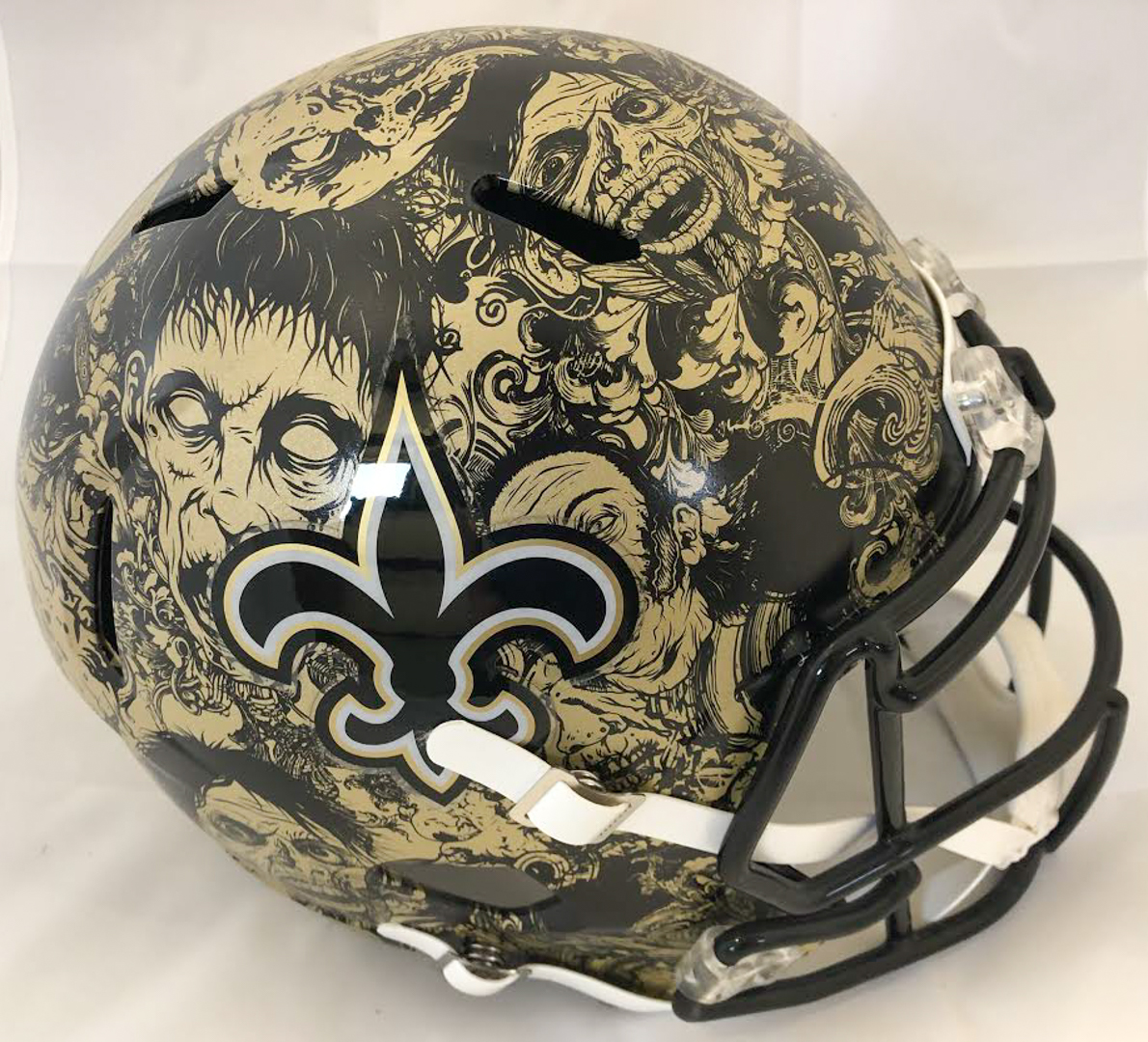 New Orleans Saints Riddell Hydro Dipped full-size replica speed helmet. Please note, the helmet is unsigned.