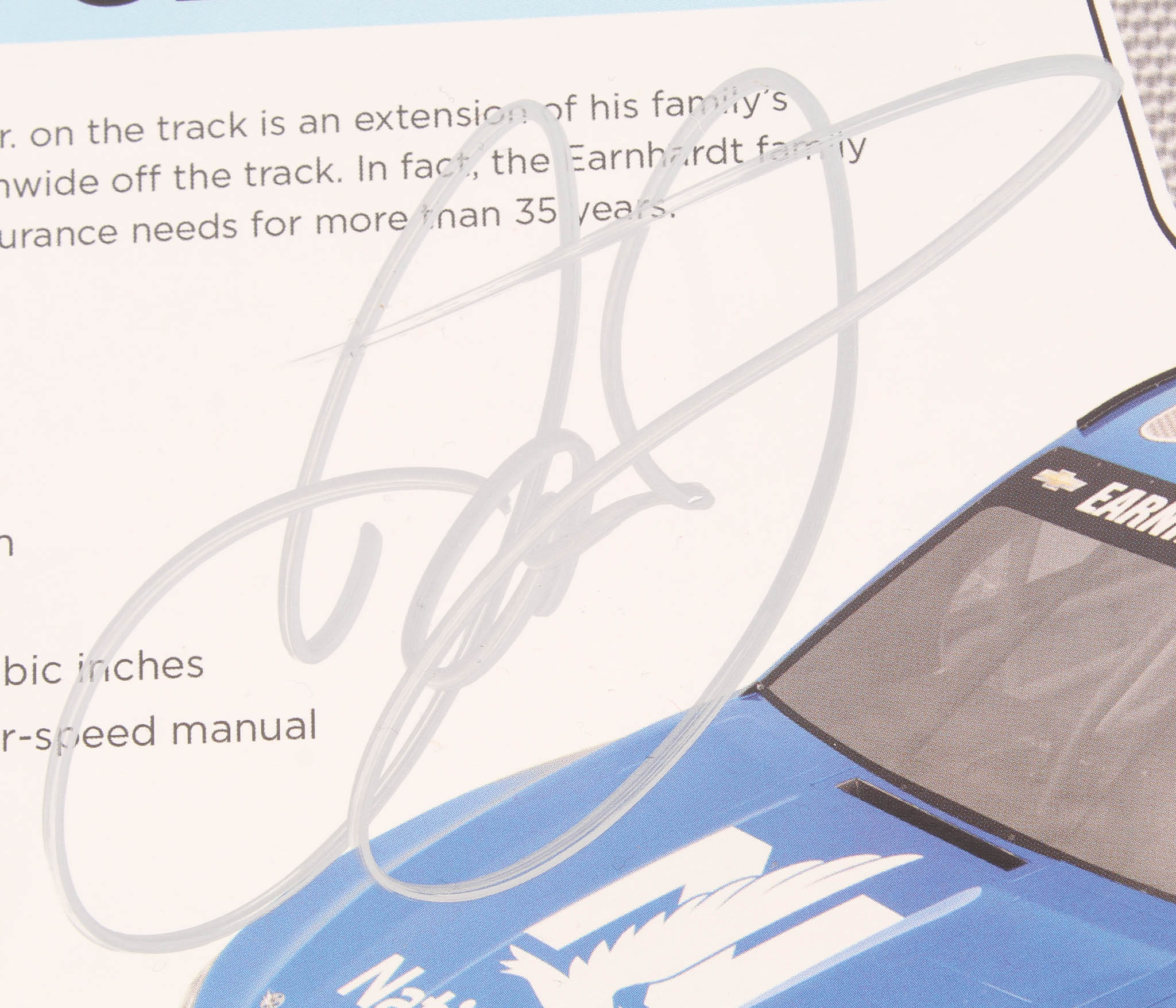 Display sign measures 9" x 10" in size and has been hand-signed in silver paint pen by Dale Earnhardt Jr. Please note, display shows signs of minor wear.