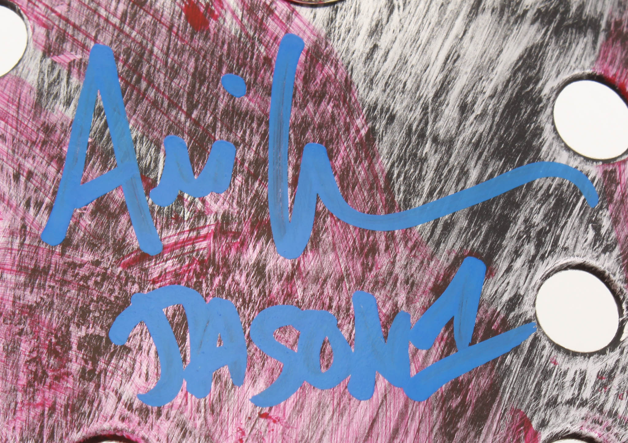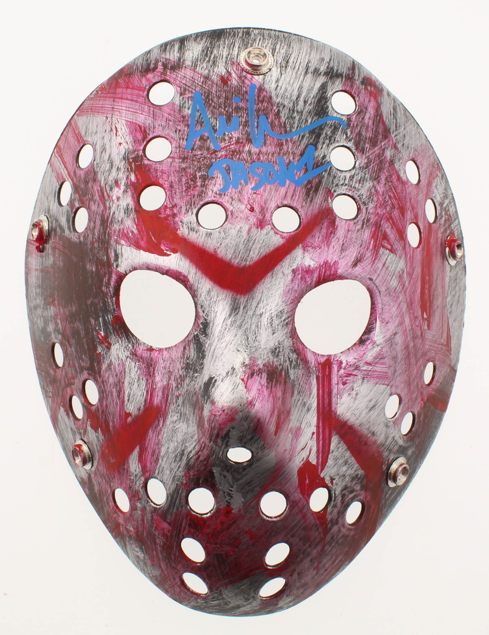 Full-size custom replica "Jason" mask. Hand-signed and inscribed in blue paint pen by Ari Lehman (Jason Voorhees).