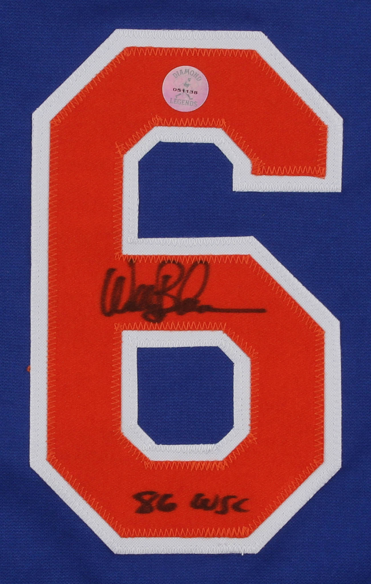 Custom on-field style jersey. Everything is sewn on, size XL. Hand-signed and inscribed in black felt-tip pen by Wally Backman.