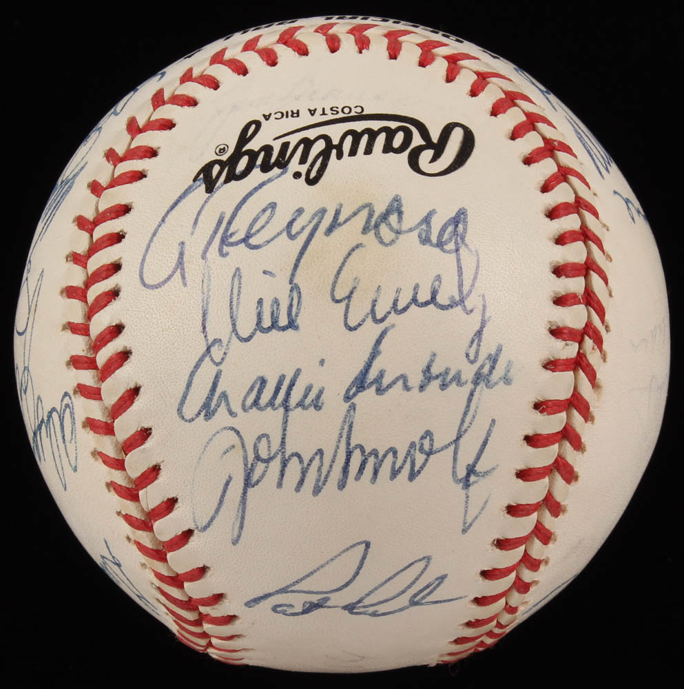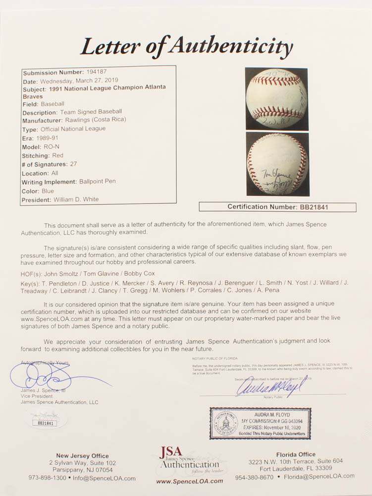 Rawlings Official National League Baseball. Hand-signed in blue ink pen by (27) members of the 1991 Atlanta Braves team including John Smoltz, Tom Glavine, Bobby Cox, Terry Pendleton, David Justice, Kent Mercker, Steve Avery, Armando Reynoso, Juan Berenguer, Lonnie Smith, Ned Yost, Jerry Willard, Jeff Treadway, Charlie Leibrandt, Jim Clancy, Tommy Gregg, Mark Wohlers, Pat Corrales, Chipper Jones, Alejandro Peña and (7) others.