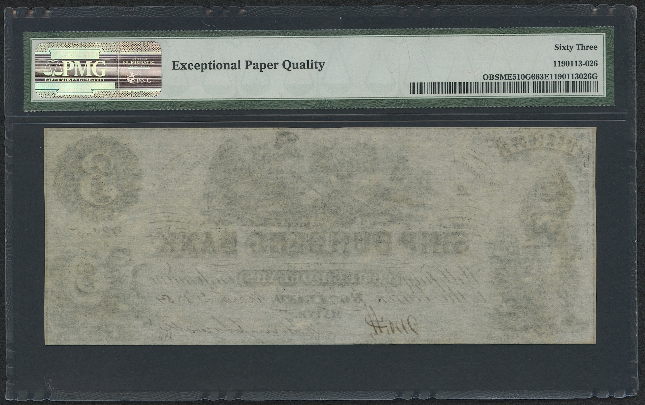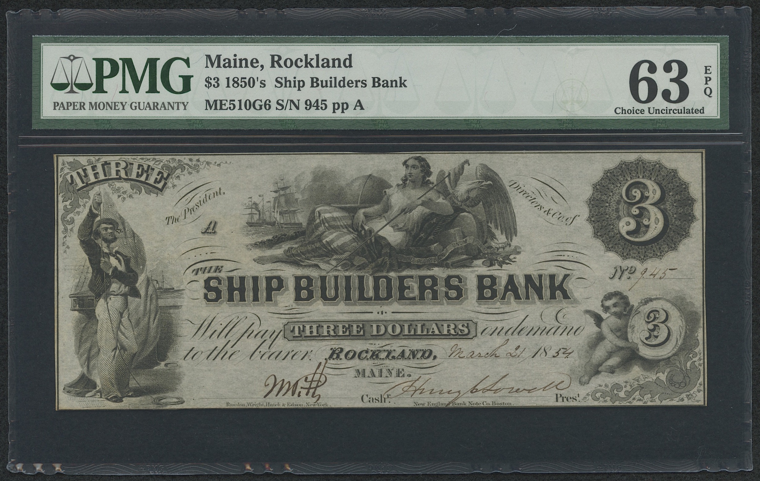 1850's $3 Three Dollars - Maine, Rockland - Ship Builders Bank - Bank Note Bill (PMG 63) (EPQ)