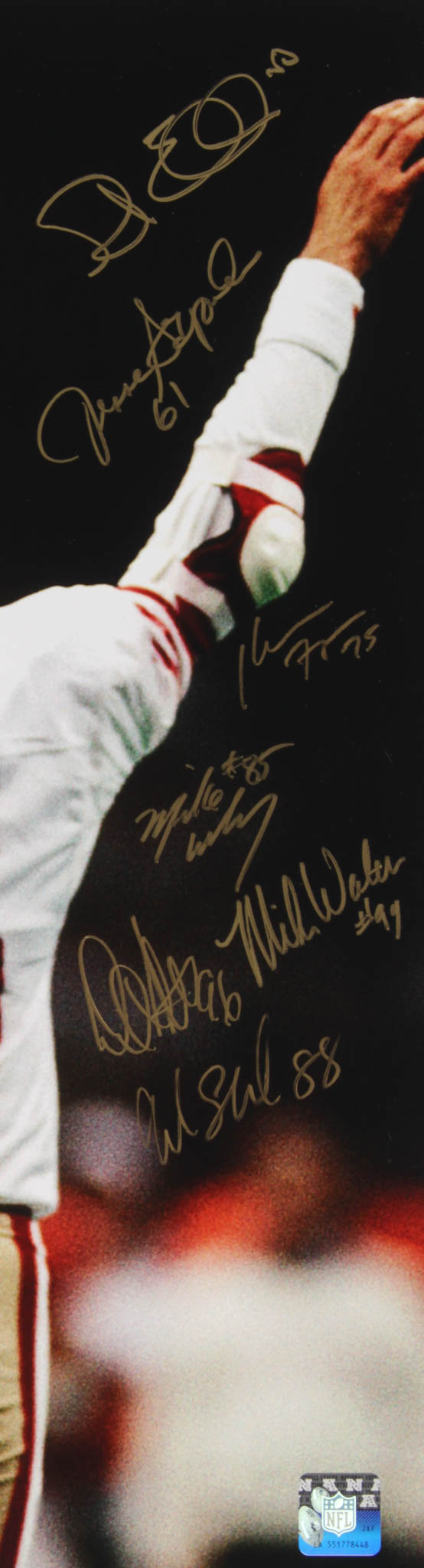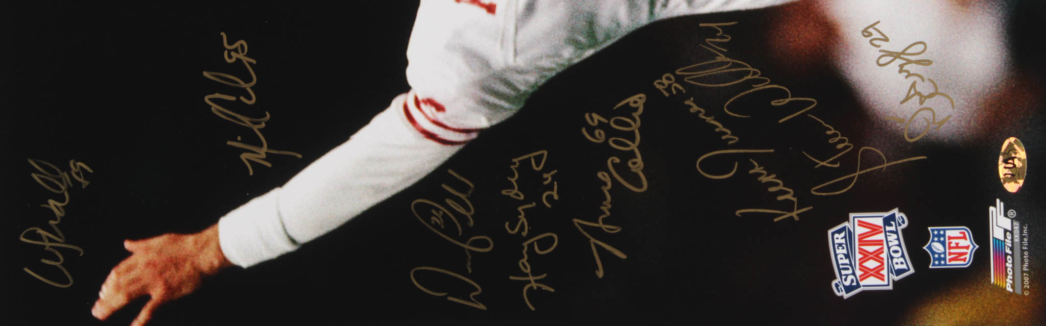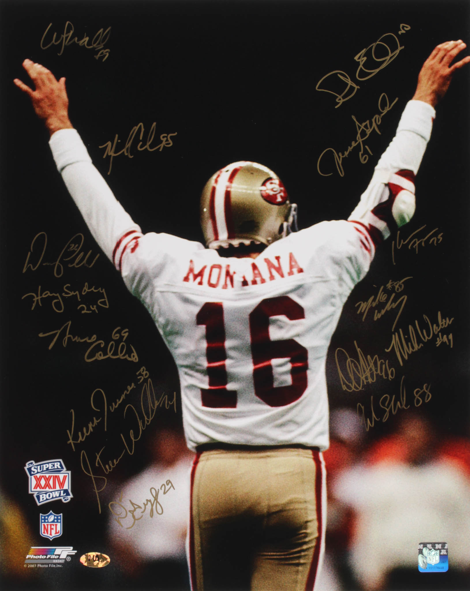 Photo measures 16" x 20" and has been hand signed in gold paint pen by (15) members of the 1989 San Francisco 49ers, including Don Griffin, Jesse Sapolu, Darryl Pollard, Wesley Walls, Kevin Fagan, Mike Wilson, Michael Carter, Danny Stubbs, Michael Walter, and (5) others. Please note, Joe Montana's autograph is not included with the item.