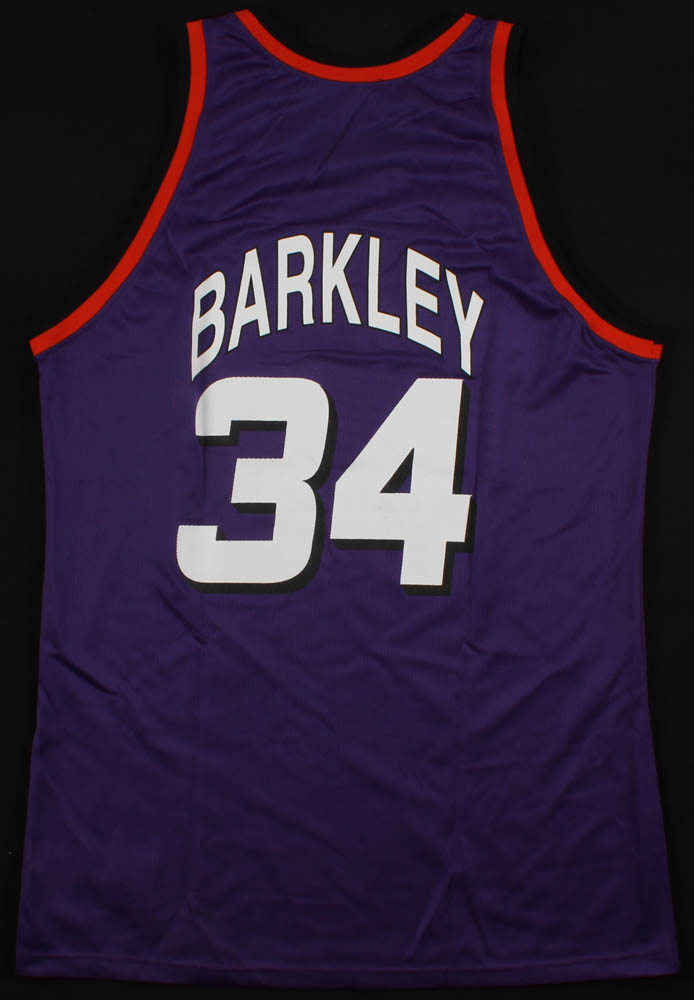 Champion on-court style jersey. Everything printed on, size 48. Hand-signed in silver paint pen by Charles Barkley (HOF).